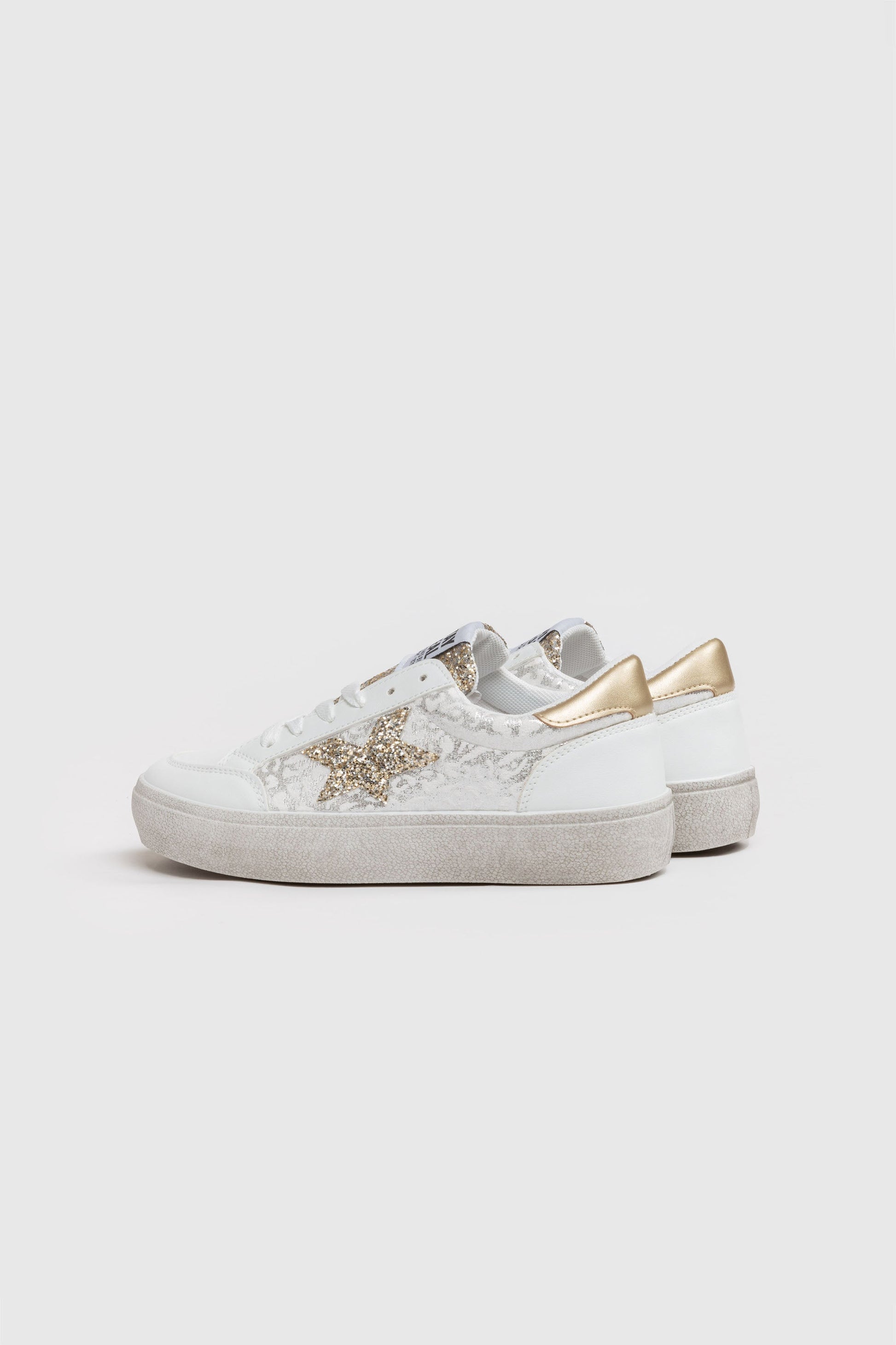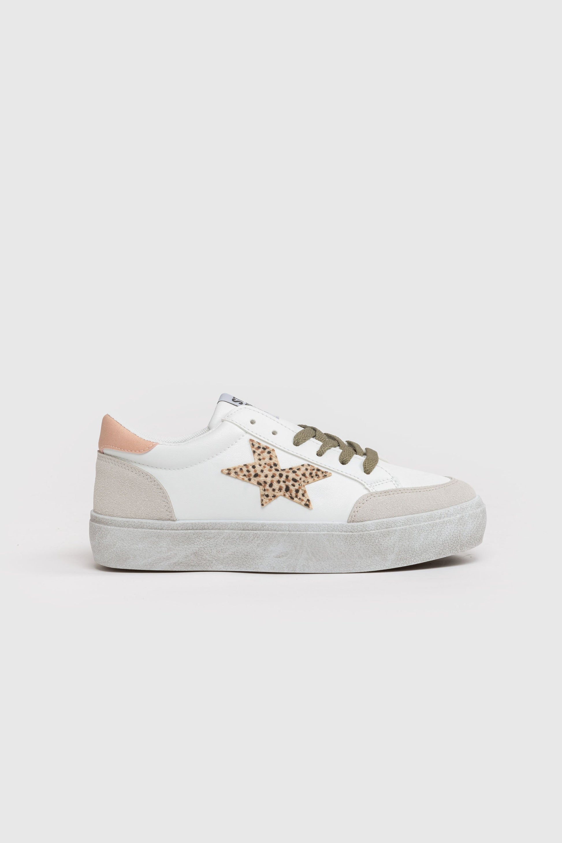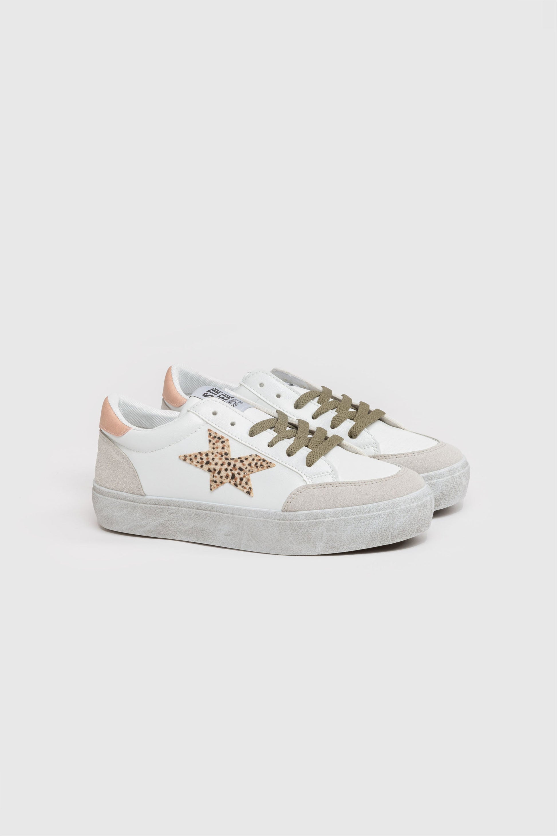 Zapato tipo deportiva. Tejido combinado. Diseño platarforma. Cierre de cordones. Suela manchada. Suela antideslizante. Estrella brillo lateral rosa. Panel trasero estampado.