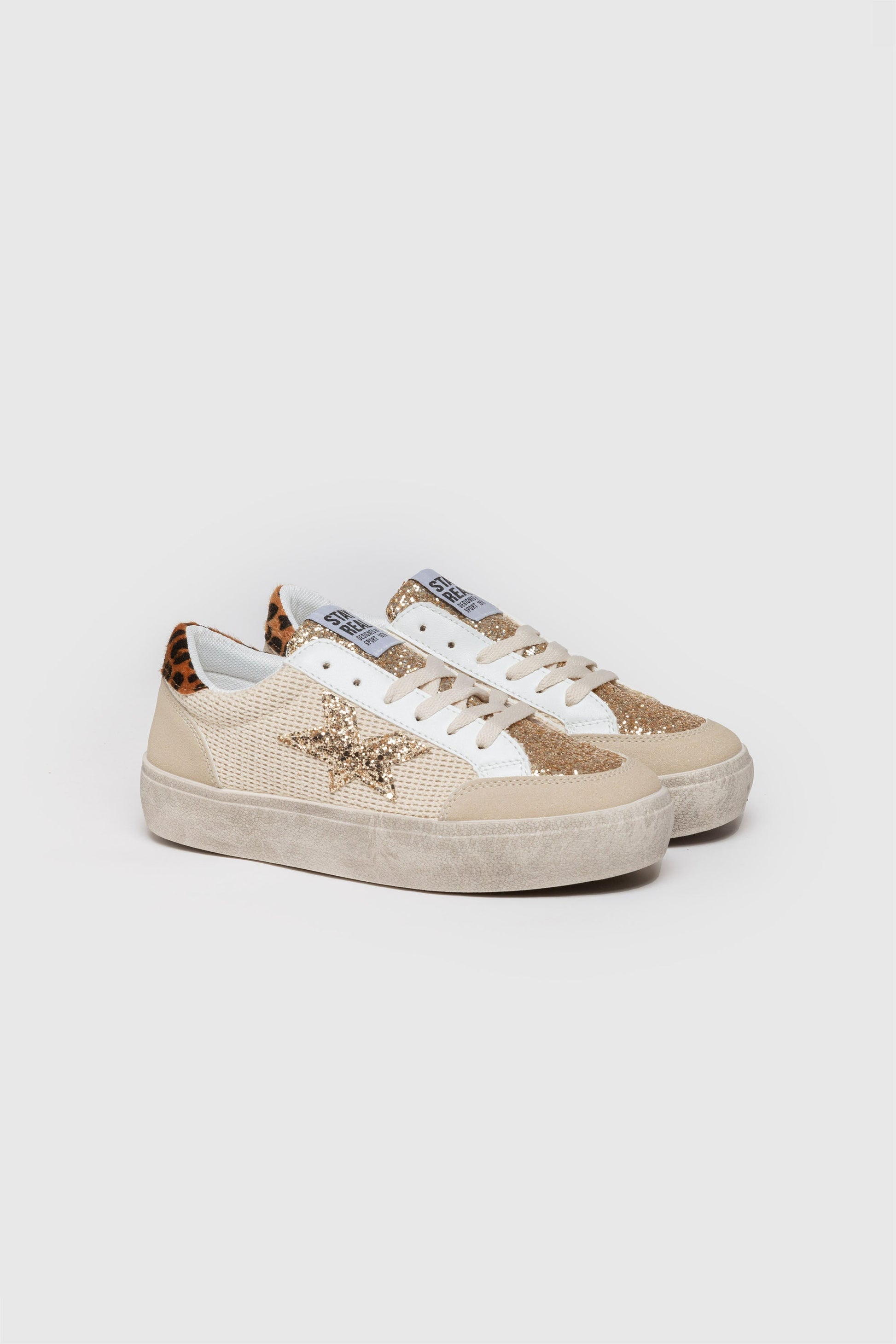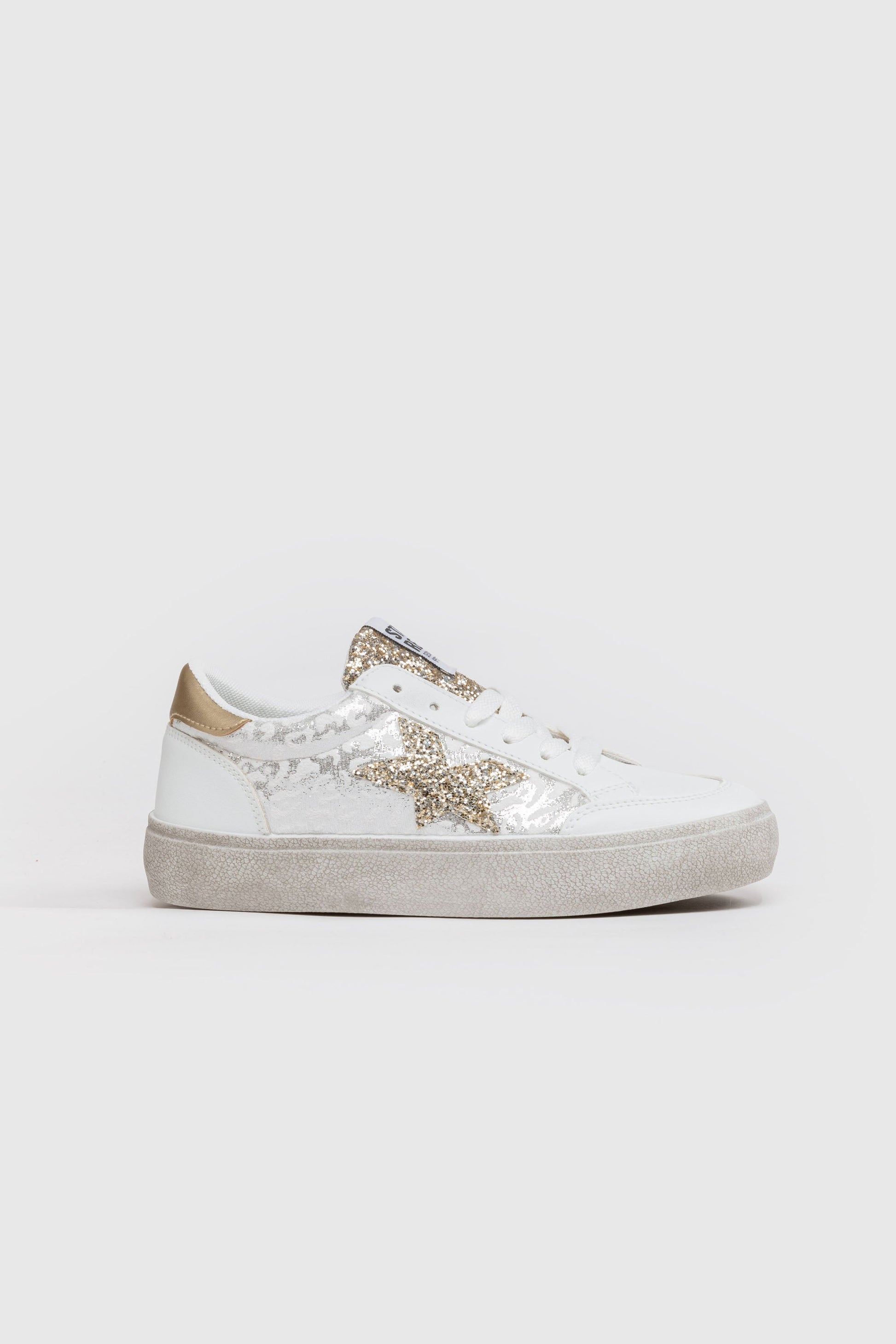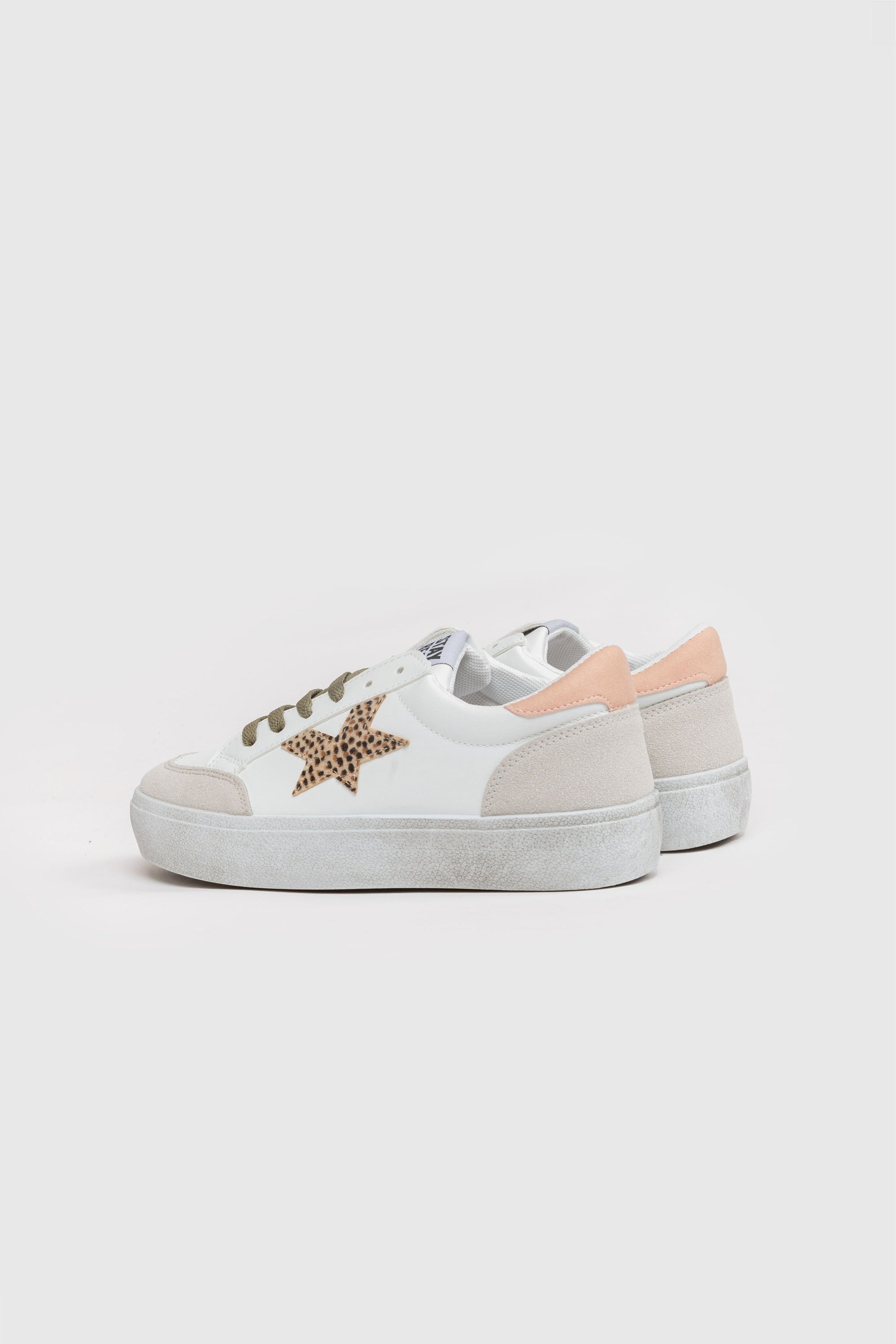 Zapato tipo deportiva. Tejido combinado. Diseño platarforma. Cierre de cordones. Suela manchada. Suela antideslizante. Estrella brillo lateral rosa. Panel trasero estampado.