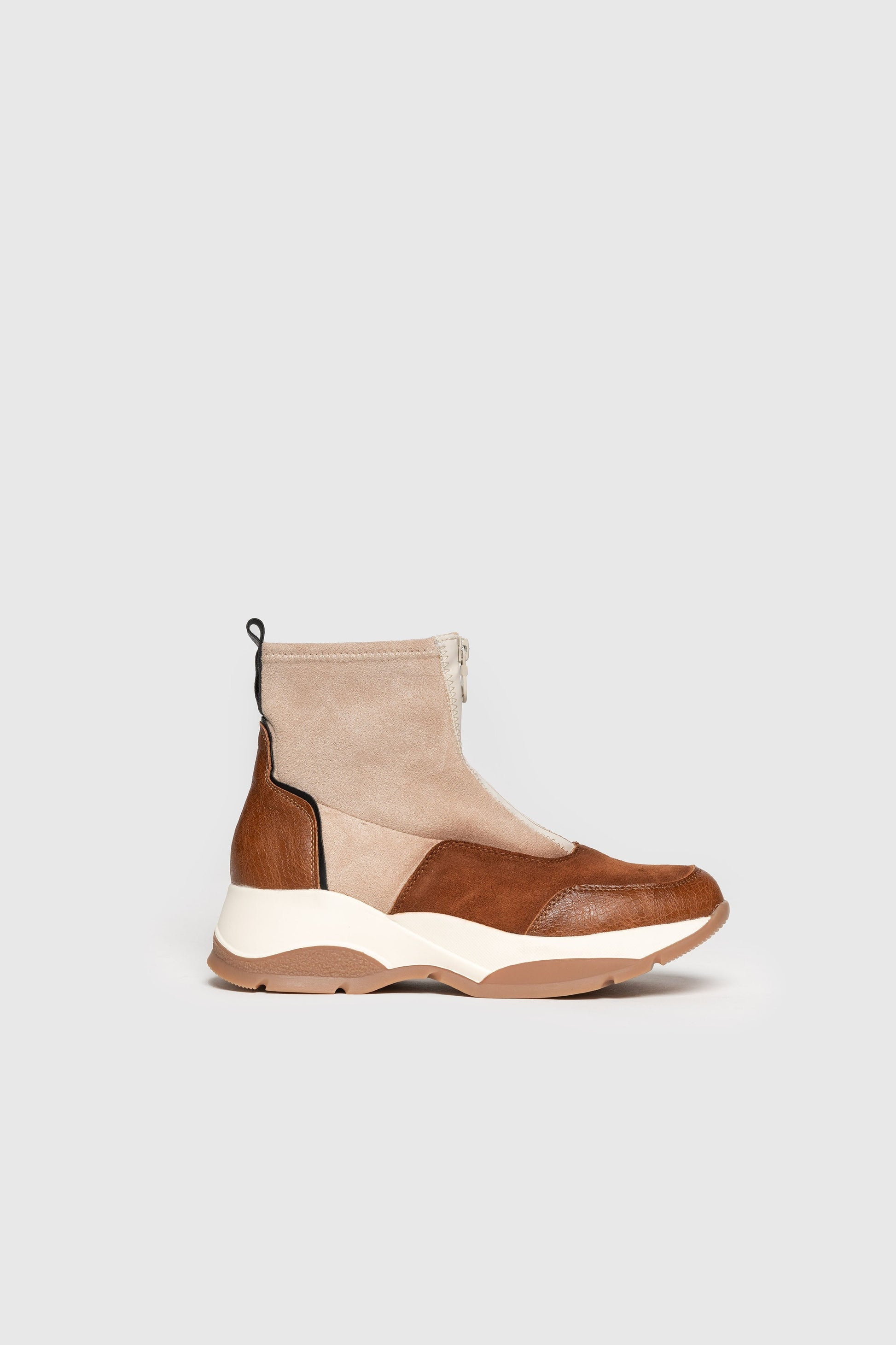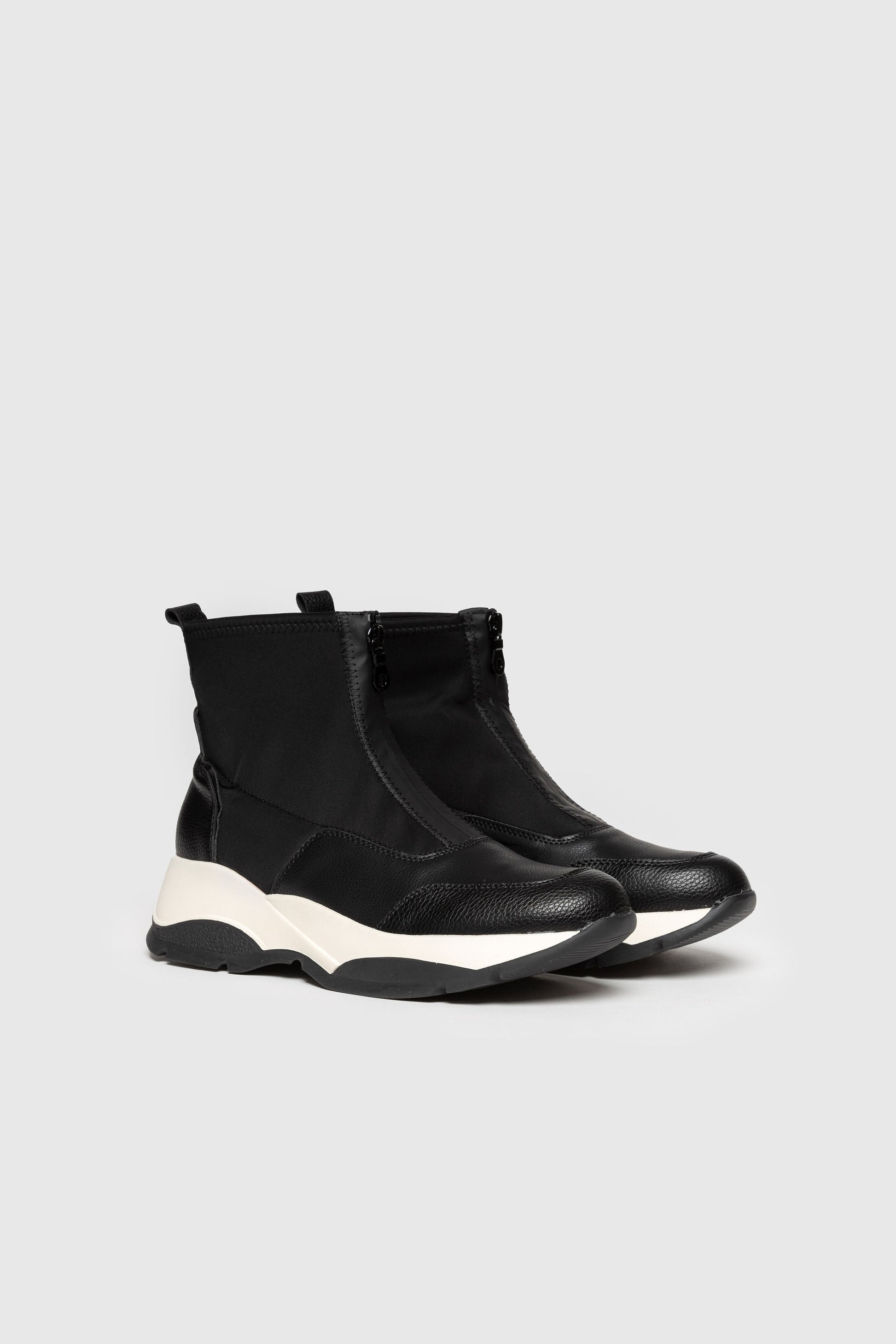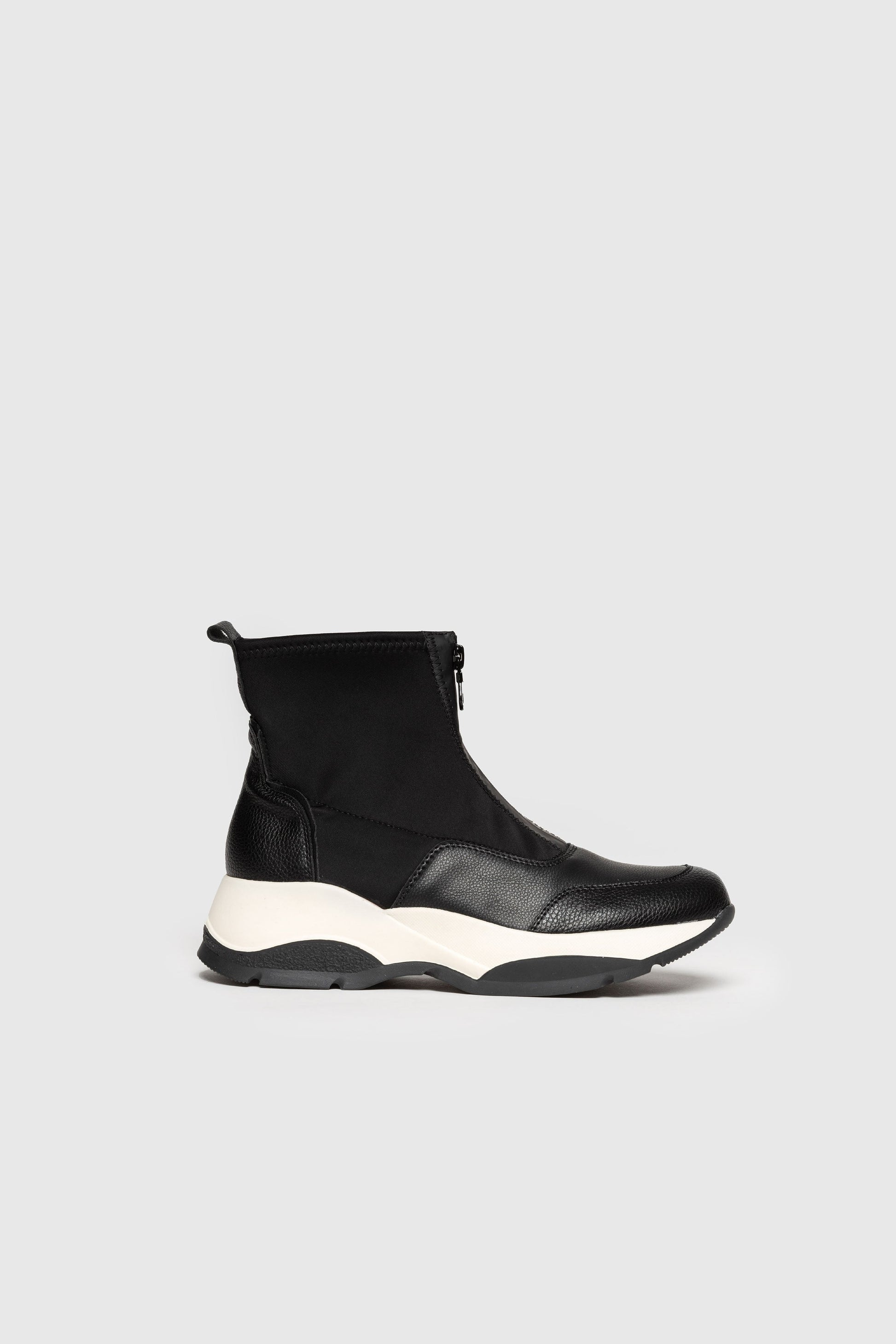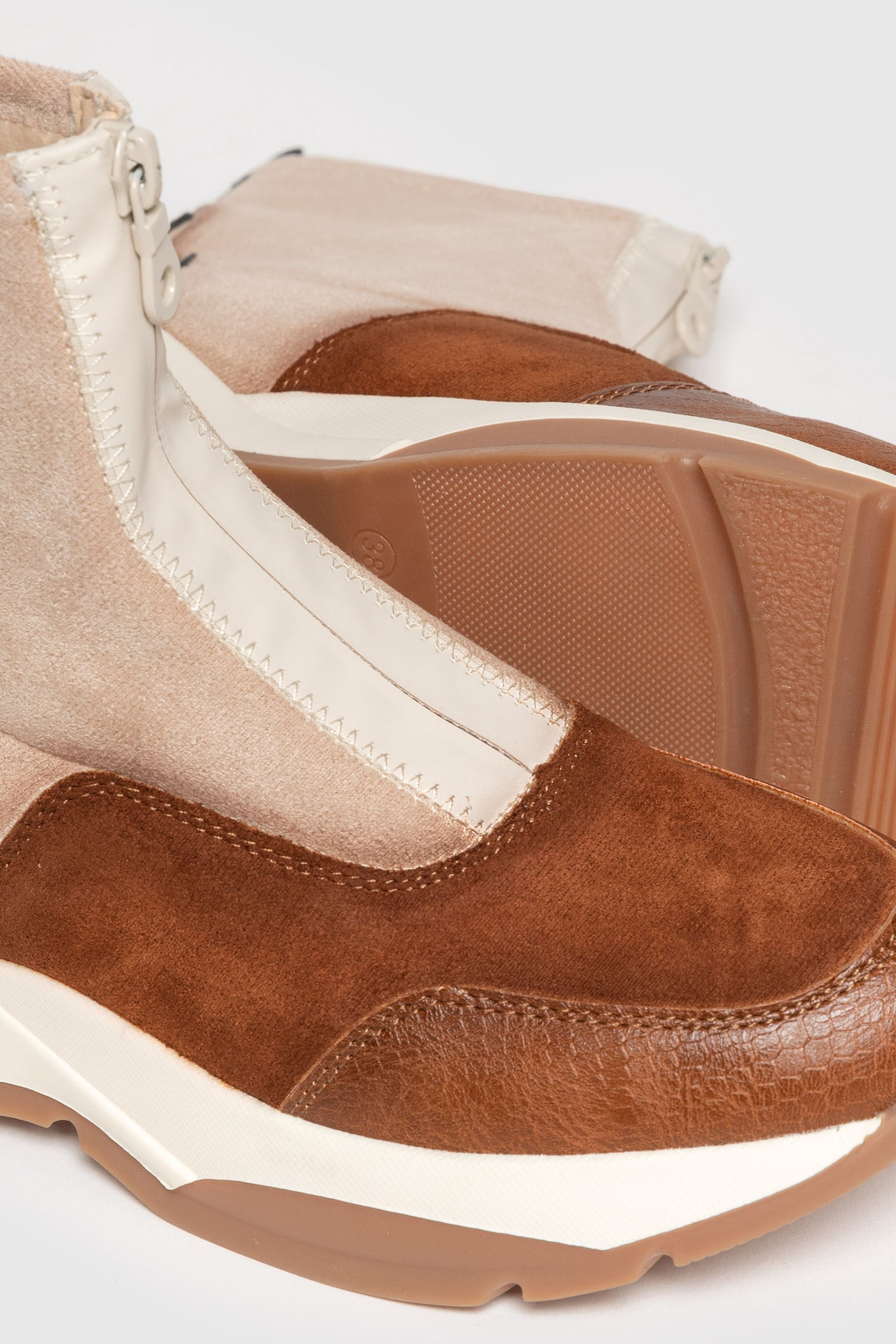 Deportivas estilo botín. Tejido antelina. Acabado redondeado. Corte ajustado. Caña baja. Plataforma sobresaliente. Suela dentada. Cierre de cremallera frontal. Tirador. Altura tacón 5.0 cm.