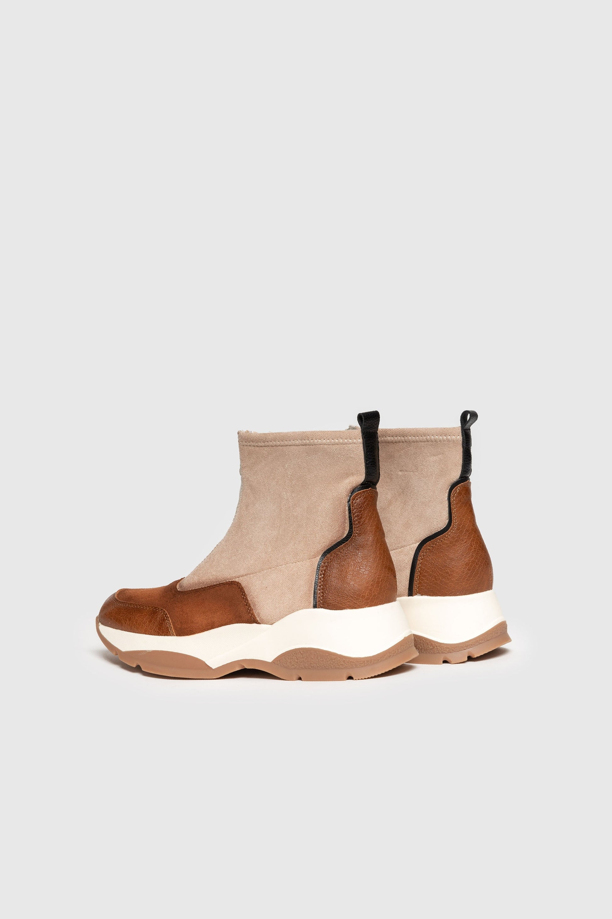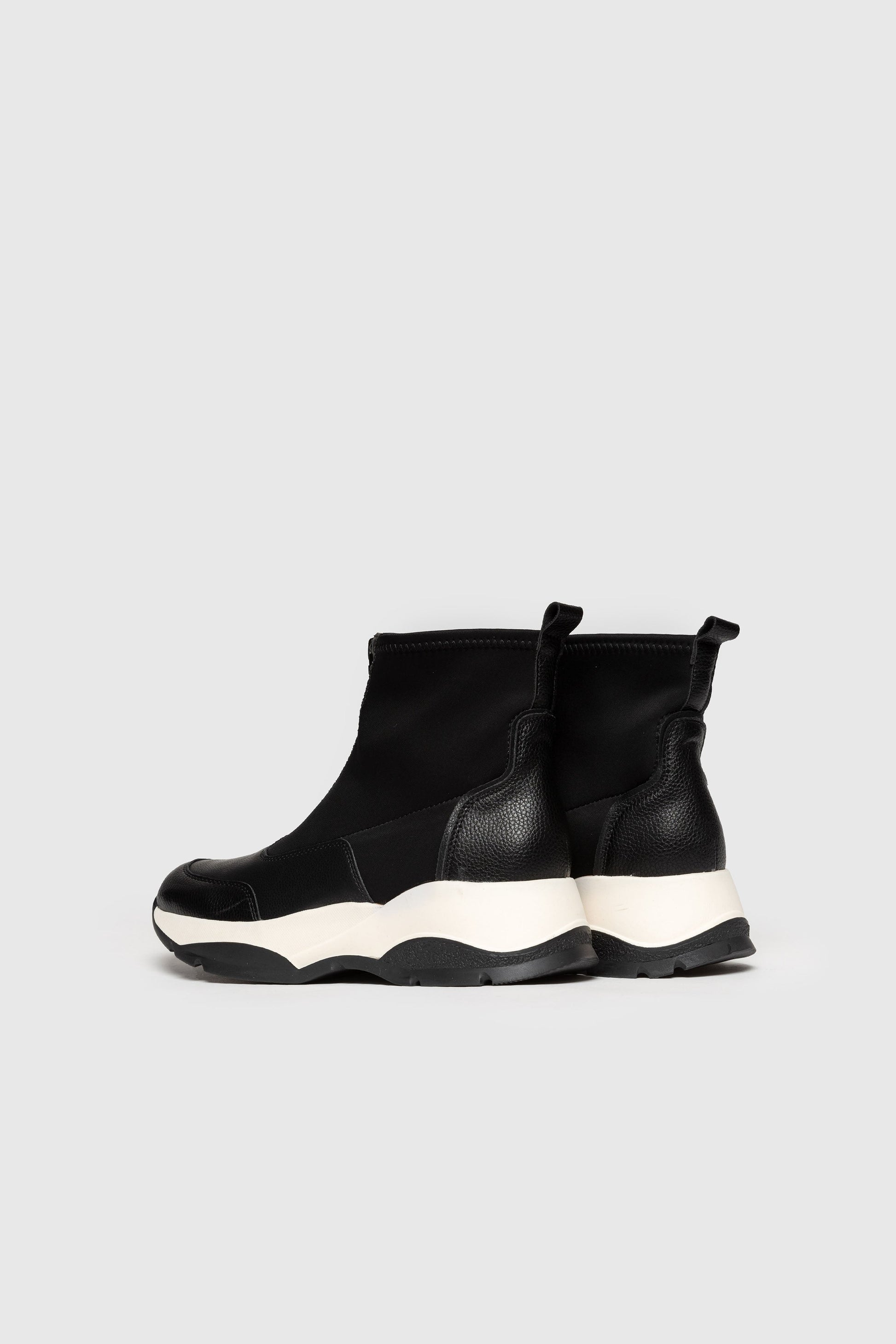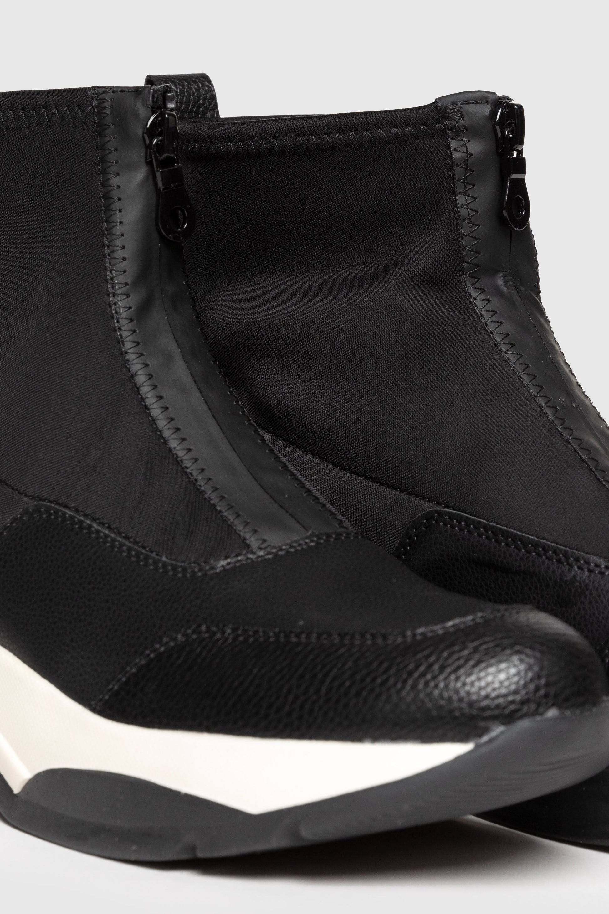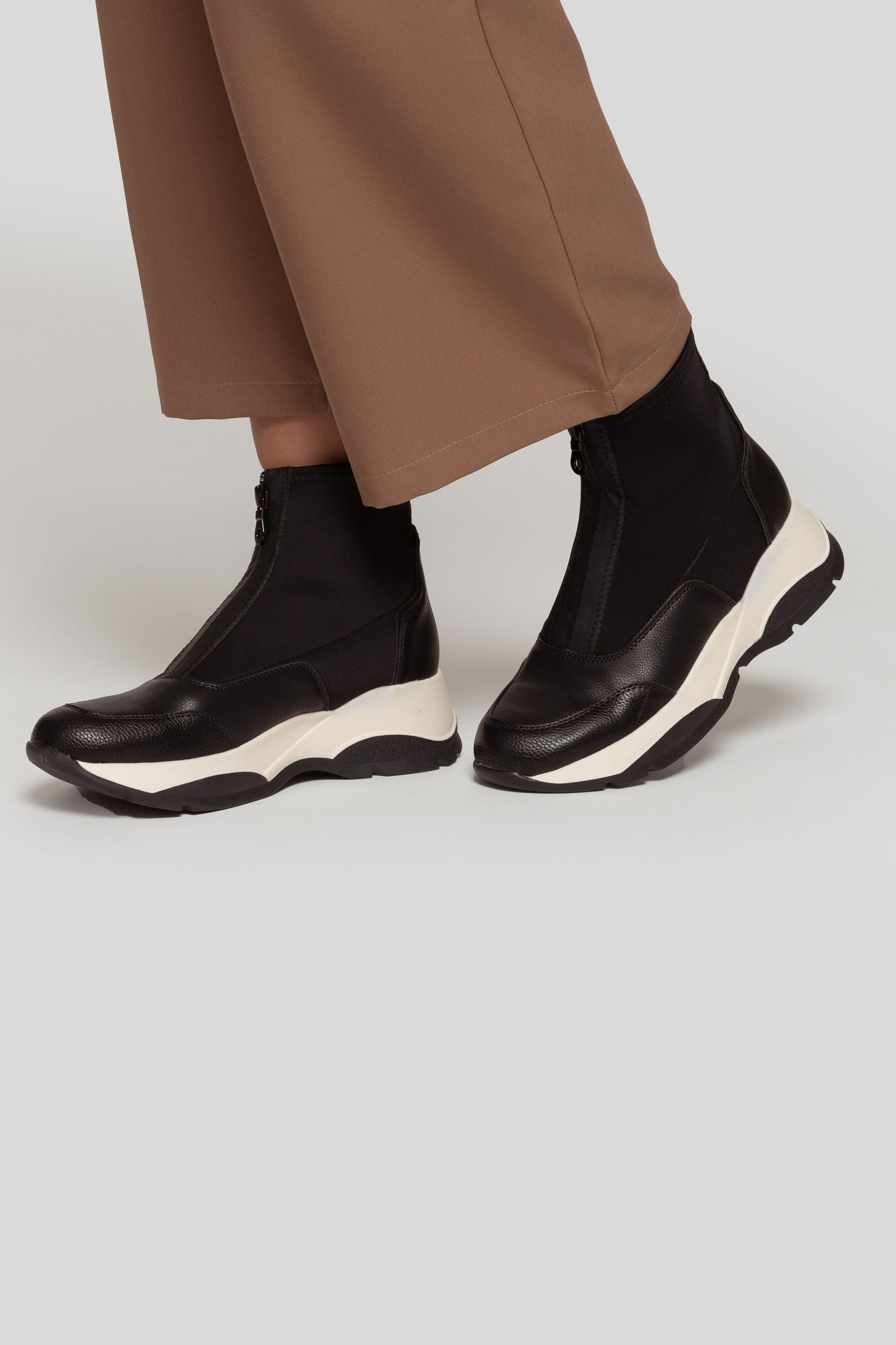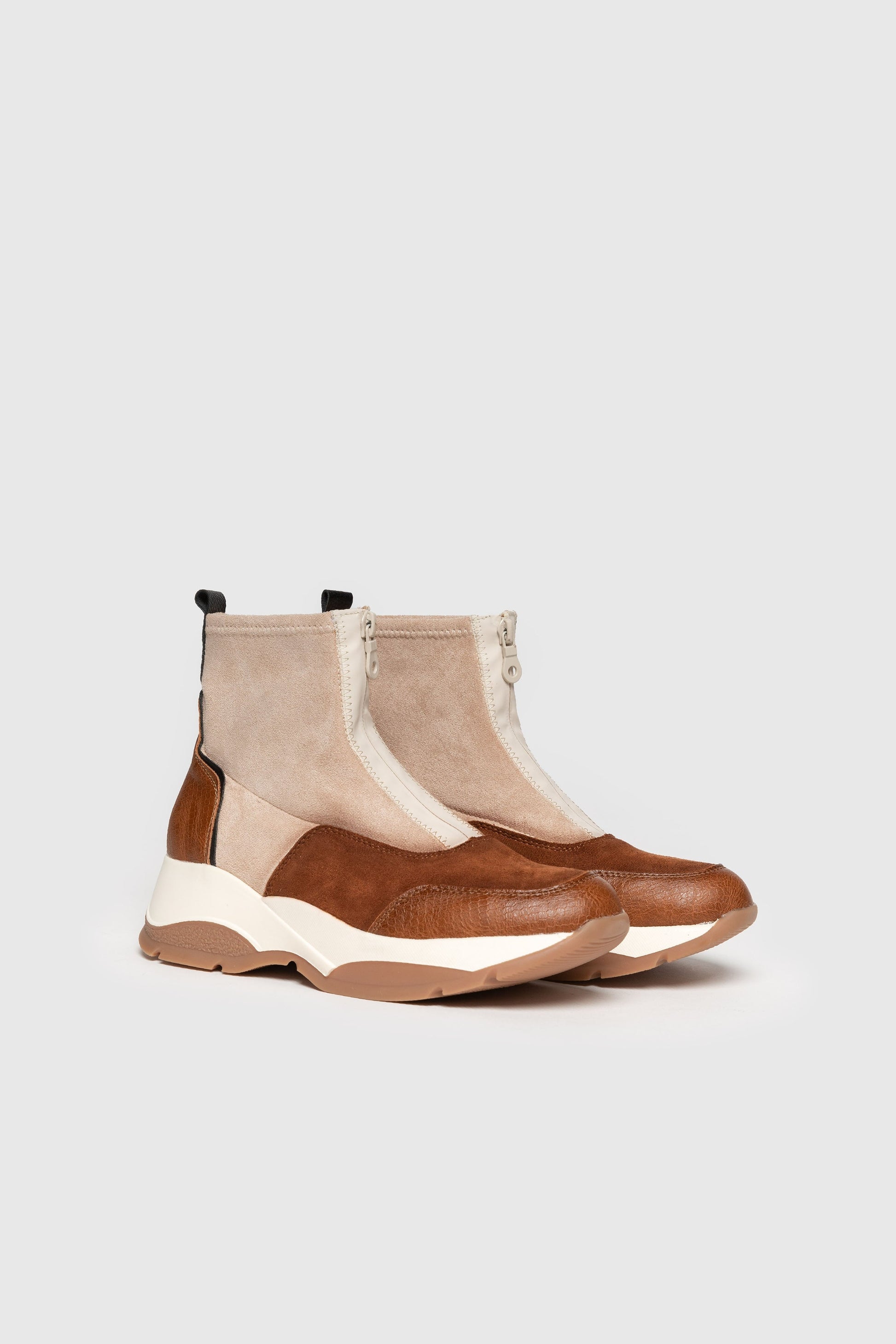 Deportivas estilo botín. Tejido antelina. Acabado redondeado. Corte ajustado. Caña baja. Plataforma sobresaliente. Suela dentada. Cierre de cremallera frontal. Tirador. Altura tacón 5.0 cm.