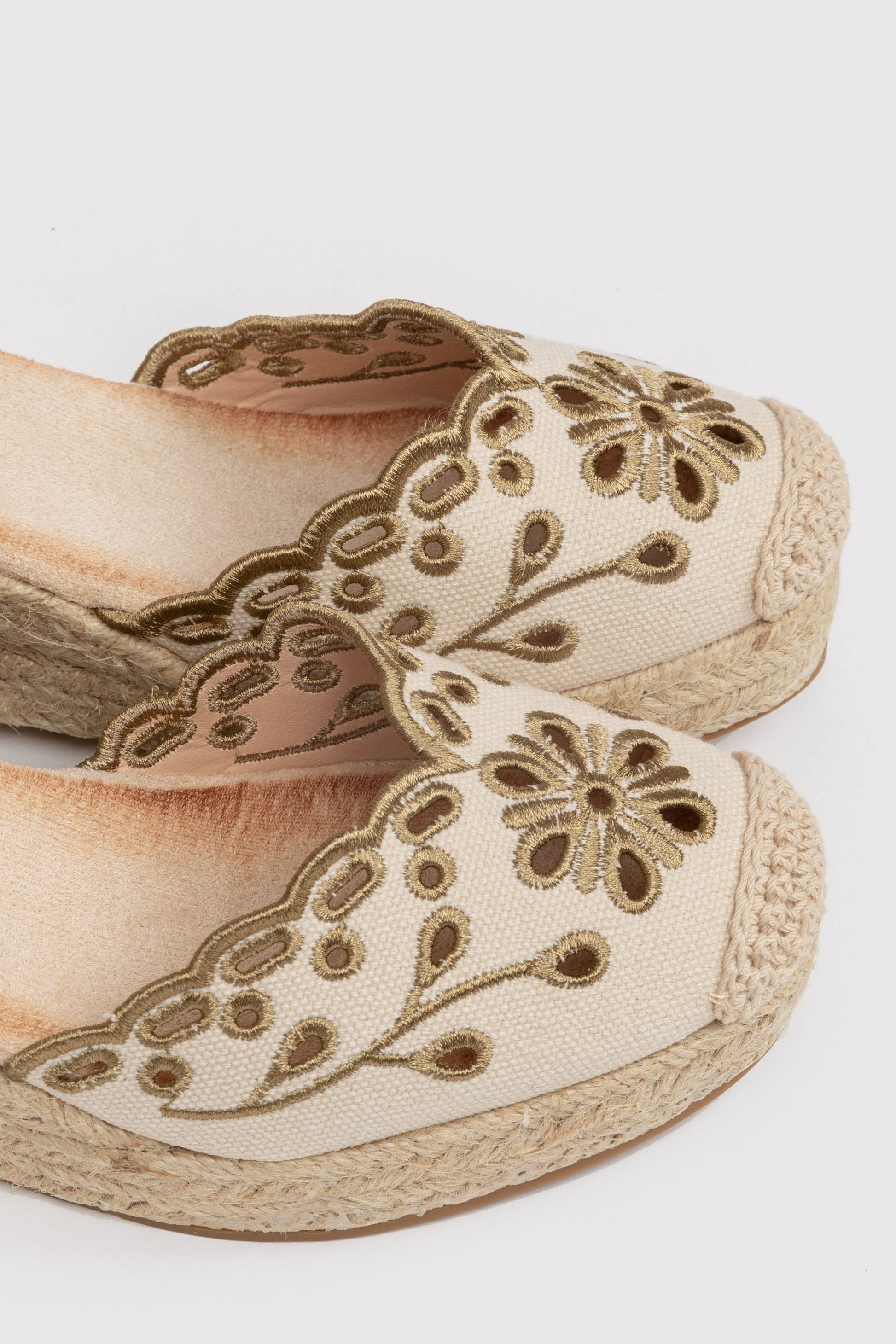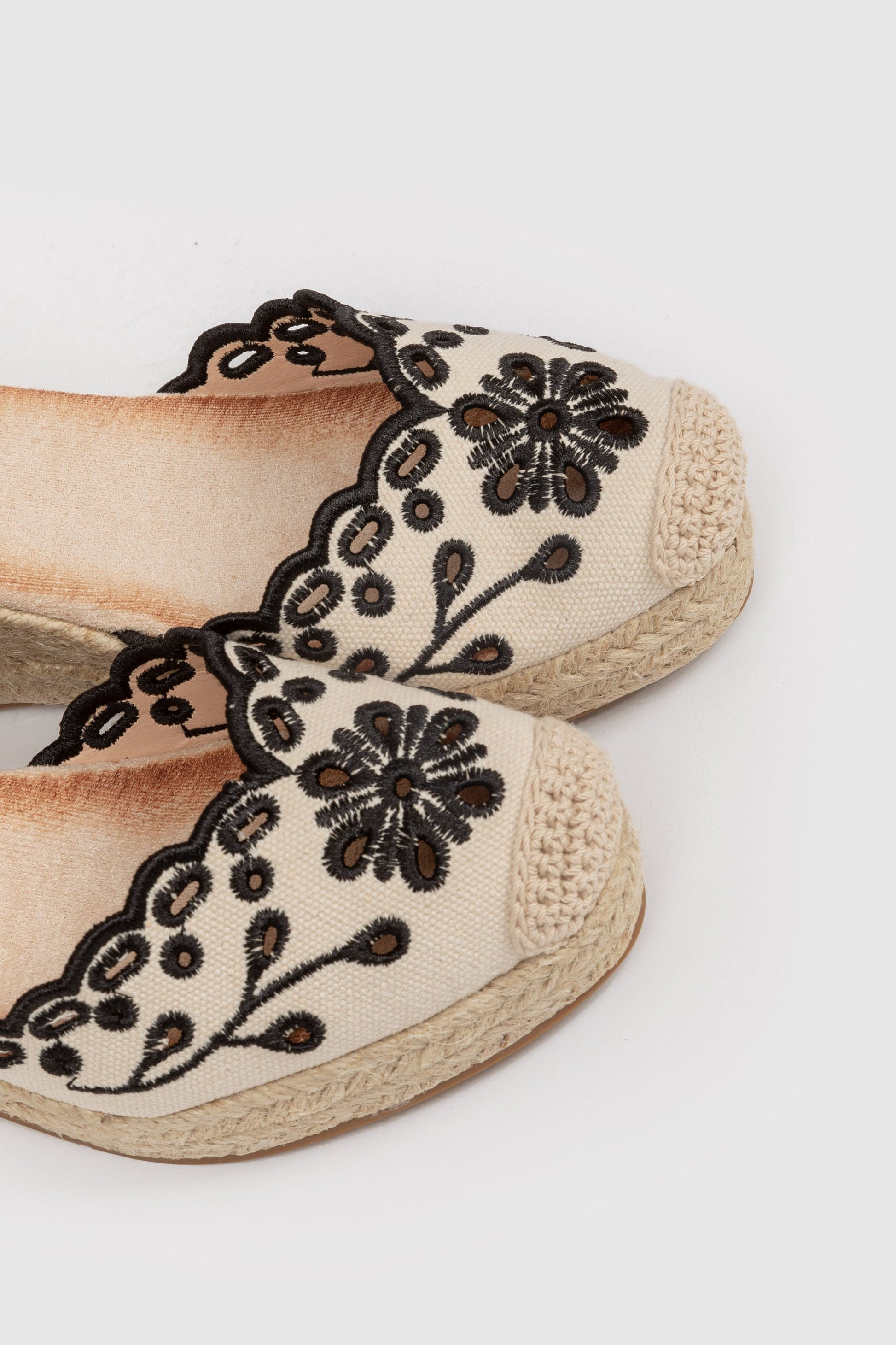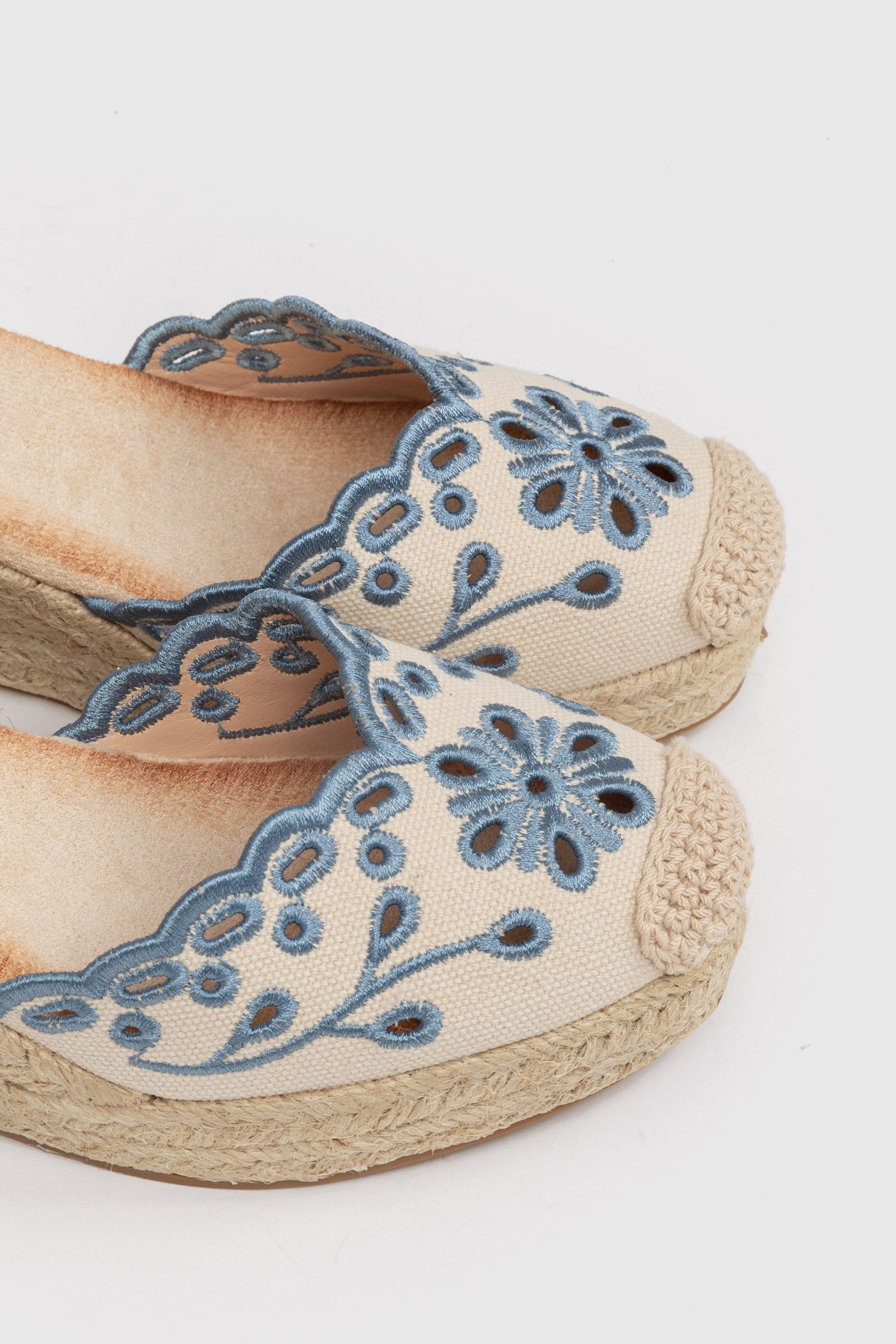 Sandalia cuña. Tejido combinado. Diseño festoneado. Diseño flor. Punta redondeada. Cuña de esparto. Cierre de hebilla. Atada al tobillo. Suela de contacto antideslizante. Altura cuña: 8.0 cm.