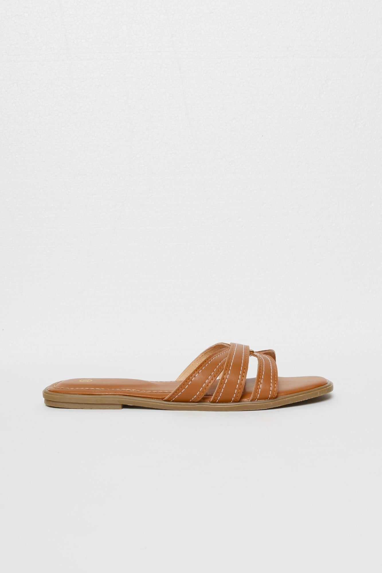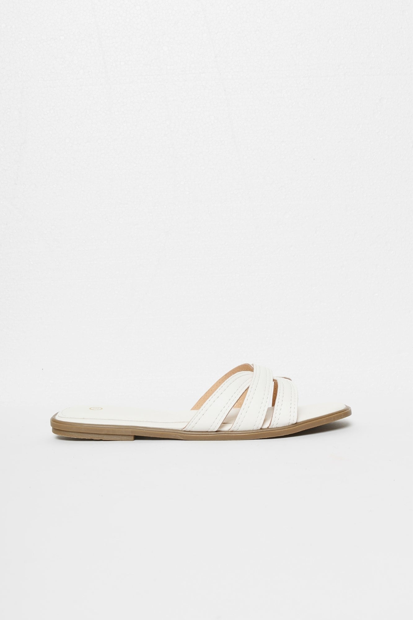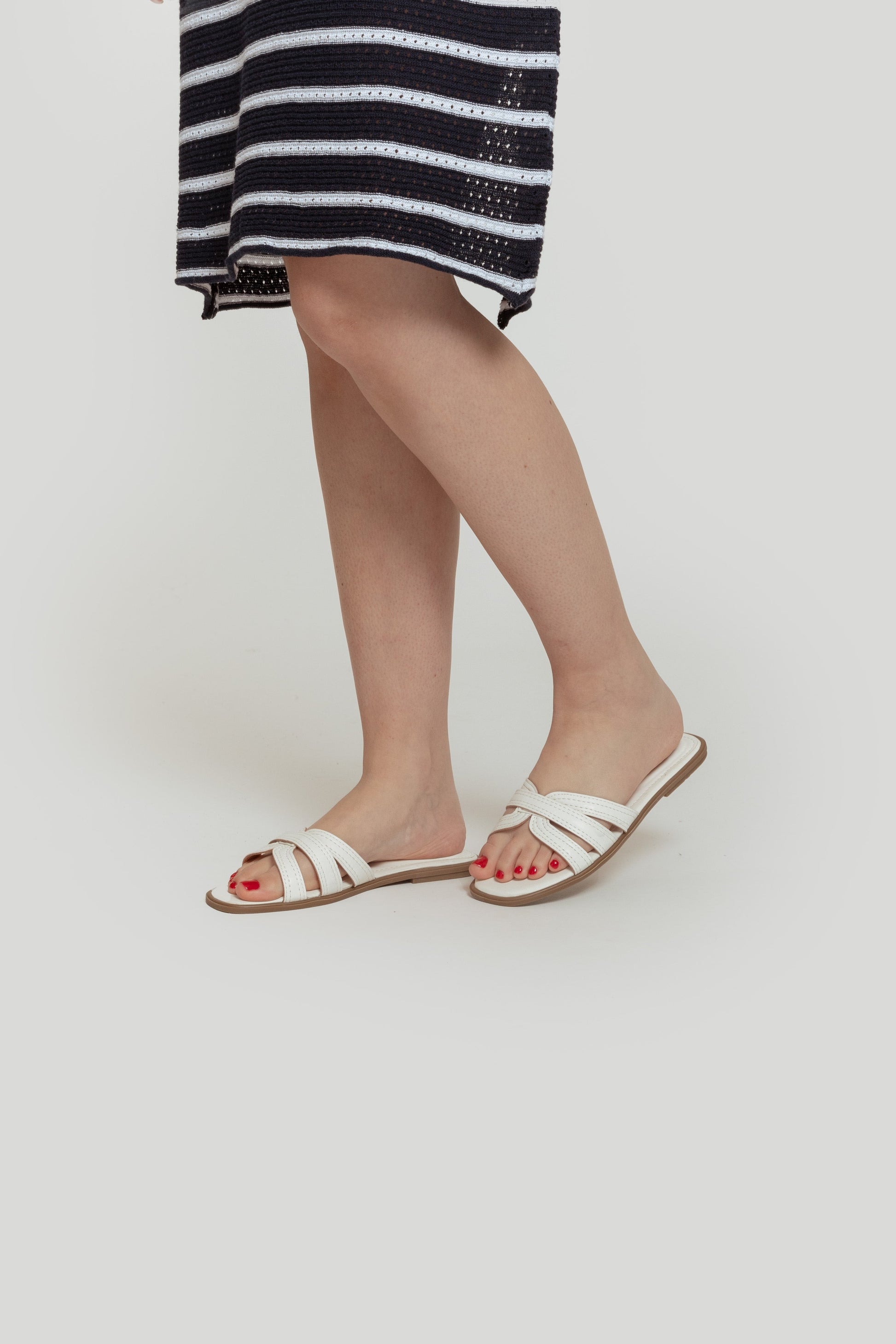 Sandalia plana. Tejido efecto piel. Diseño abierto. Diseño cruzado. Punta cuadrada. Costuras visibles. Suela antideslizante. Medida cuña: 1.0 cm.