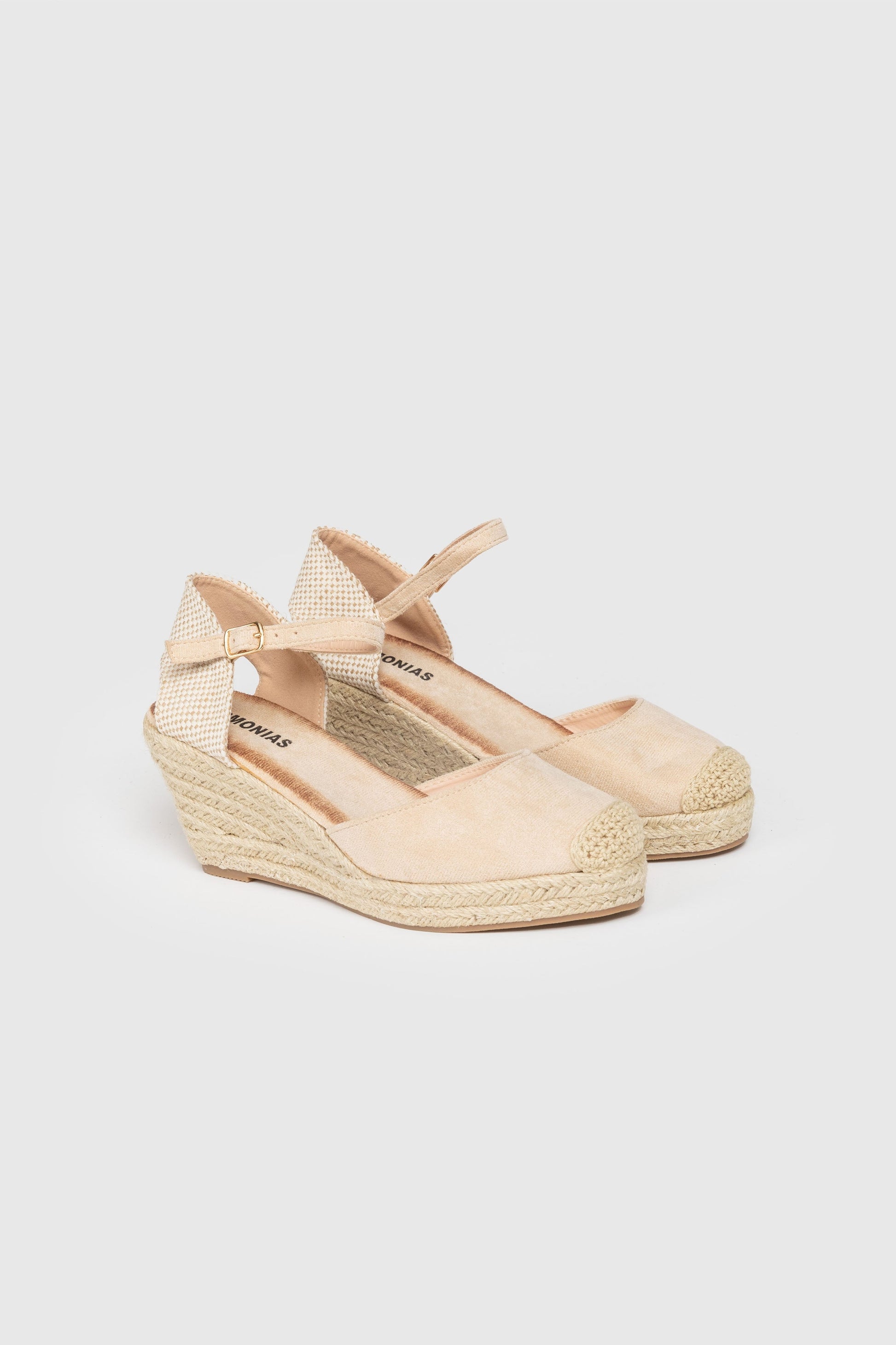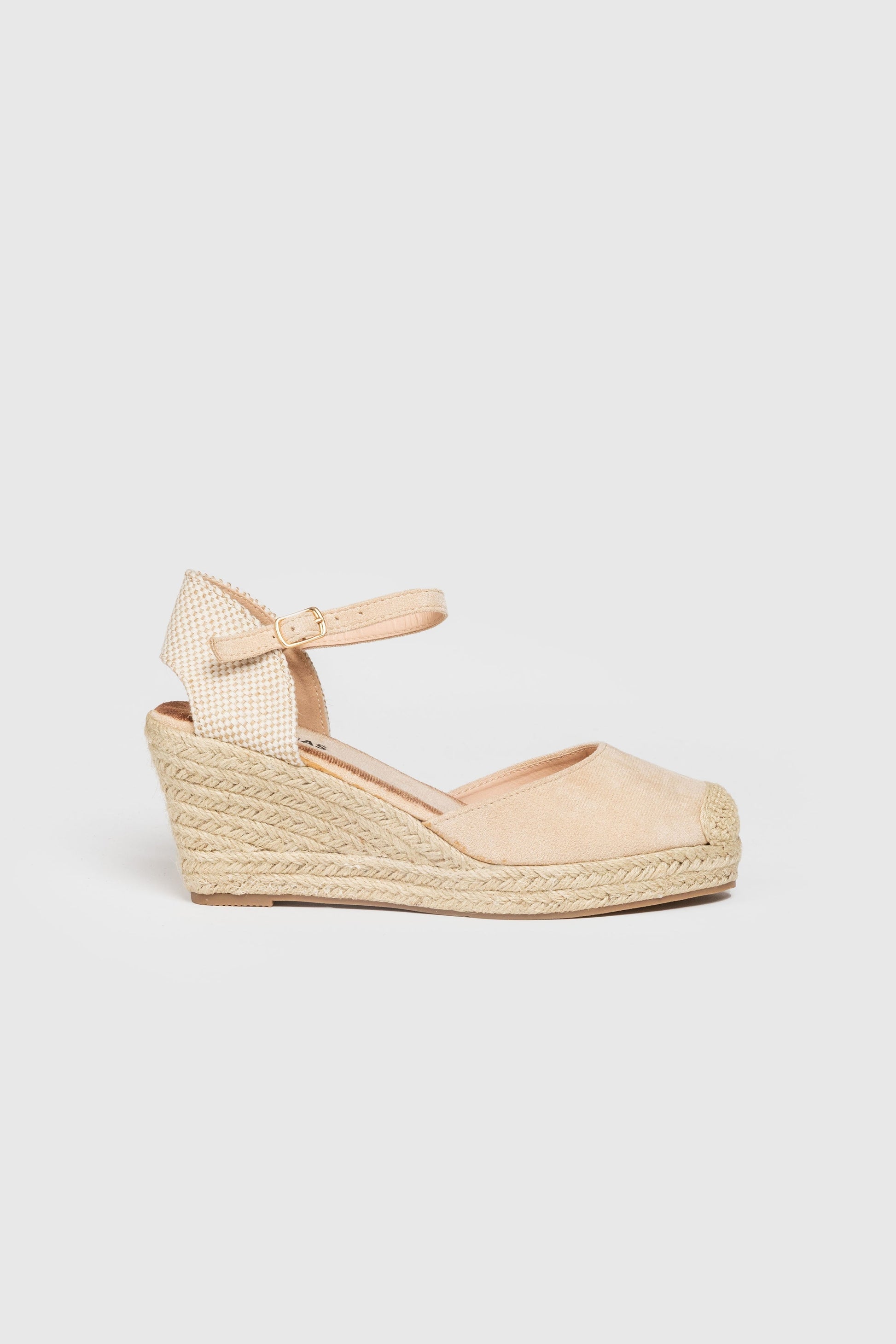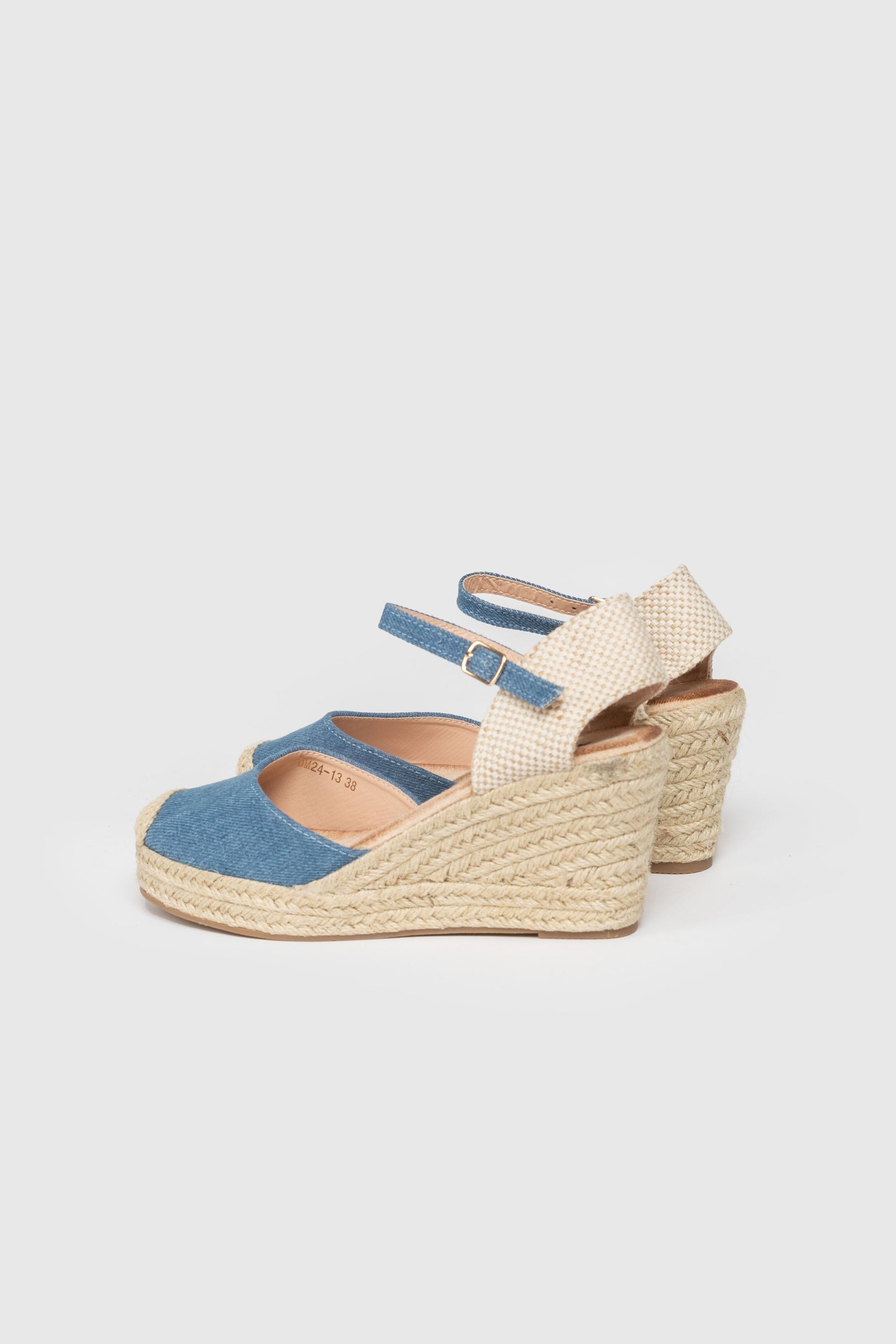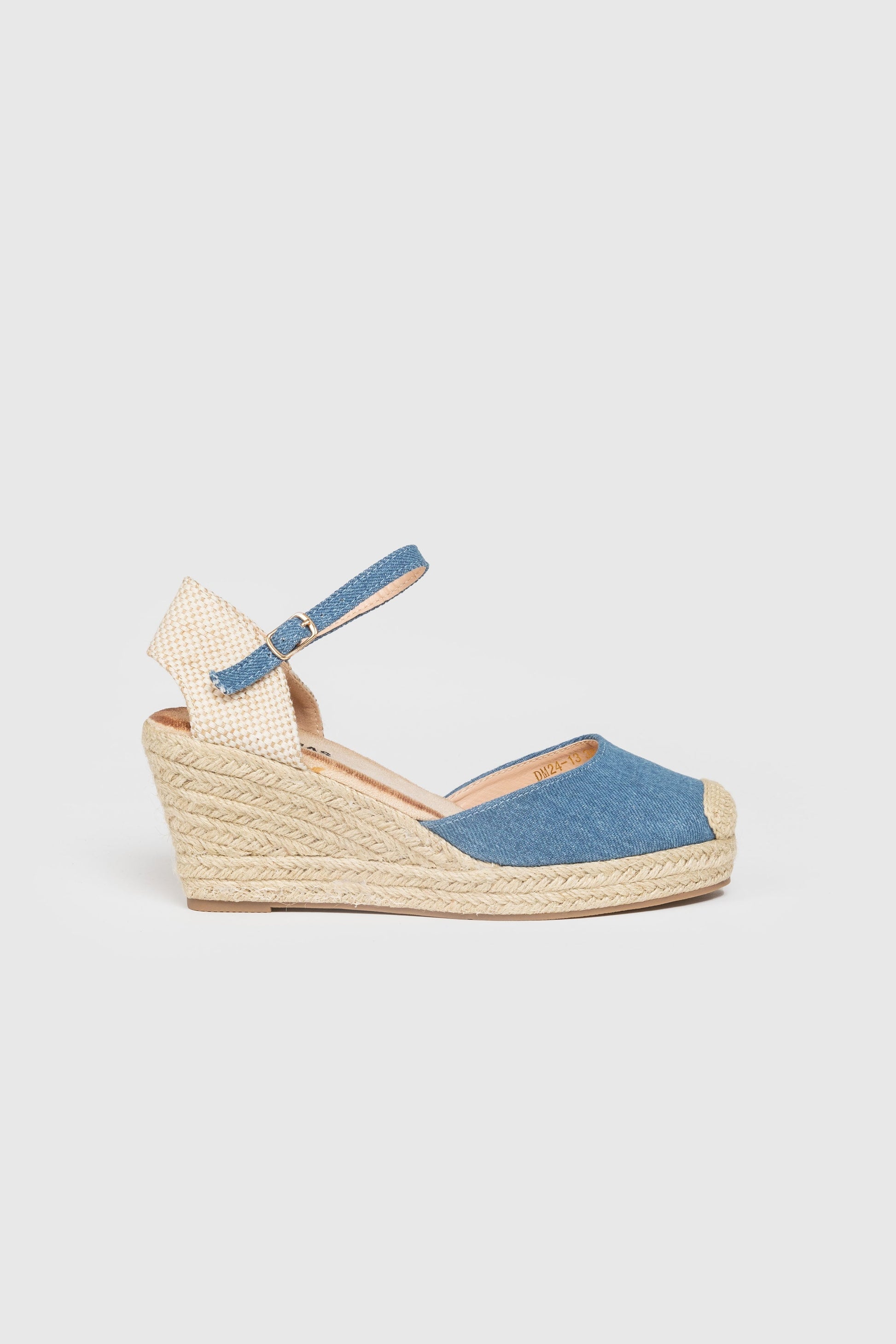 Sandalia cuña. Tejido combinado. Punta redondeada. Cuña de esparto. Cierre de hebilla. Atada al tobillo. Suela de contacto antideslizante. Altura cuña: 8.0 cm.