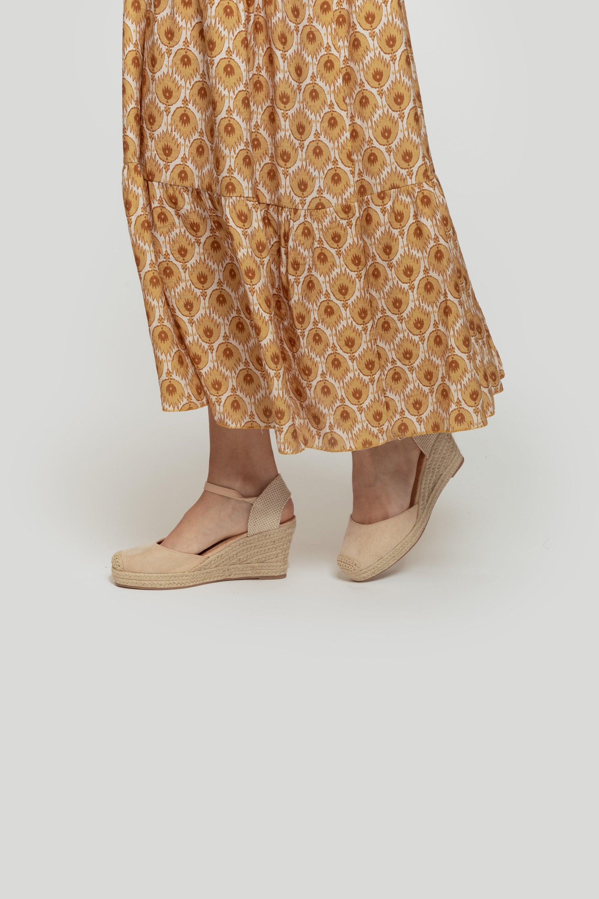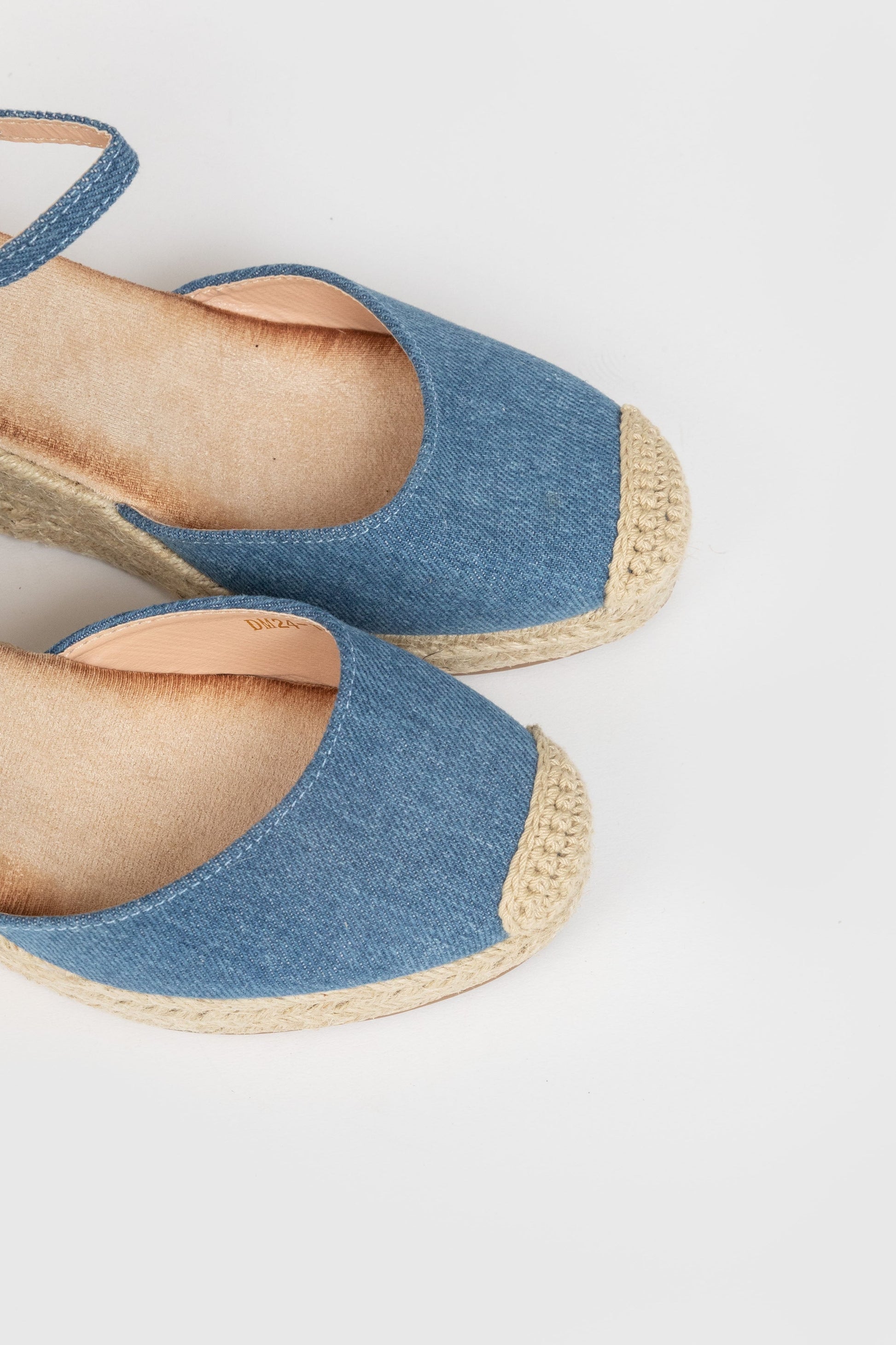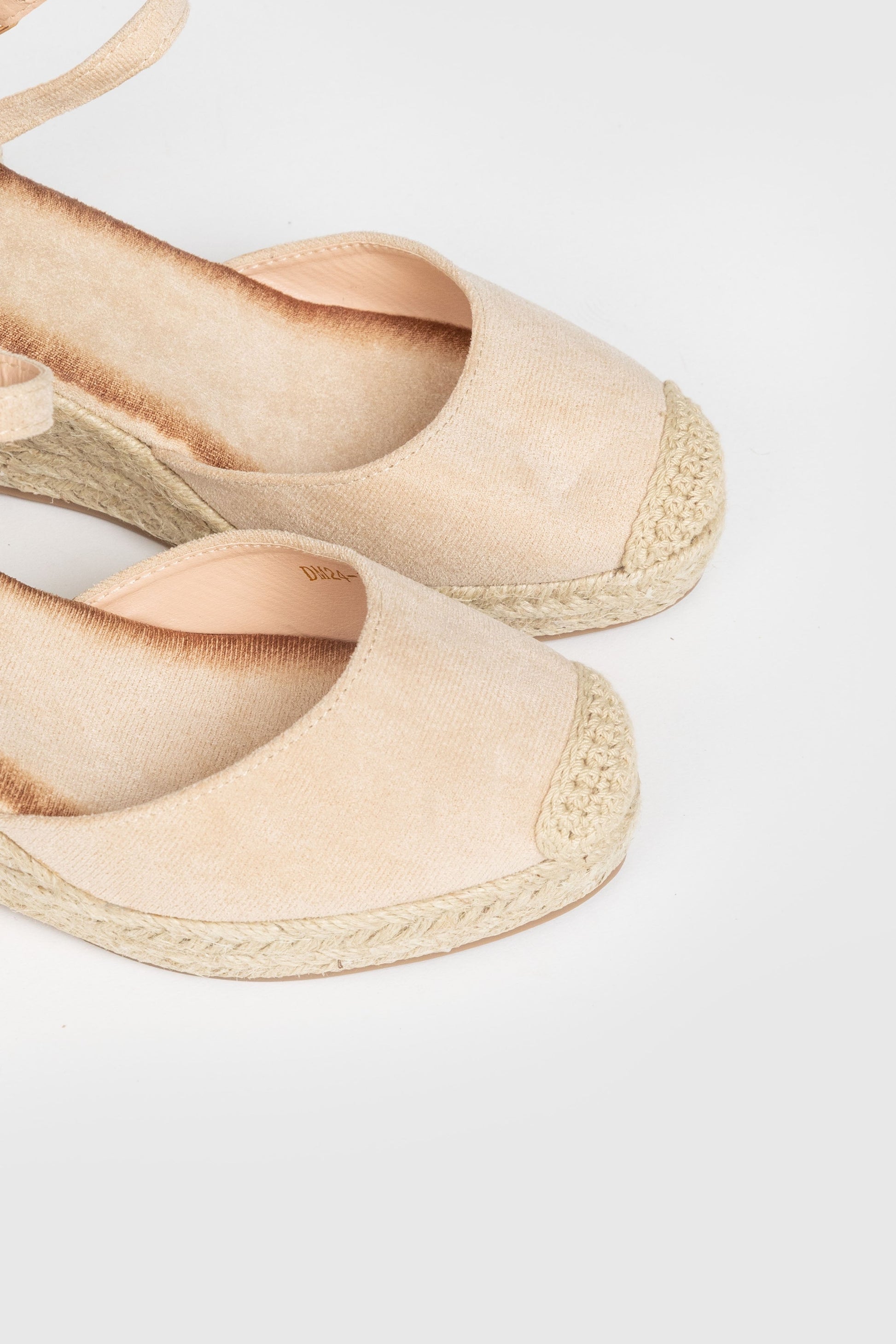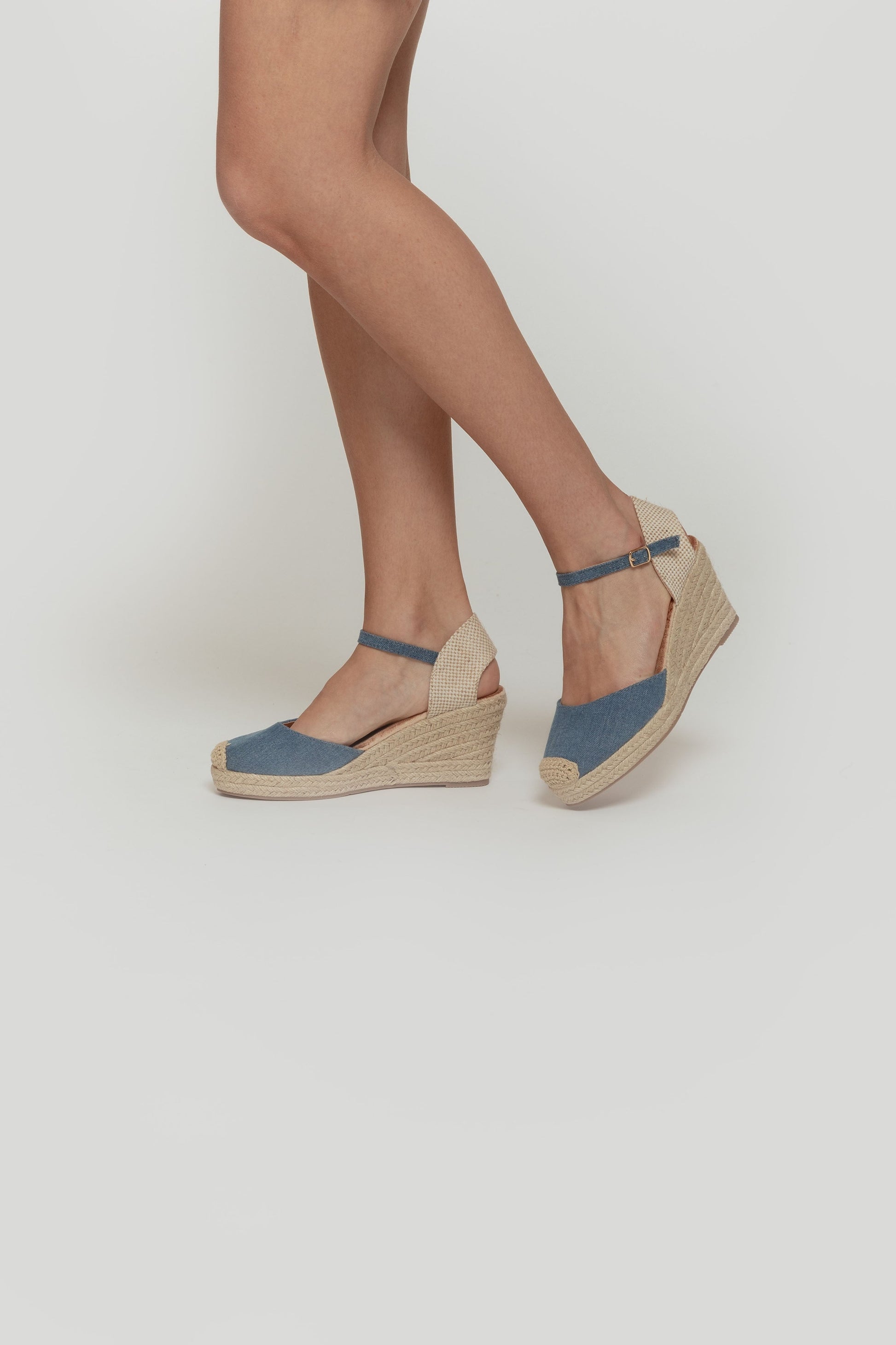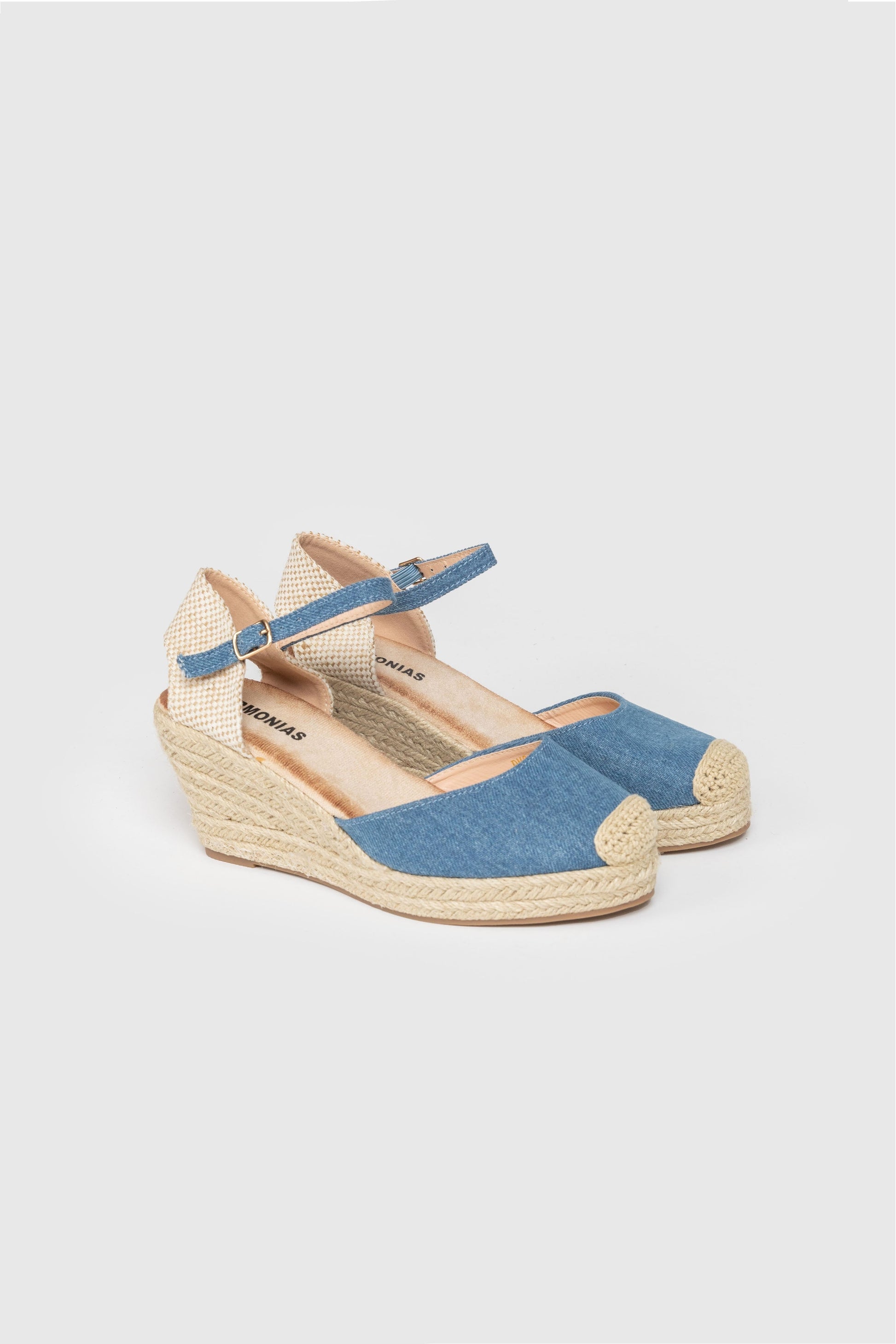 Sandalia cuña. Tejido combinado. Punta redondeada. Cuña de esparto. Cierre de hebilla. Atada al tobillo. Suela de contacto antideslizante. Altura cuña: 8.0 cm.