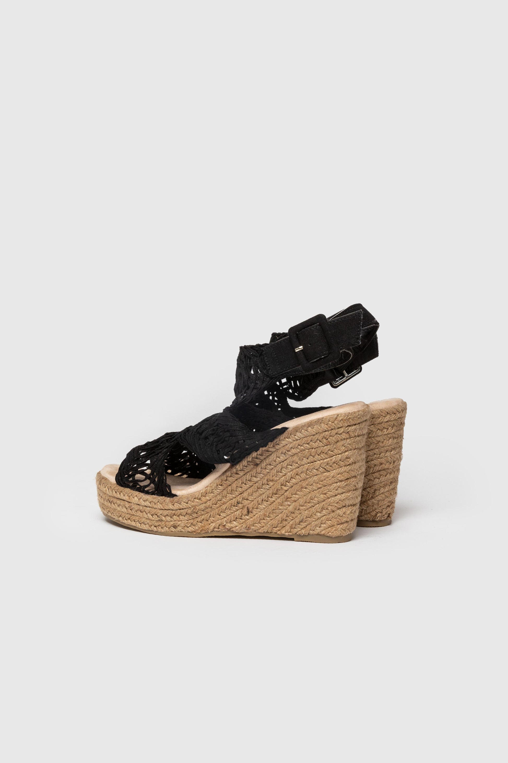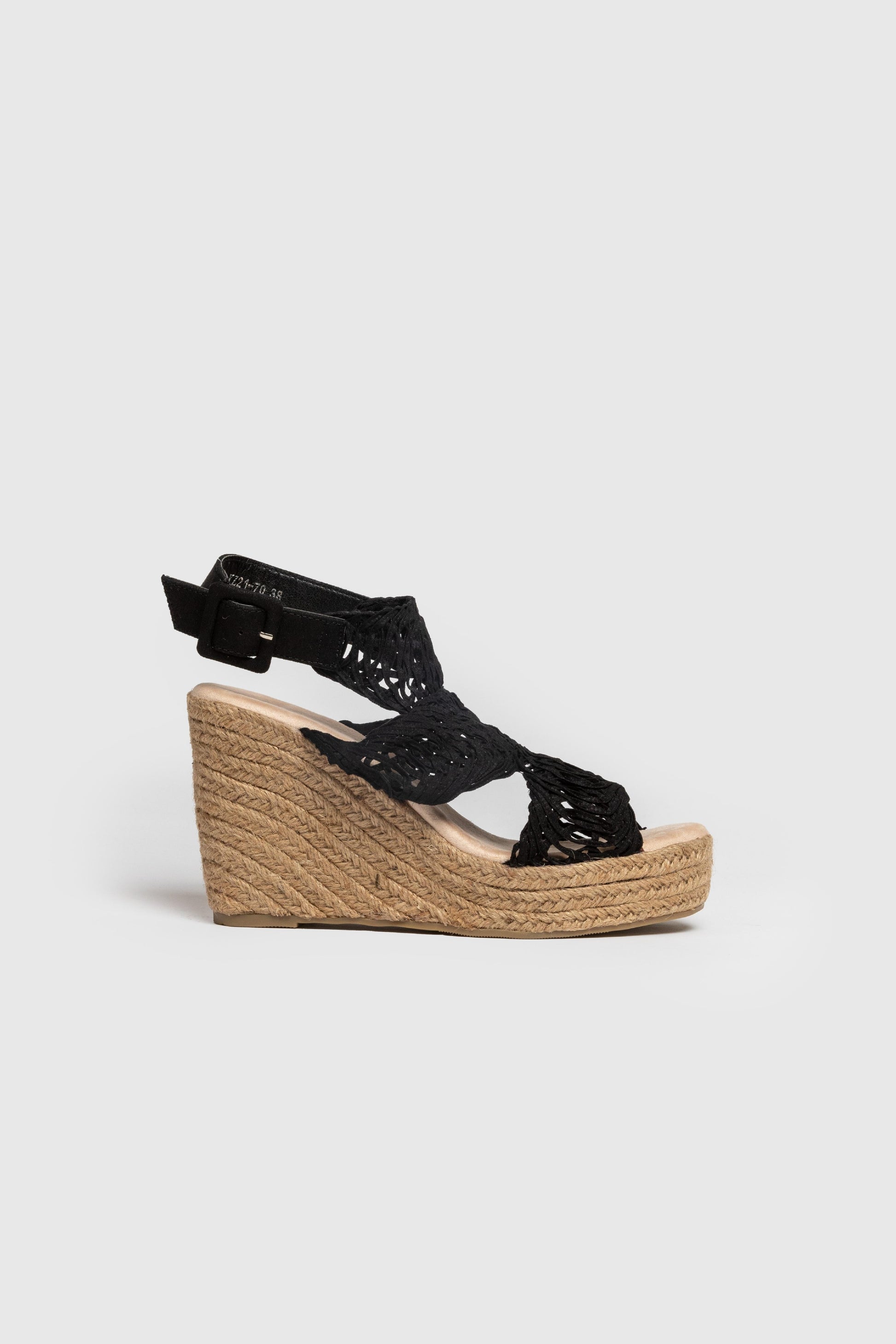 Sandalia cuña. Tejido combinado. Tiras fibras sintéticas. Cuña esparto. Punta redondeada. Diseño multi-tiras.Destalonadas. Cierre de hebilla. Altura tacón: 10.0 cm Selecciona tu talla habitual.