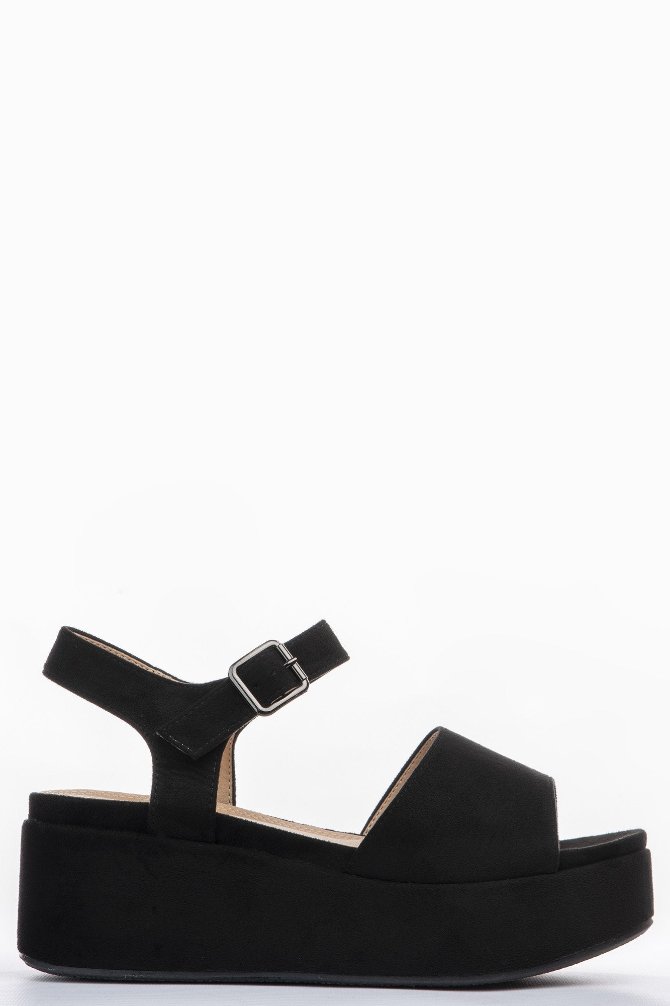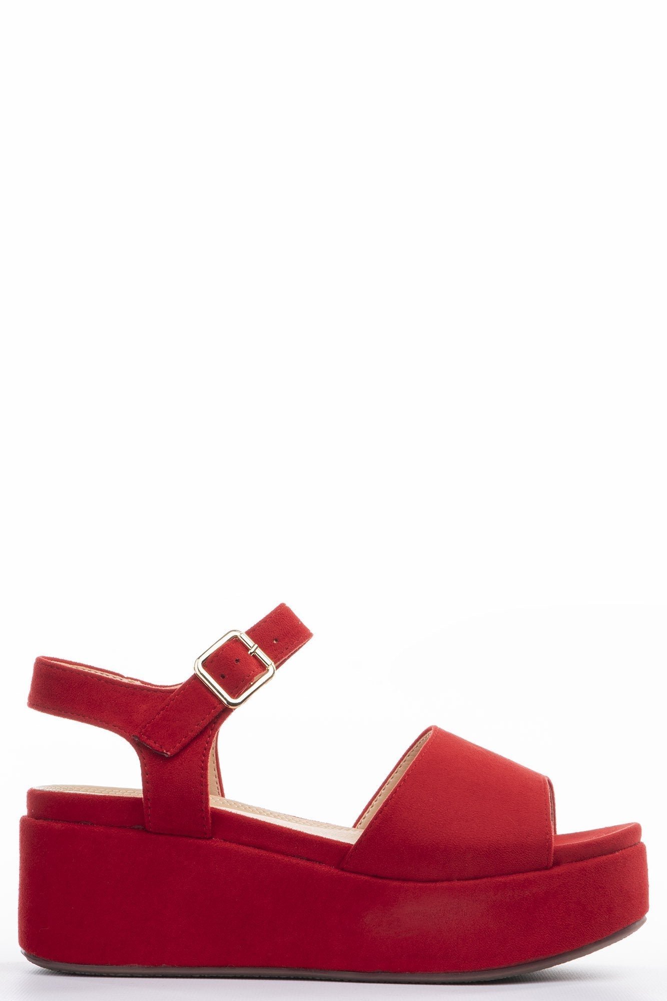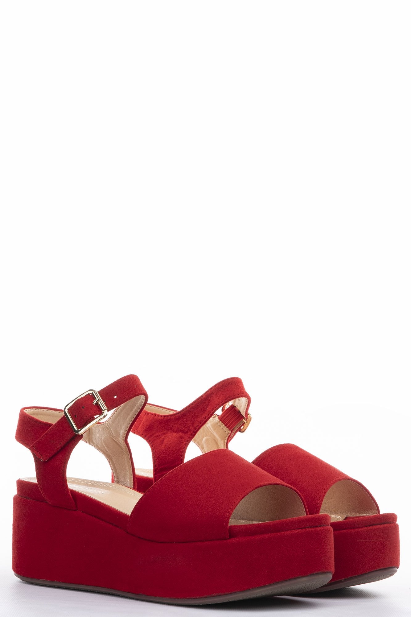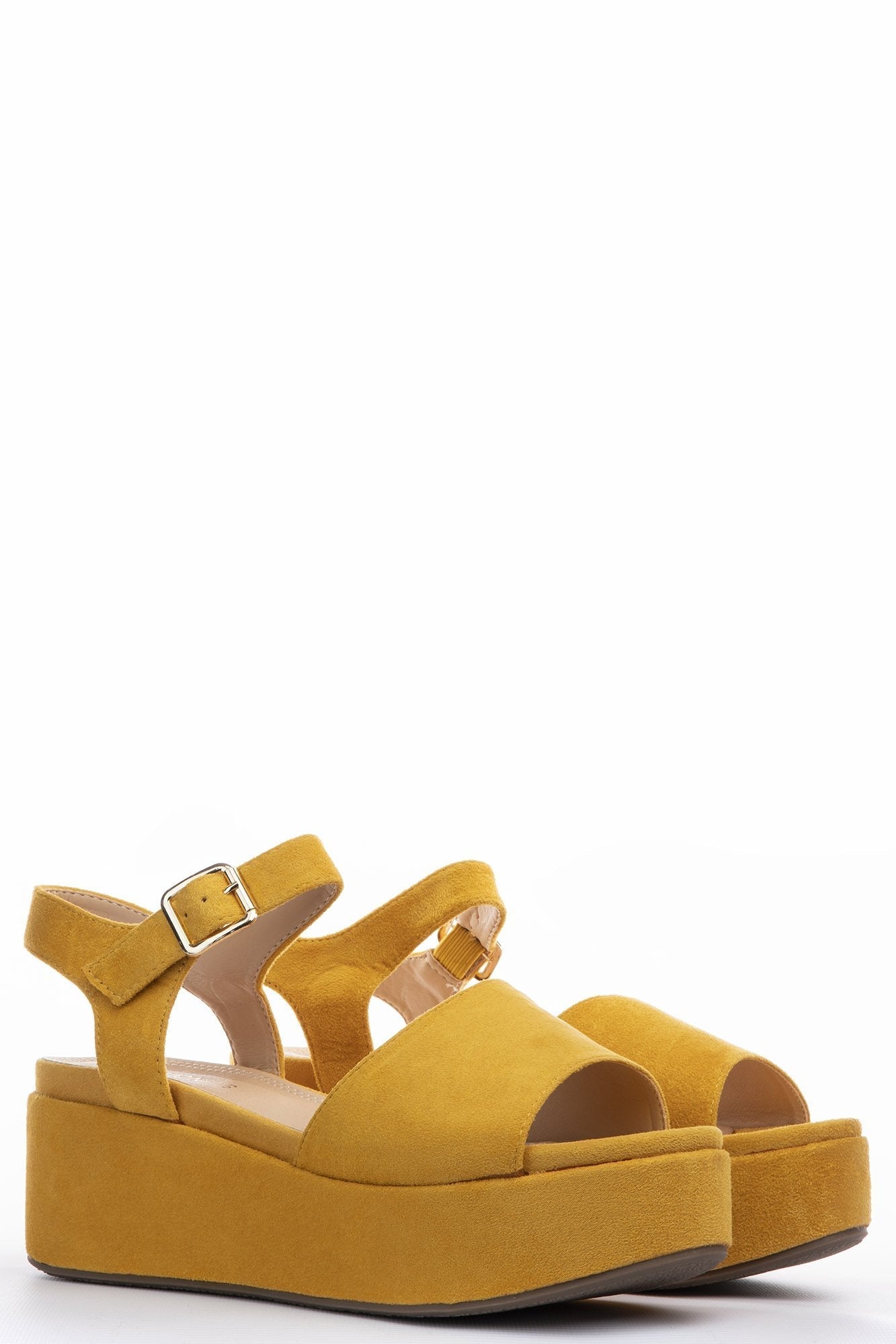 Sandalia de cuña, tejido ante, broche con trabilla, terminación dentada. Altura plataforma 6.5 cm