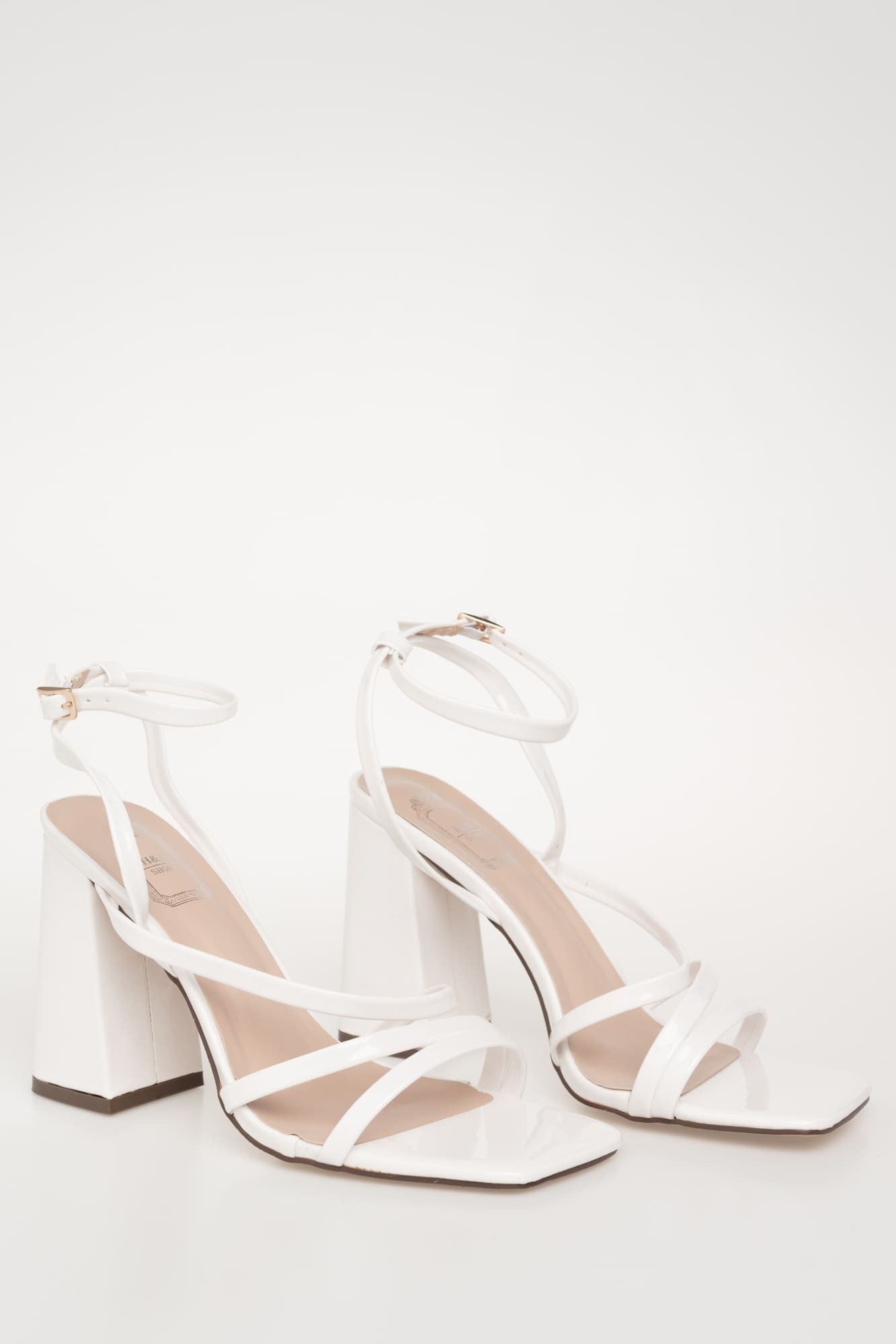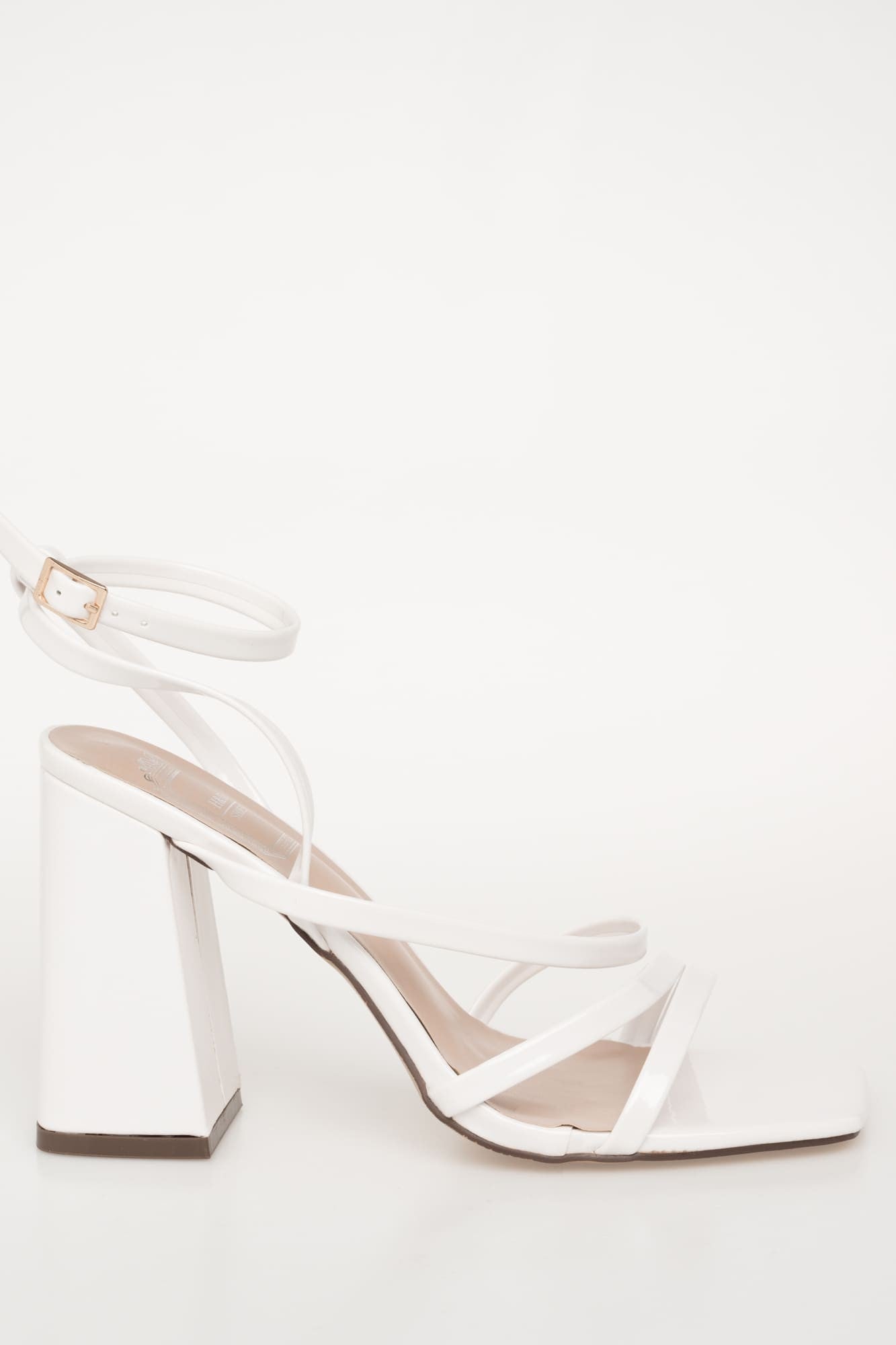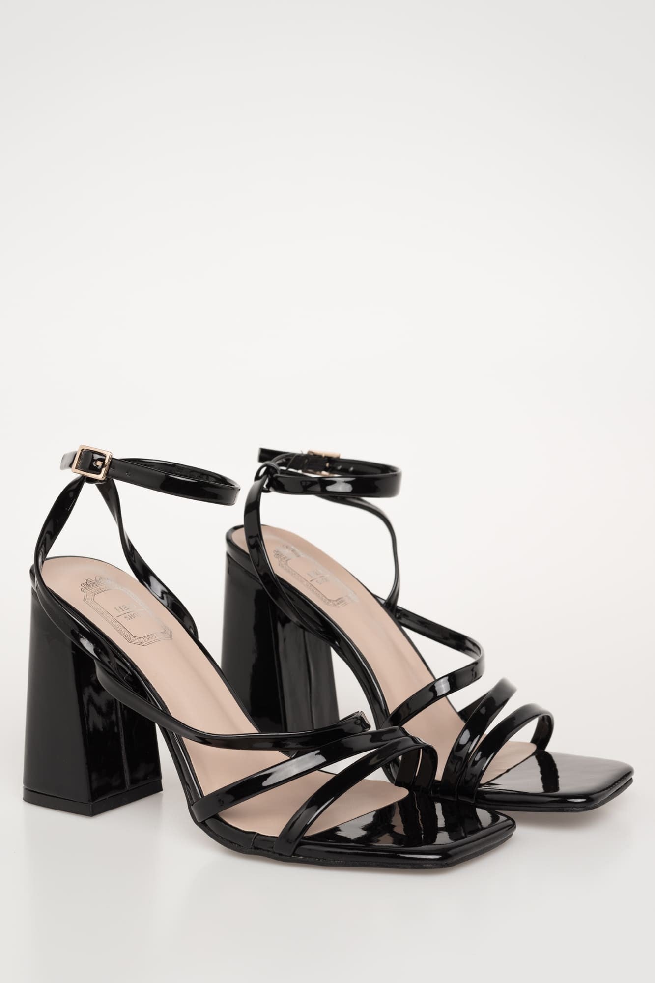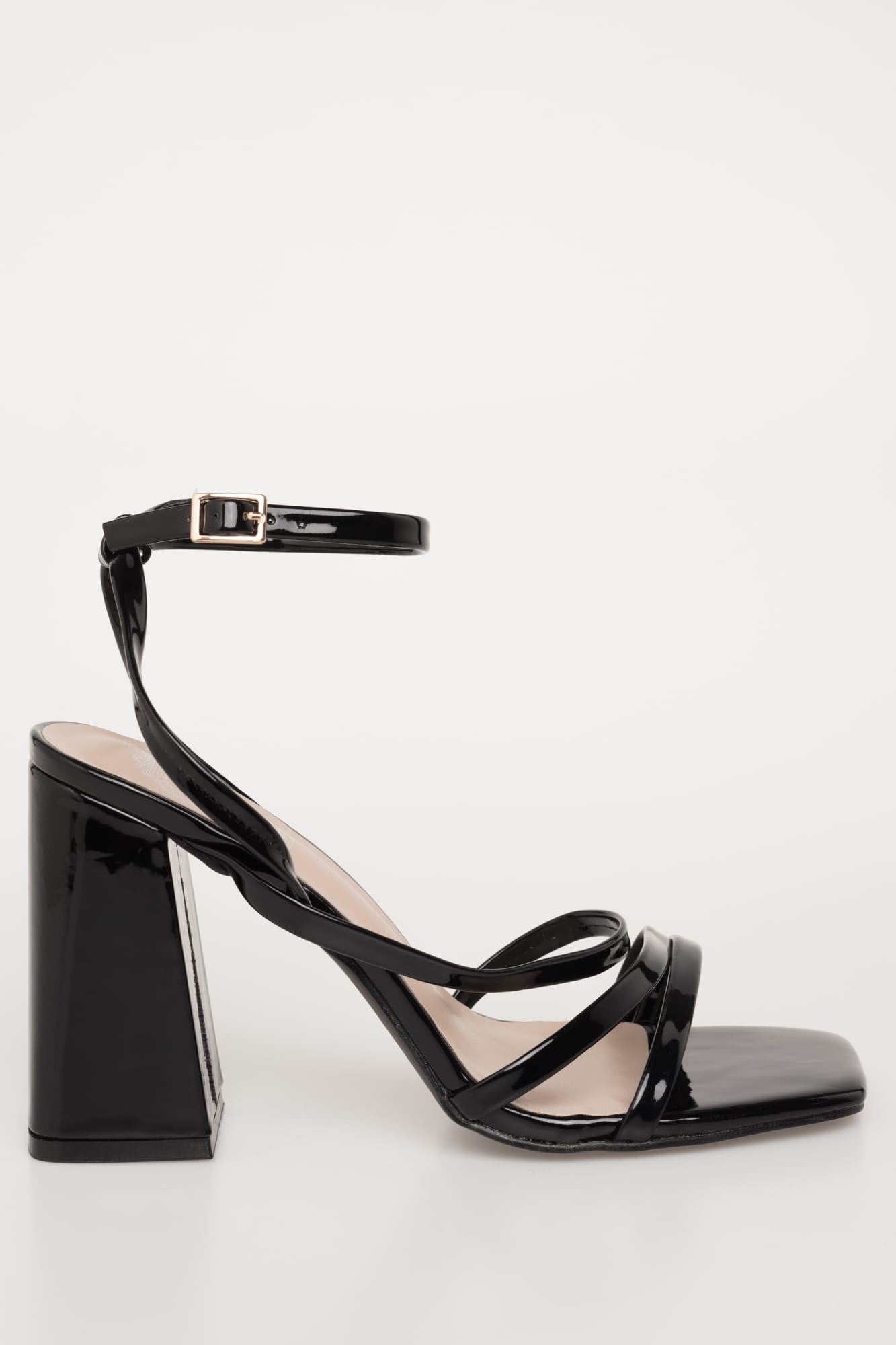 Sandalia de tacón, diseño tirantes, efecto charol. Tacón bloque forrado. Acabada en punta cuadrada. Cierre de hebilla atado al tobillo. Altura del tacón: 10 cm.