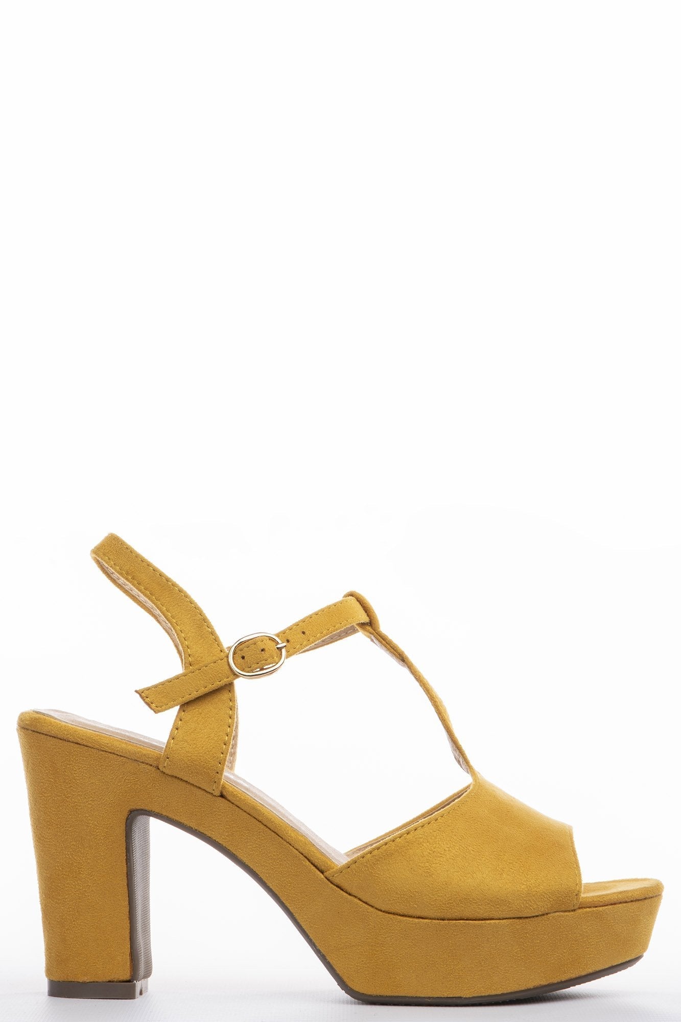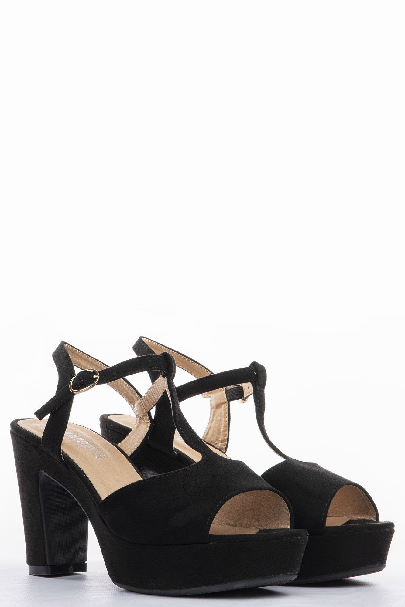 Sandalias en tejido de ante, puntera abierta, estilo con barra en forma de T, cierre con tira en el tobilllo, tacón bloque. Altura plataforma 2.5 cm, Altura tacón 10 cm.