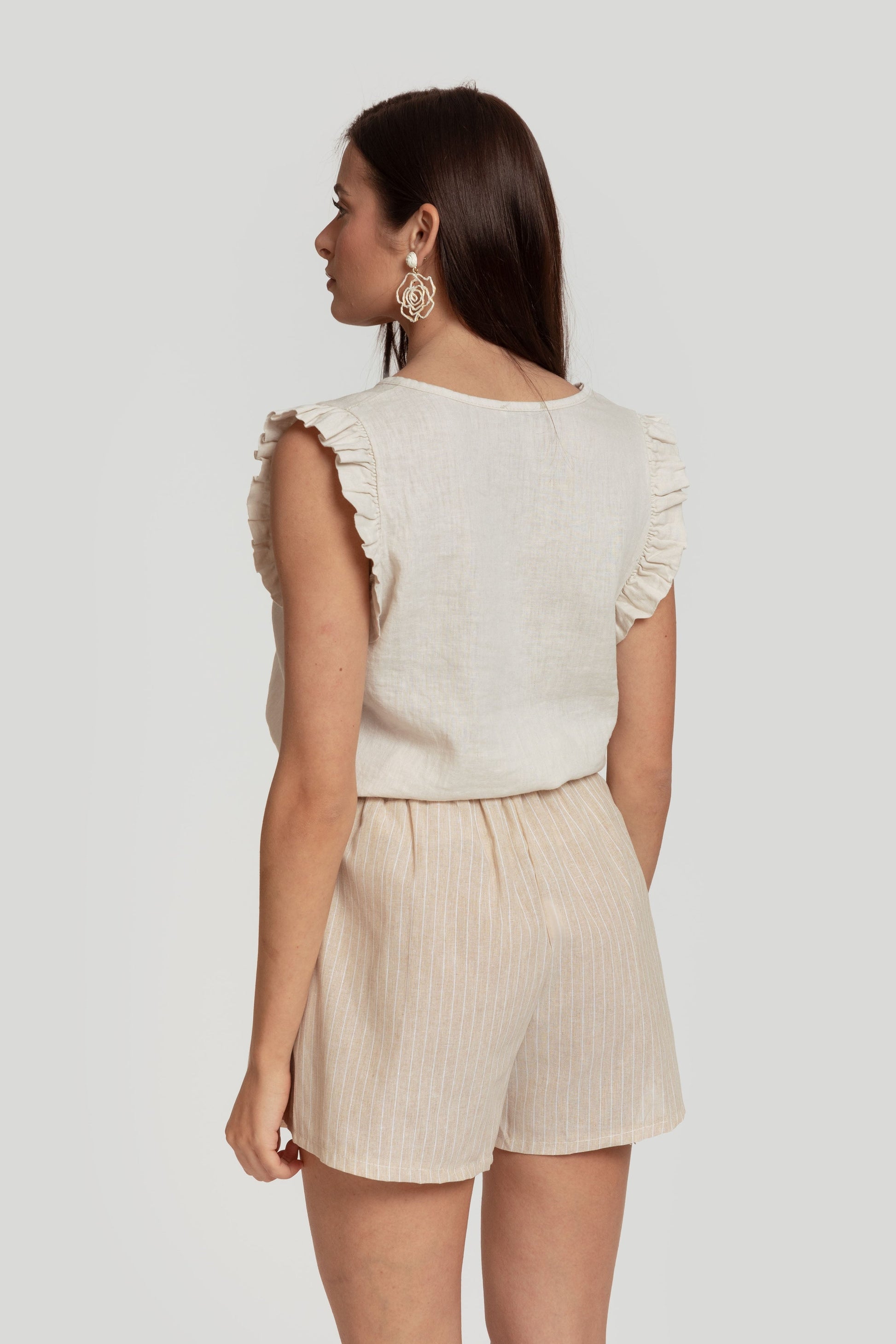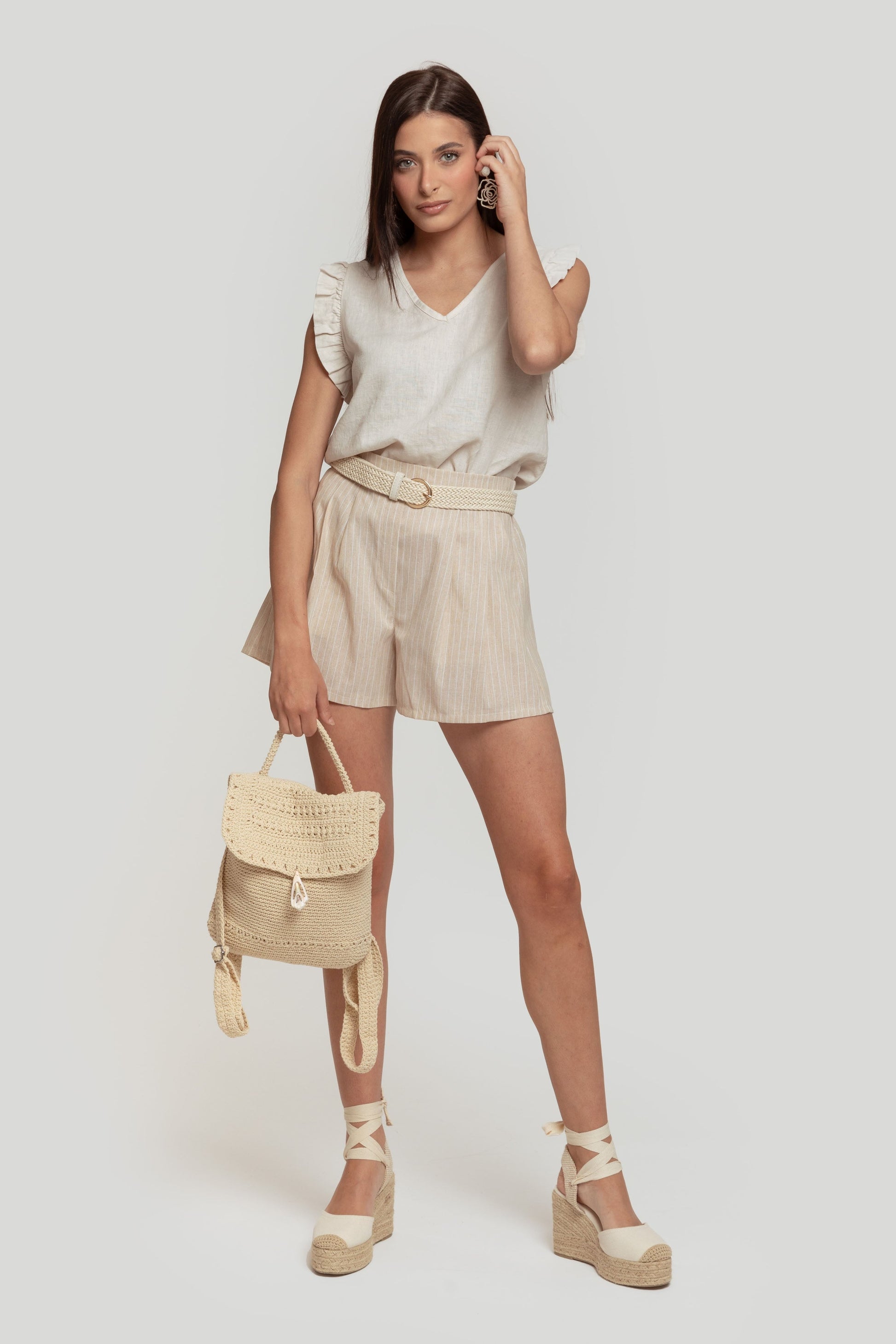 Tejido fluido. Diseño estampado. Diseño corto. Tiro alto. Cintura elástica. Bolsillos laterales. Detalles pinzas. Talla modelo: S. Altura modelo 1,76 m.