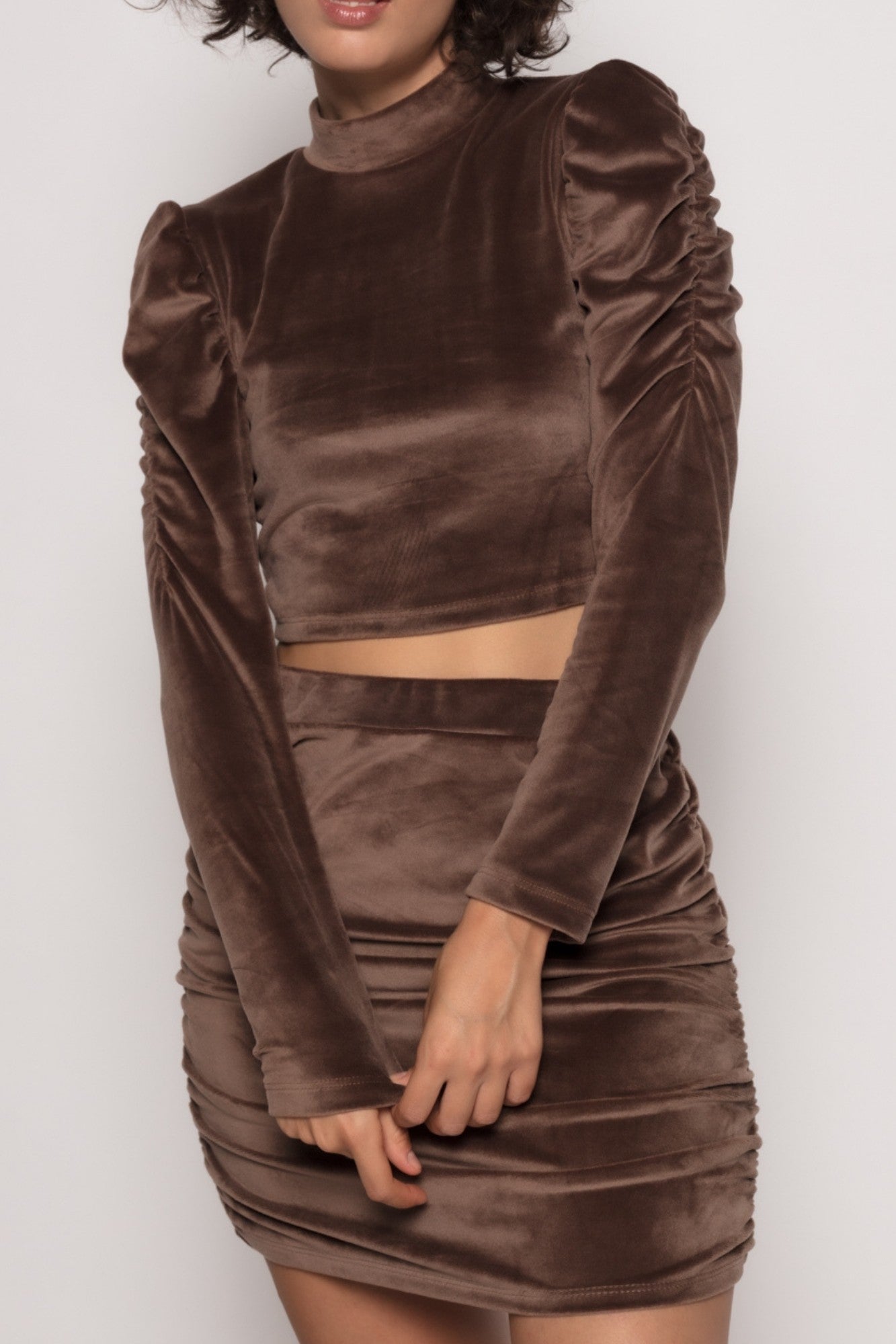 Falda de tiro alto. Cintura elástica. Detalle frunces laterales. Talla modelo: S. Altura modelo: 1,75 m.