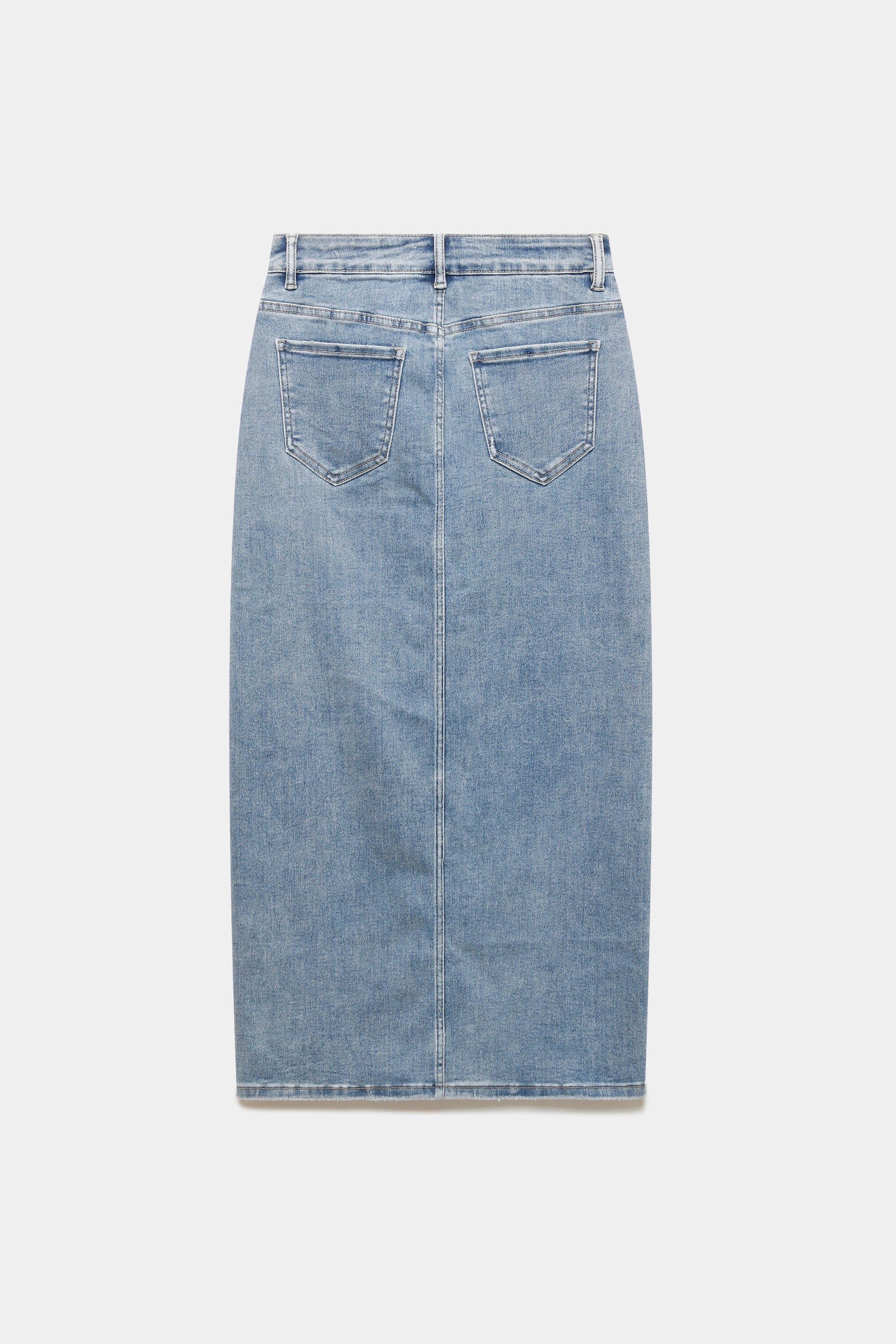 Tejido mezcla de algodón. Estilo tejano vaquero. Tejido gastado. Diseño midi. Diseño recto. Tiro alto. Cinco bolsillos. Cierre de cremallera y botón. Trabillas. Bajo con abertura frontal.