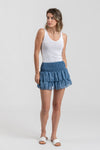 Tejido gasa. Tejido brillo. Diseño estampado. Diseño muy corto. Estilo falda pantalón. Tiro medio. Cintura elástica. Talla modelo: S. Altura modelo: 1,70 m.