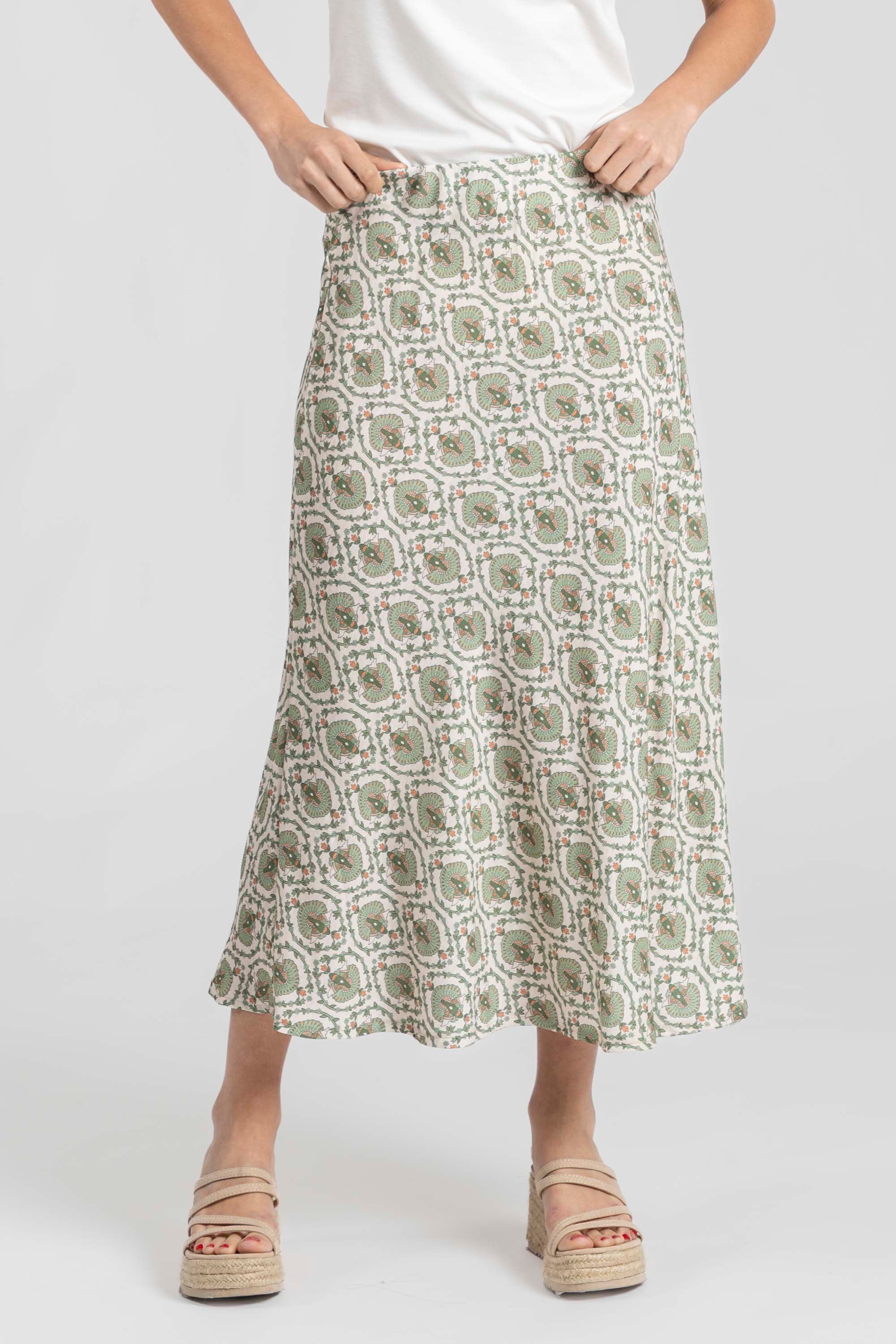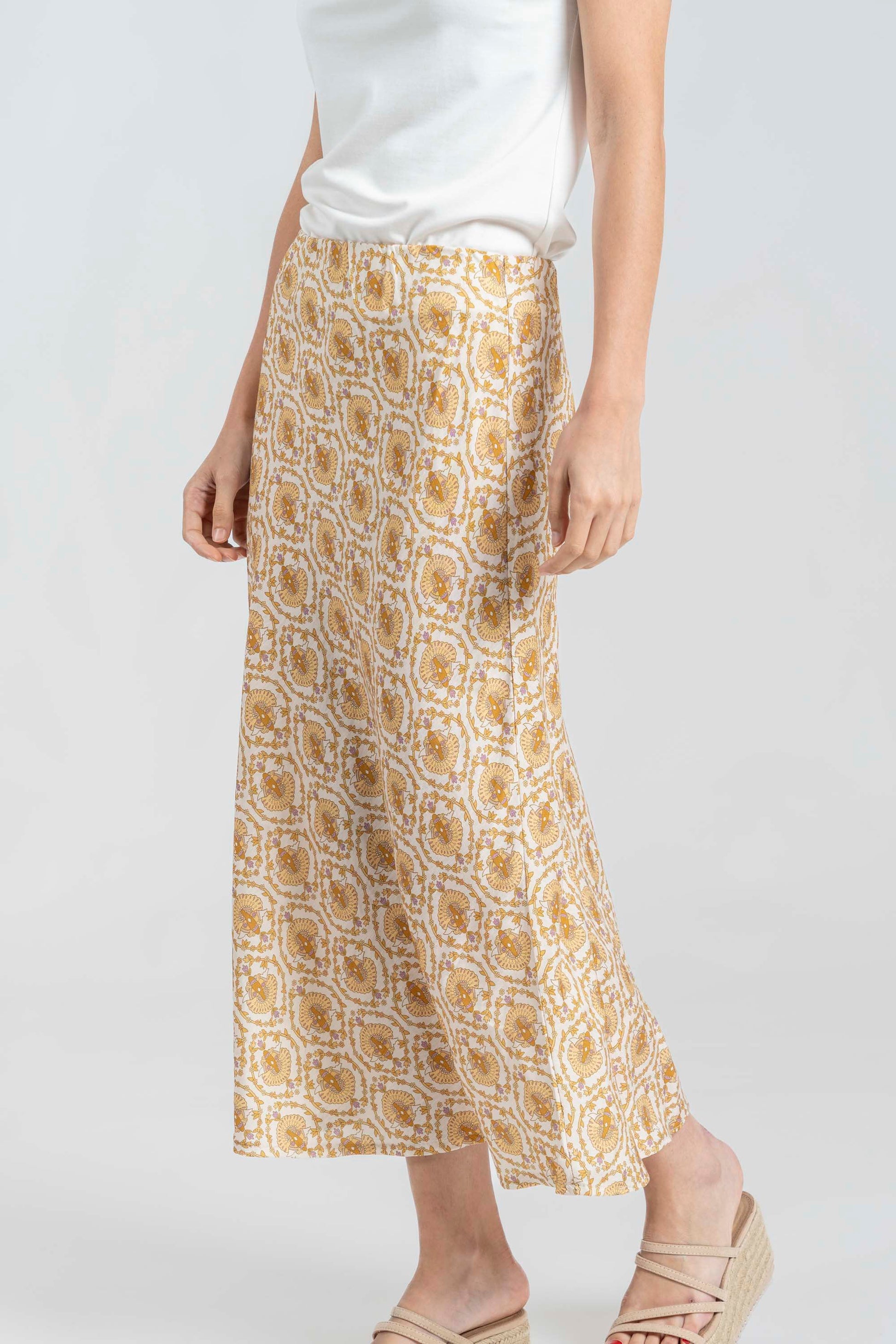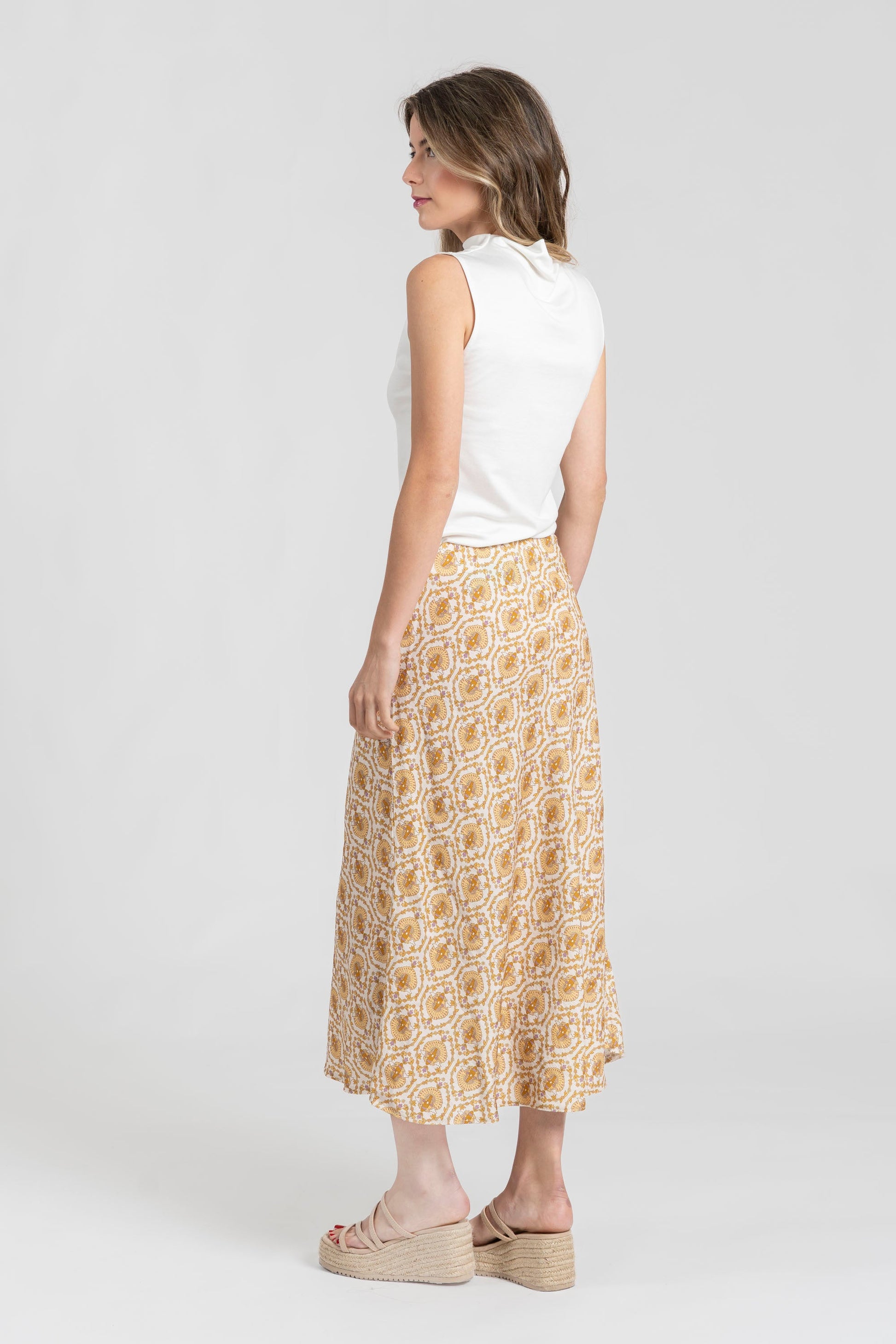 Tejido fluido. Diseño estampado. Diseño vuelo. Diseño midi. Cintura elástica. Talla S. Altura modelo: 1,70 m.