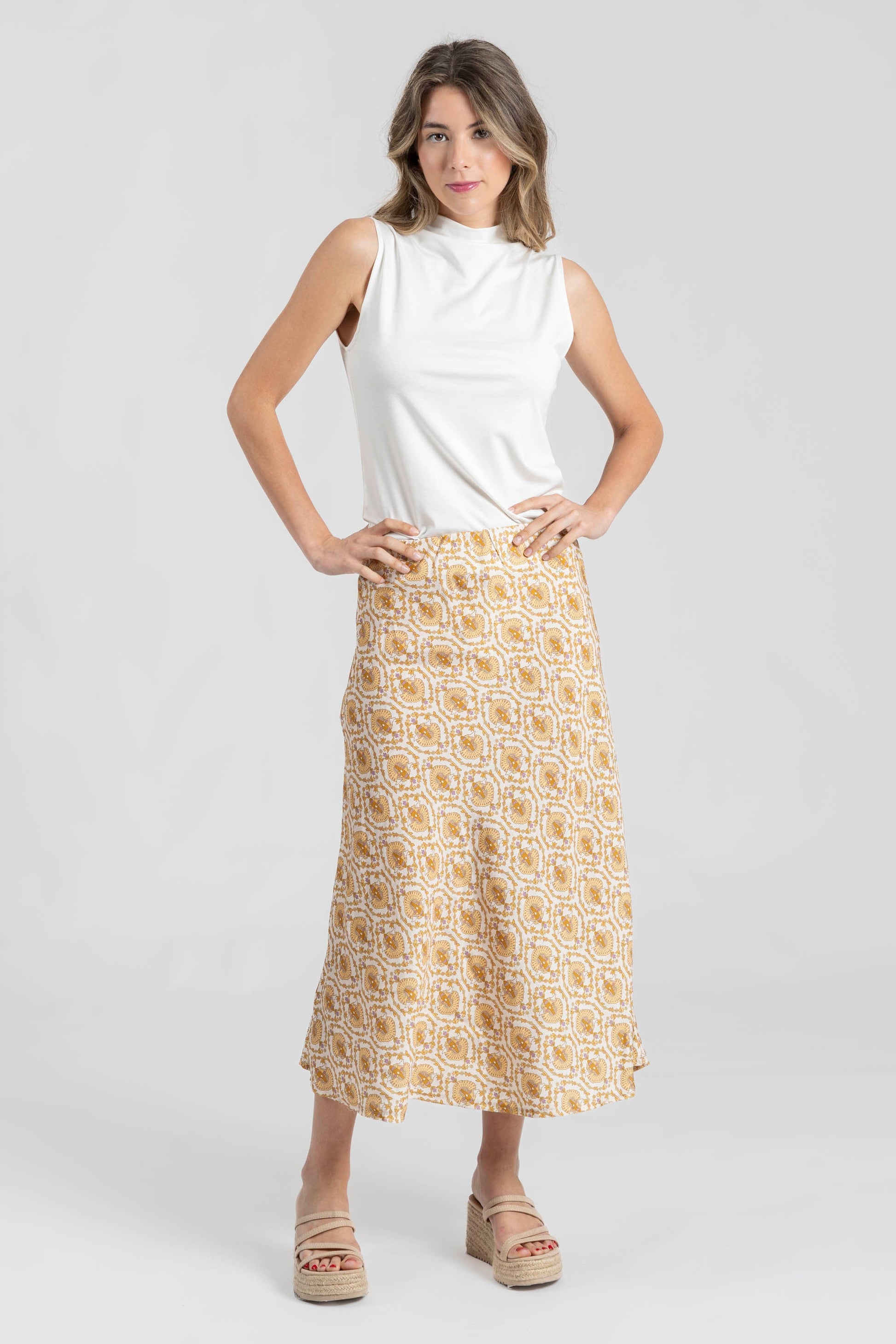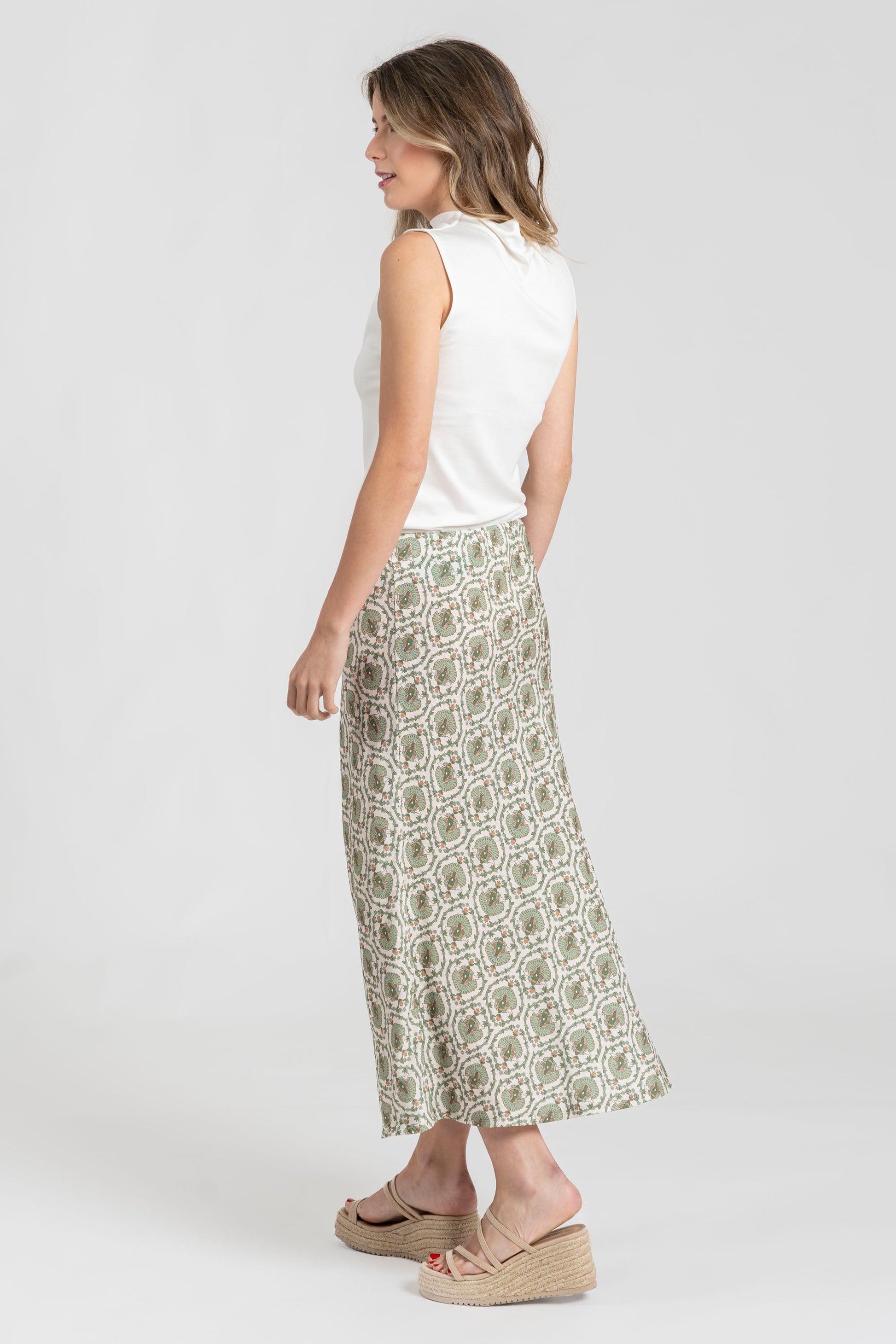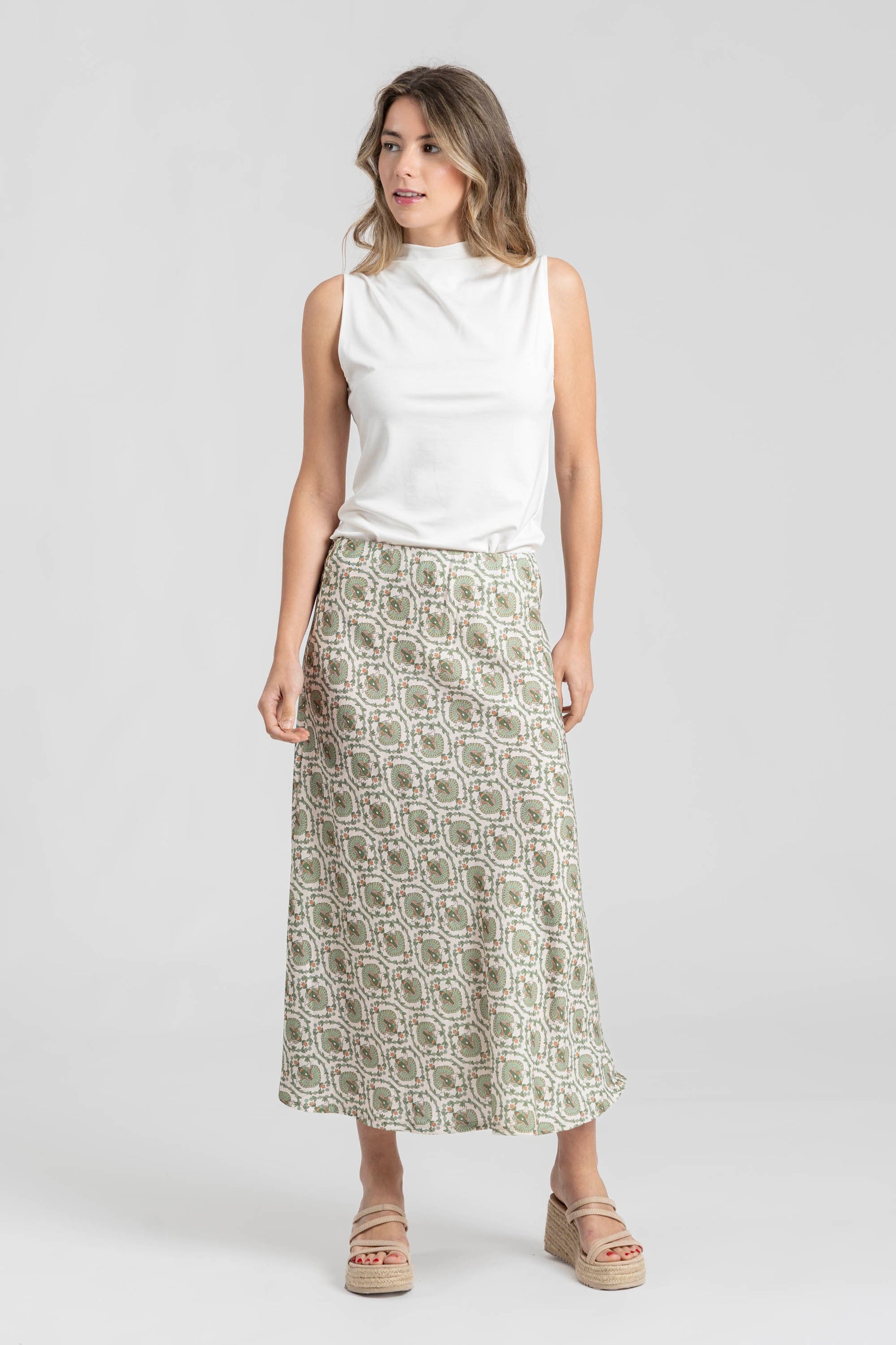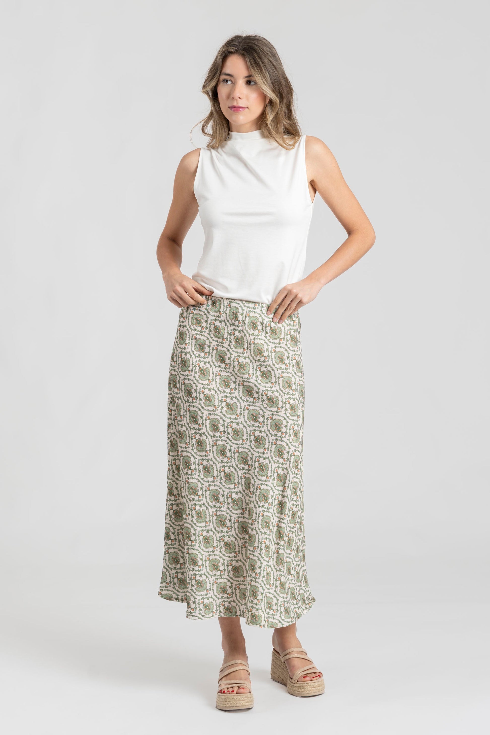 Tejido fluido. Diseño estampado. Diseño vuelo. Diseño midi. Cintura elástica. Talla S. Altura modelo: 1,70 m.