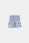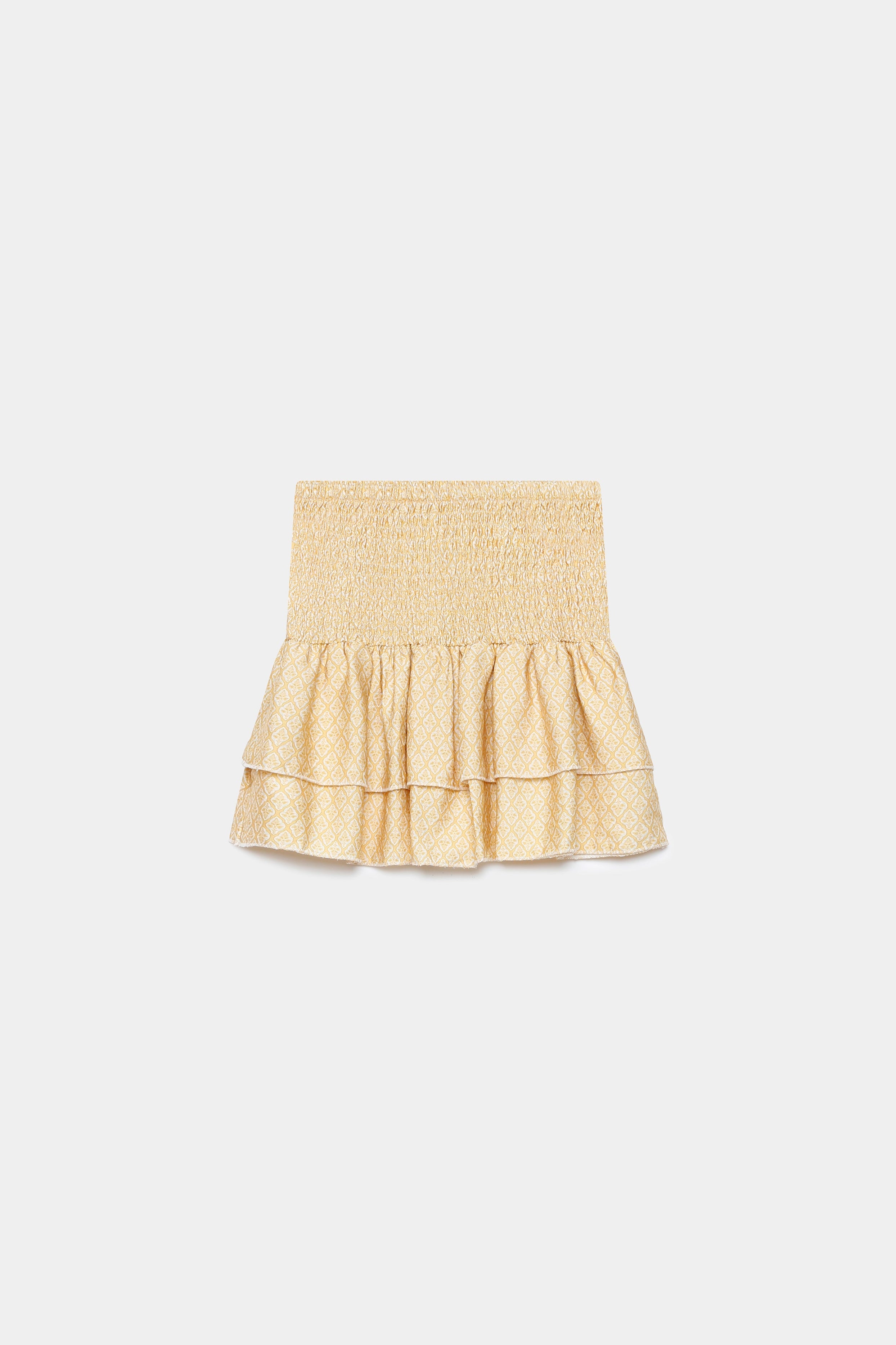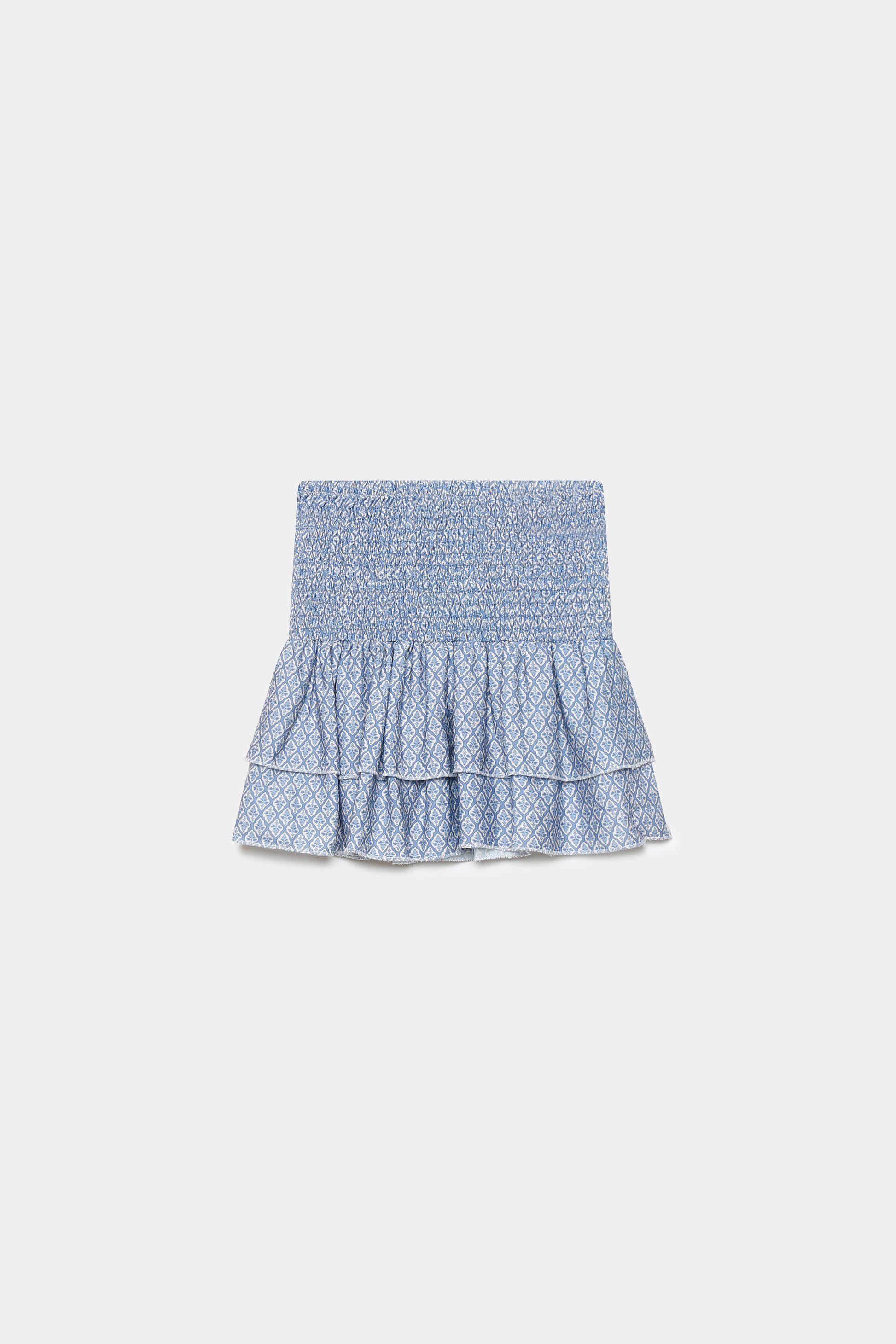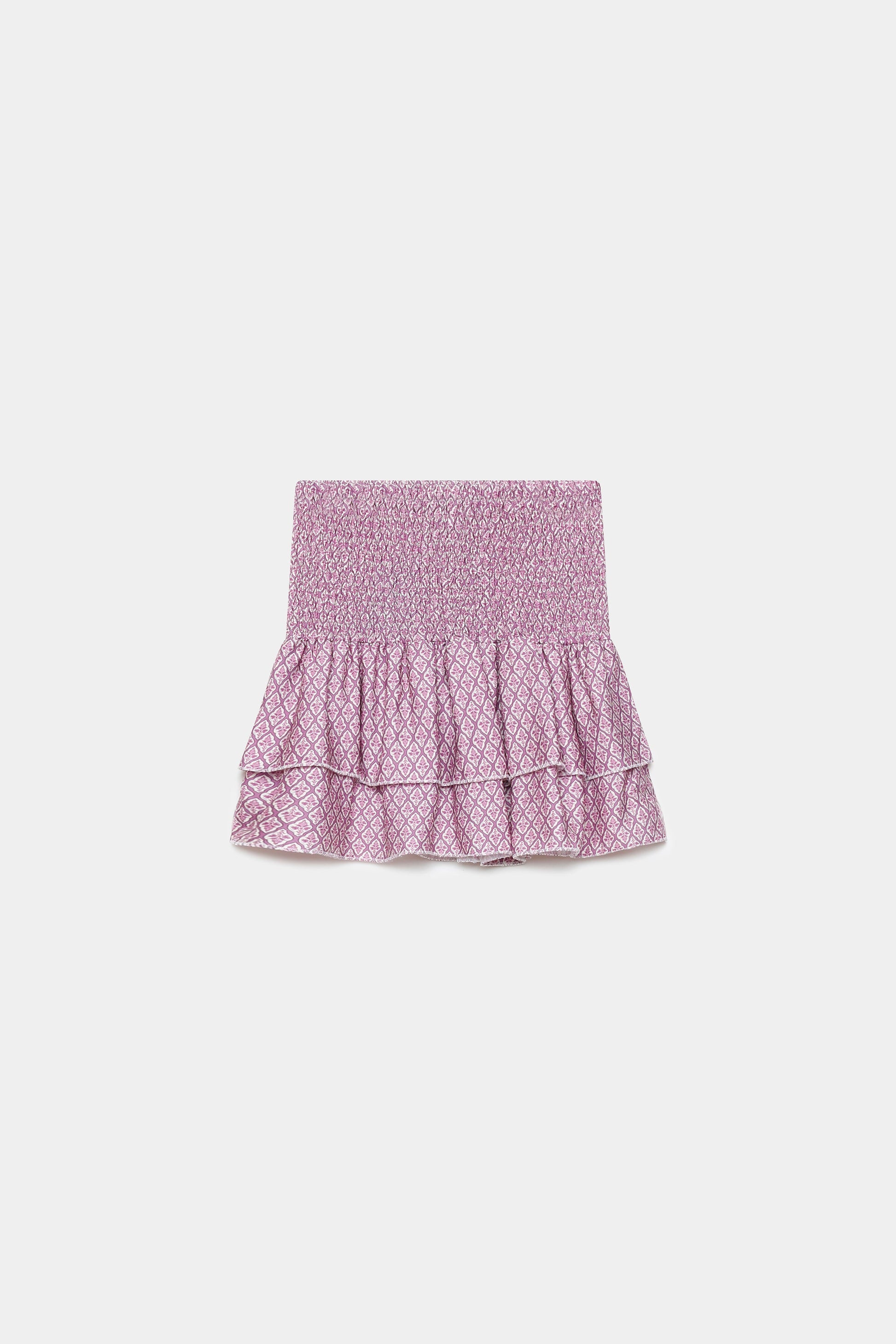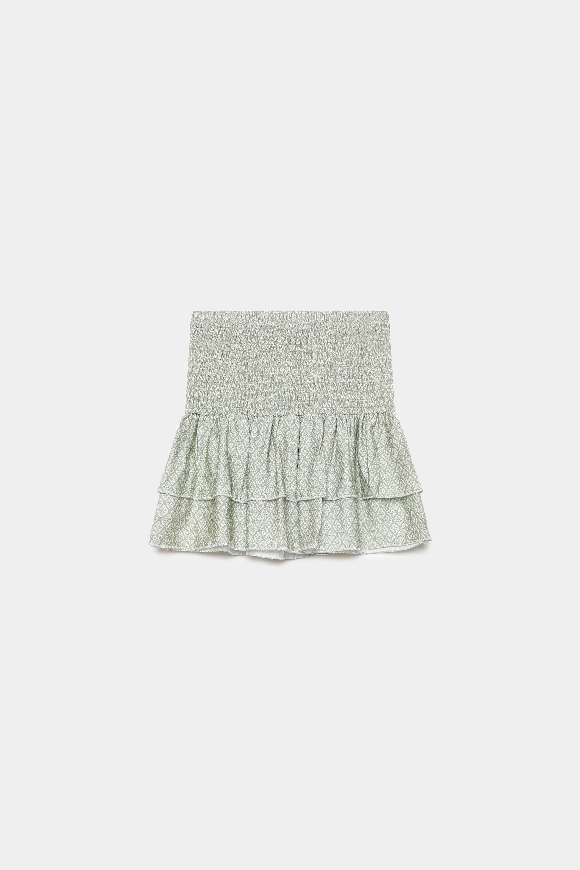 Tejido estampado. Diseño corto. Tiro alto. Cintura elástica.