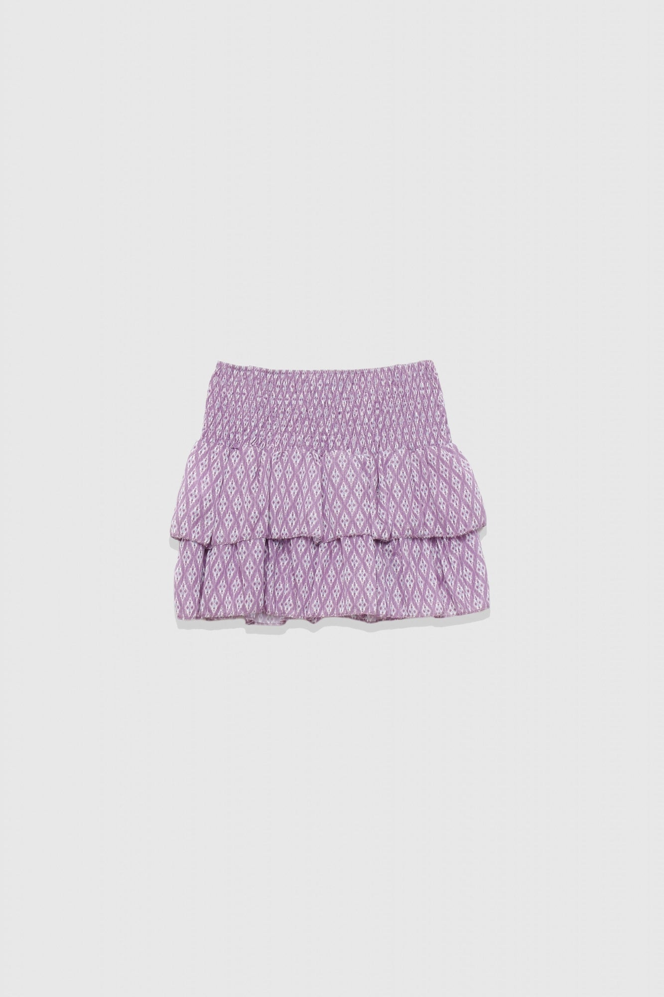 Tejido gasa. Tejido brillo. Diseño estampado. Diseño muy corto. Estilo falda pantalón. Tiro medio. Cintura elástica. Talla modelo: S. Altura modelo: 1,70 m.