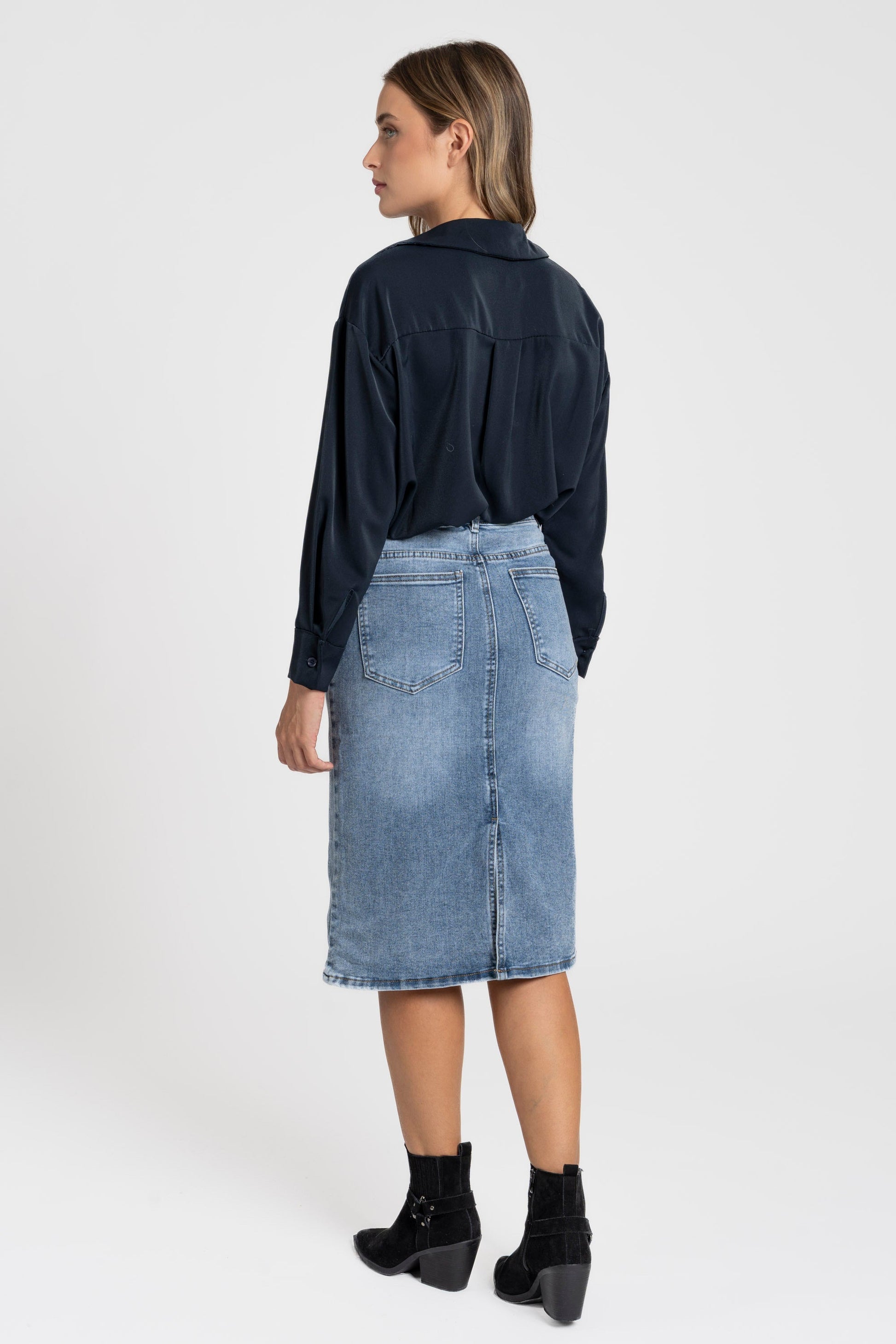 Tejido mezcla de algodón. Tejido elástico. Cintura alta. Diseño midi. Cinco bolsillos. Cierre frontal cremallera y botón. Apertura trasera.