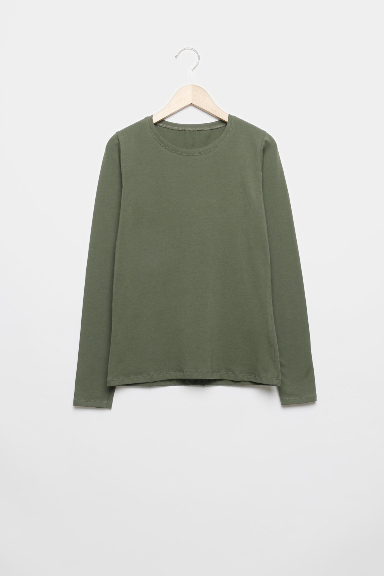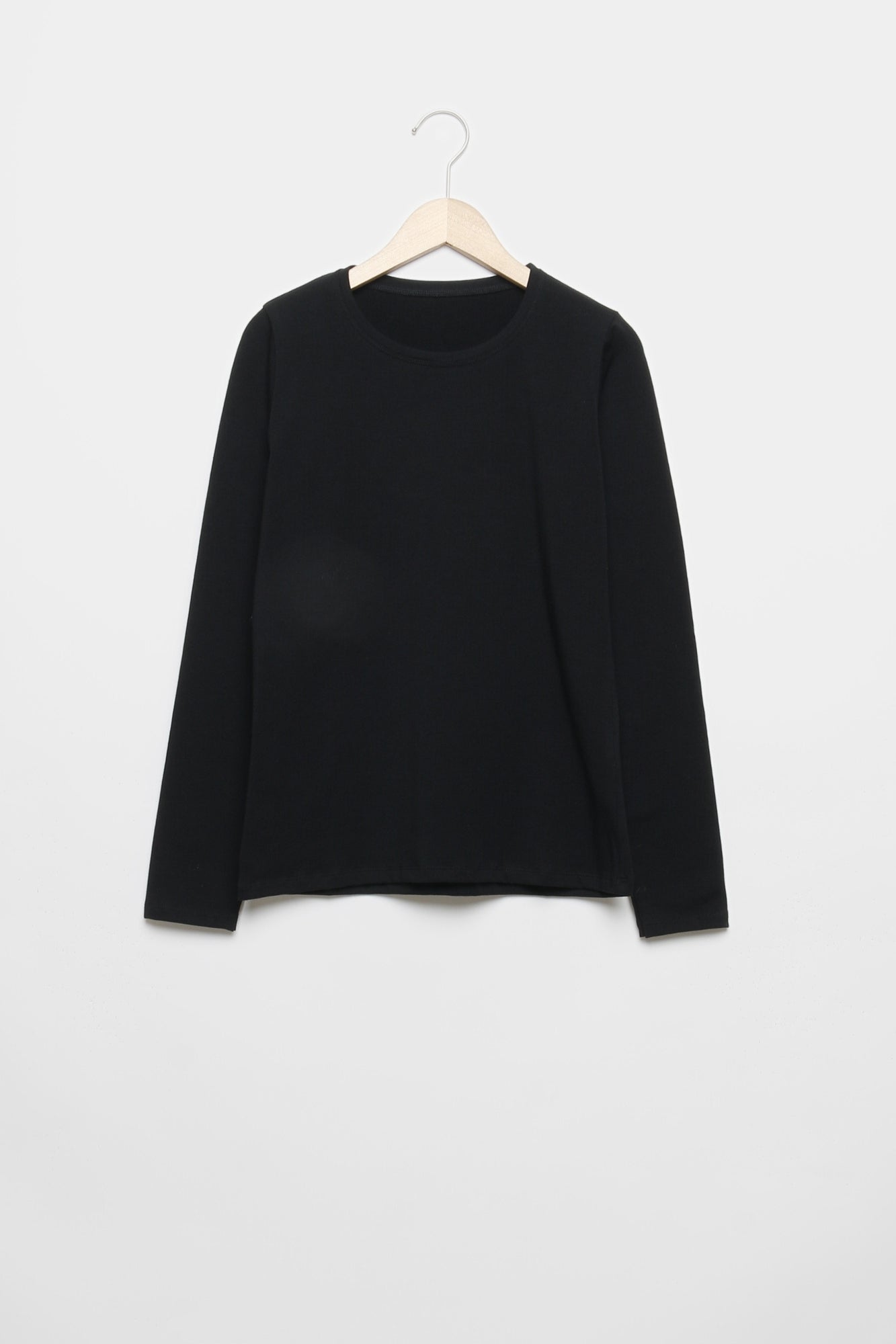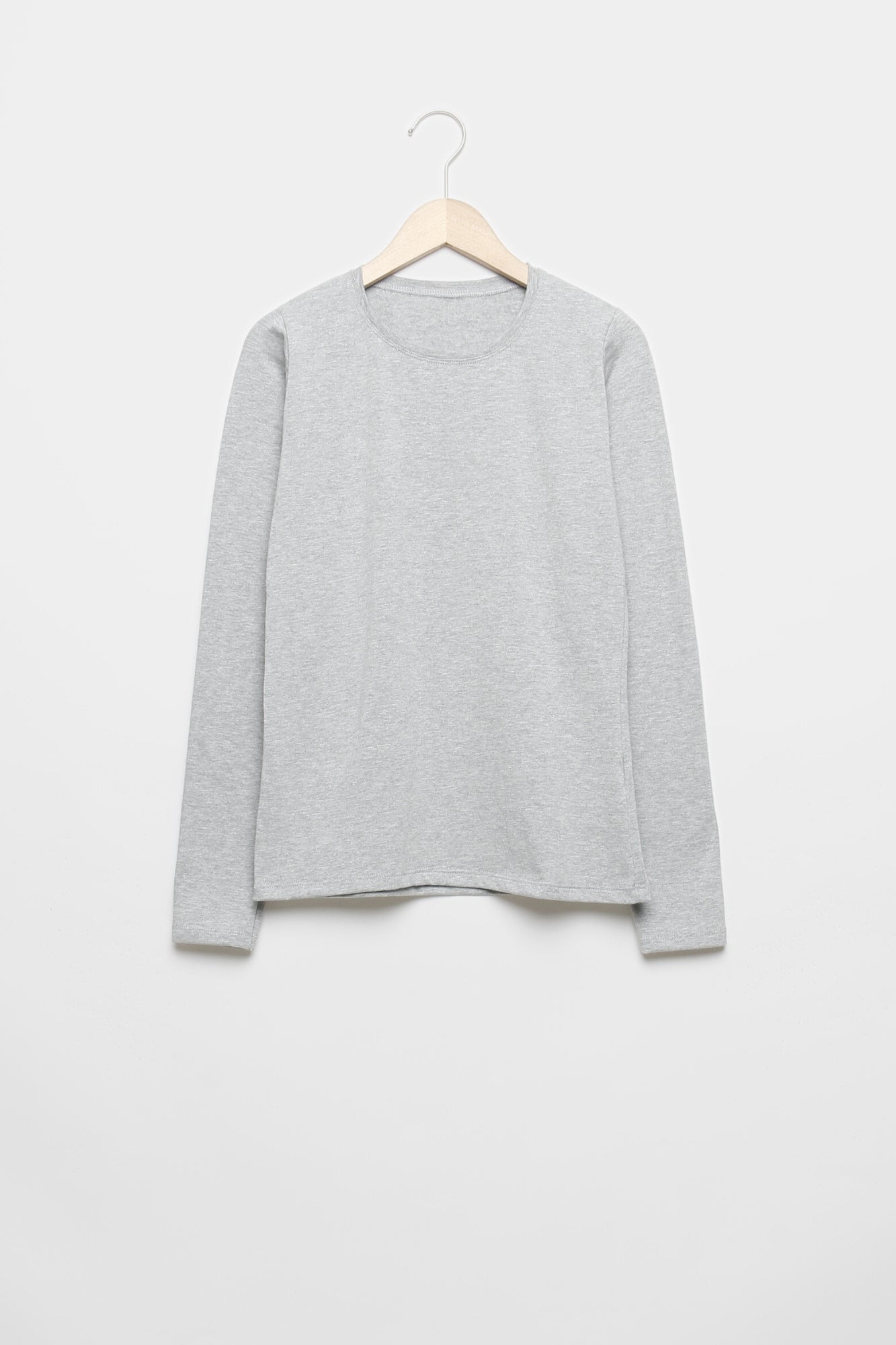 Tejido mezcla de algodón. Diseño recto. Diseño básico. Cuello redondo. Manga larga. Talla modelo: S. Altura modelo: 1.66 m.
