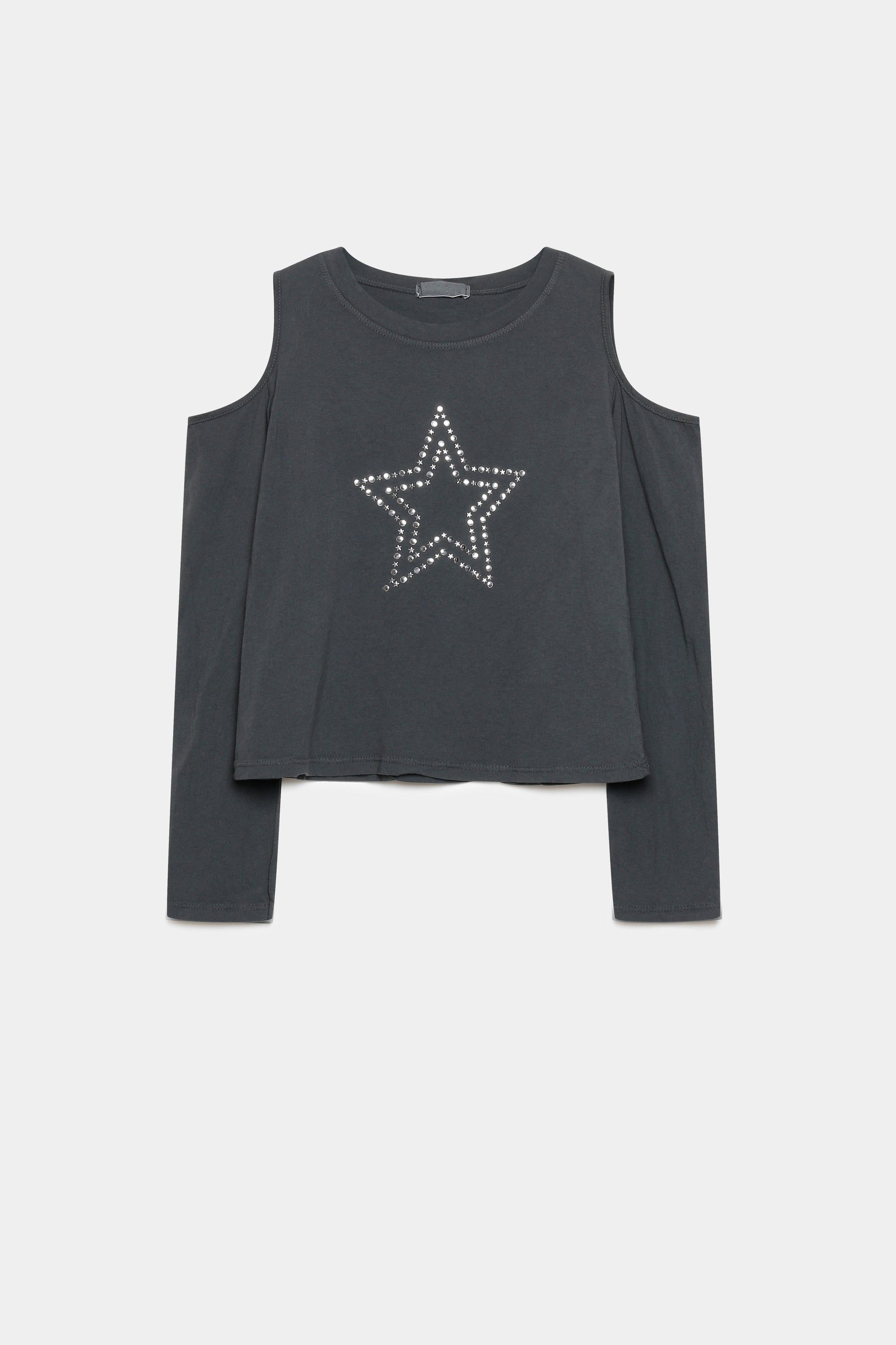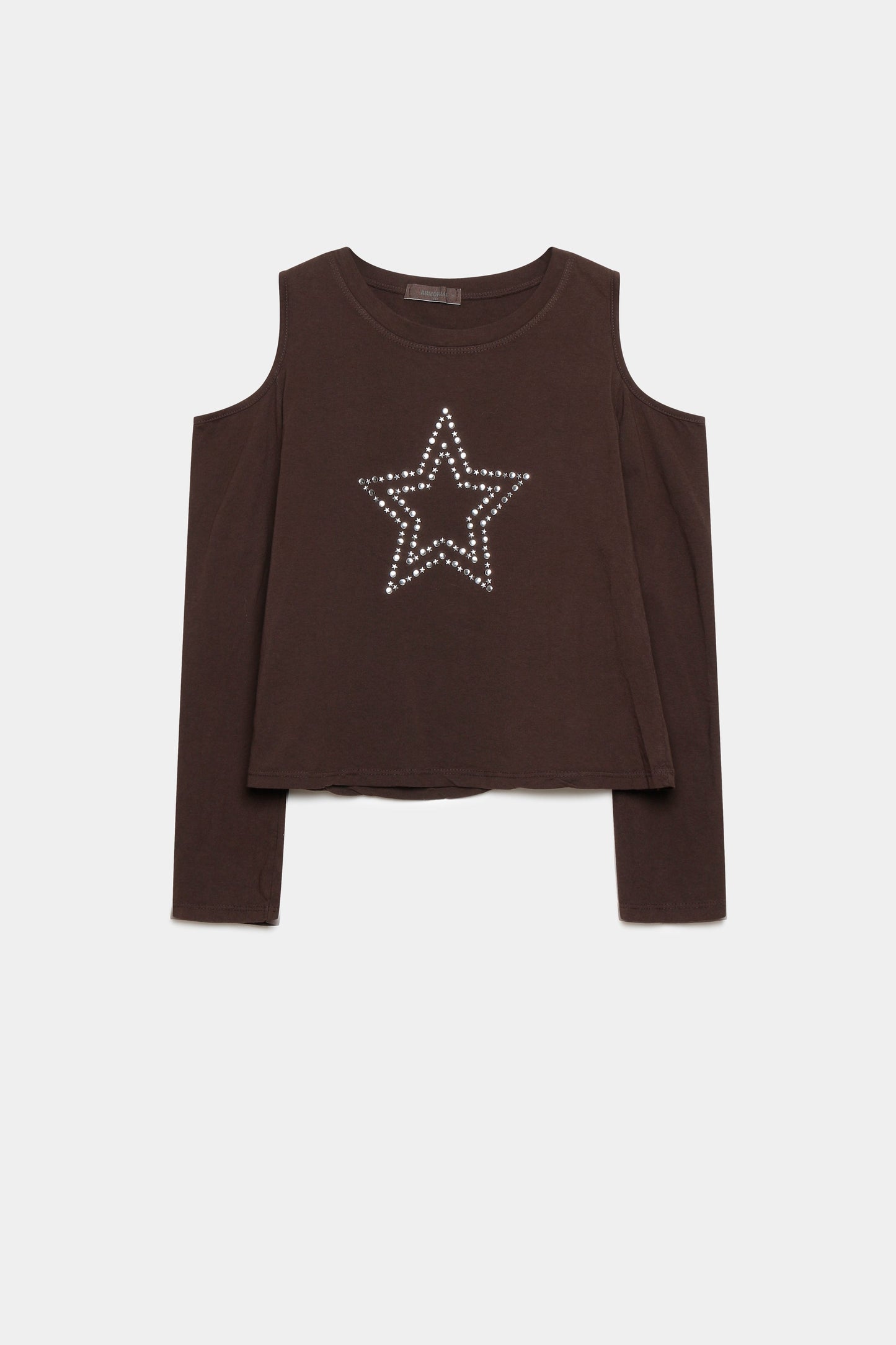 Tejido mezcla de algodón. Cuello redondo. Manga larga. Hombros con aberturas.