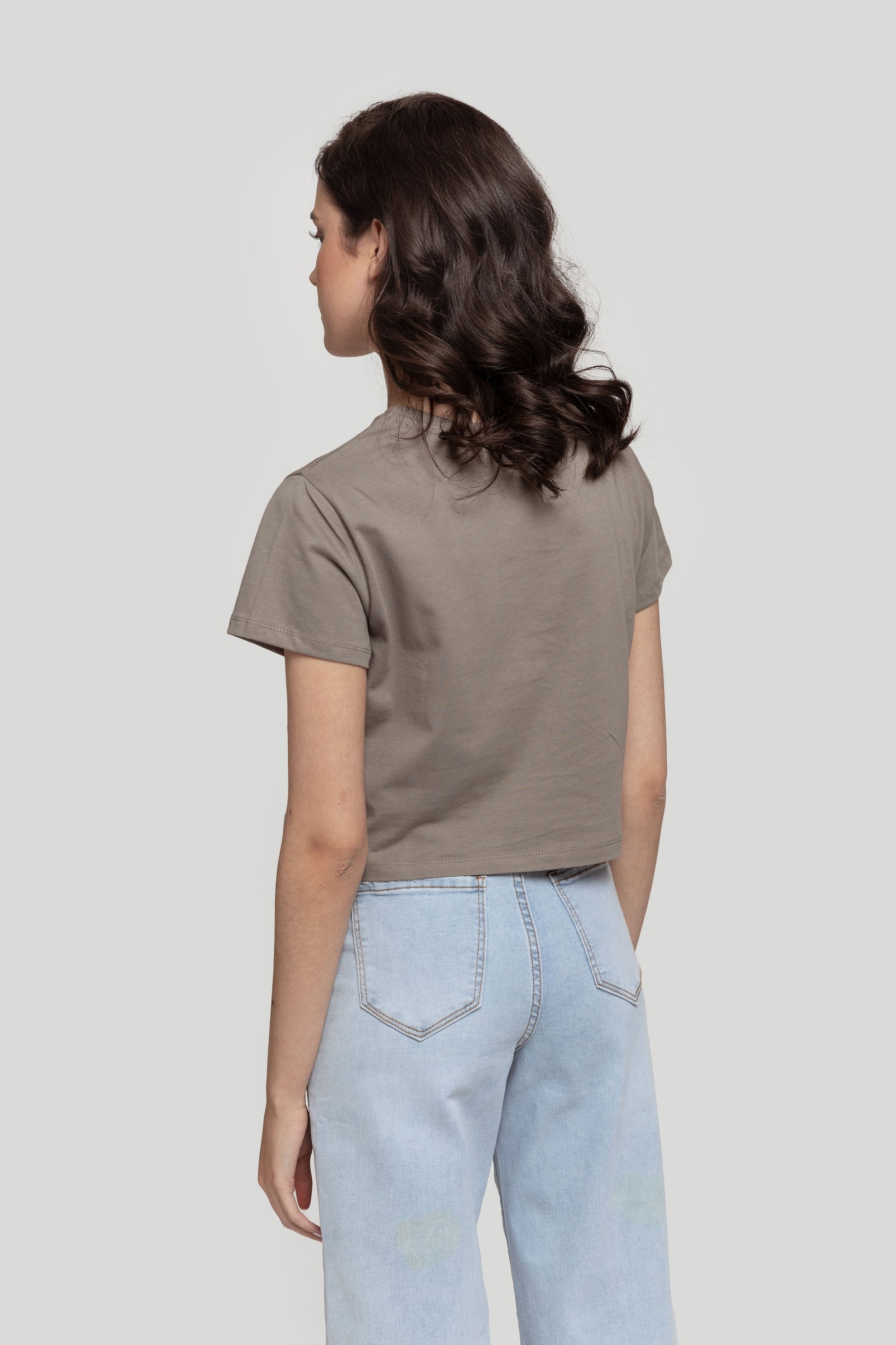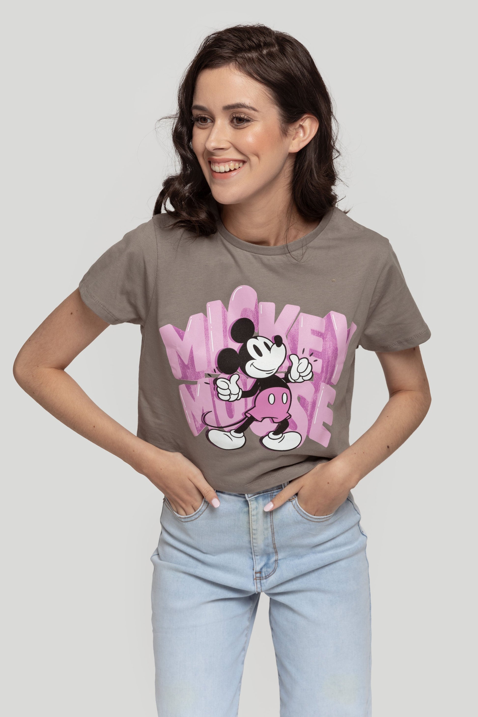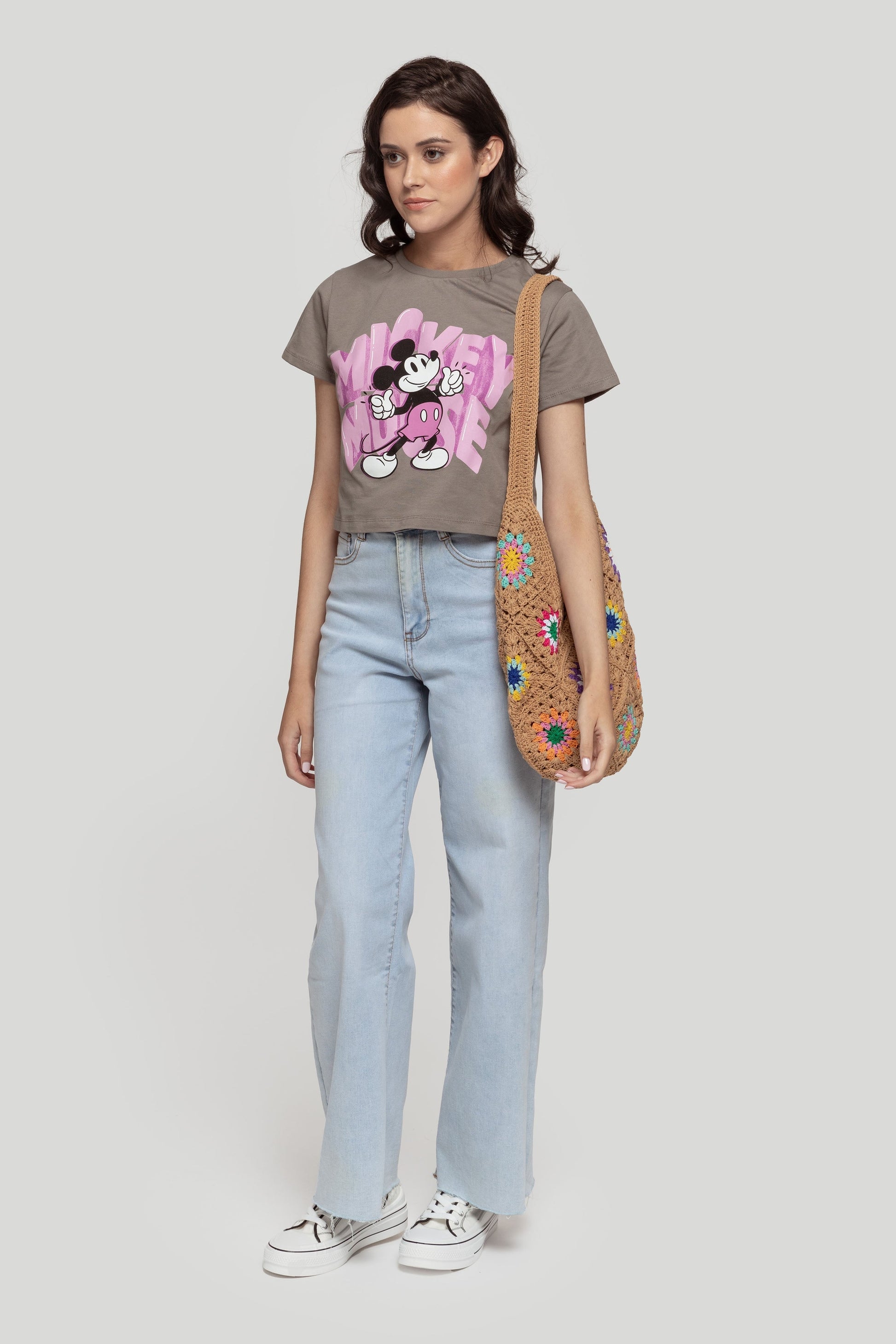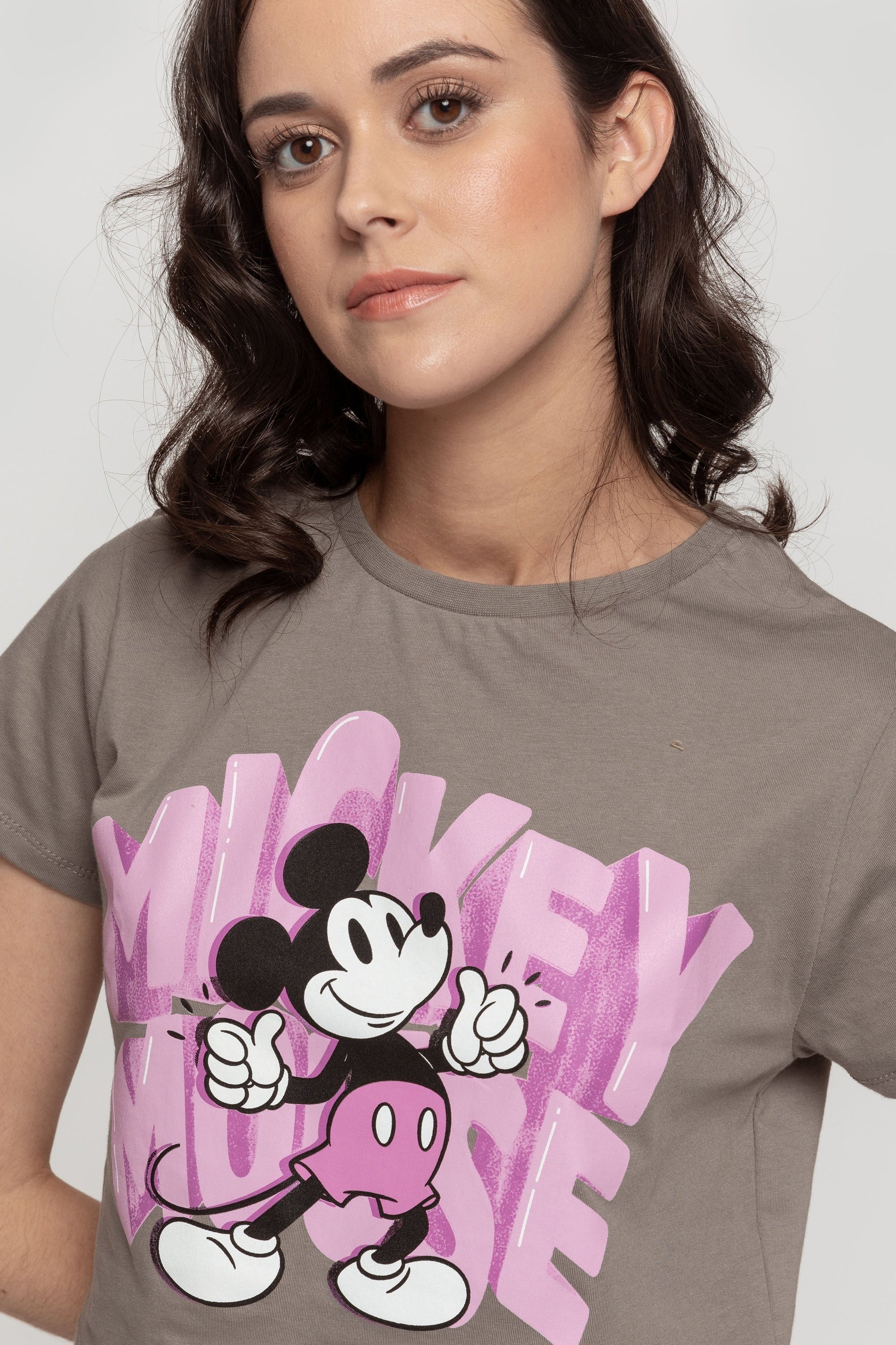 Camiseta de algodón. Estampado Mickey. Diseño oversize. Diseño cropped. Diseño recto. Cuello redondo. Manga corta. Licencia autorizada. Talla modelo: S. Altura modelo 1.67 m