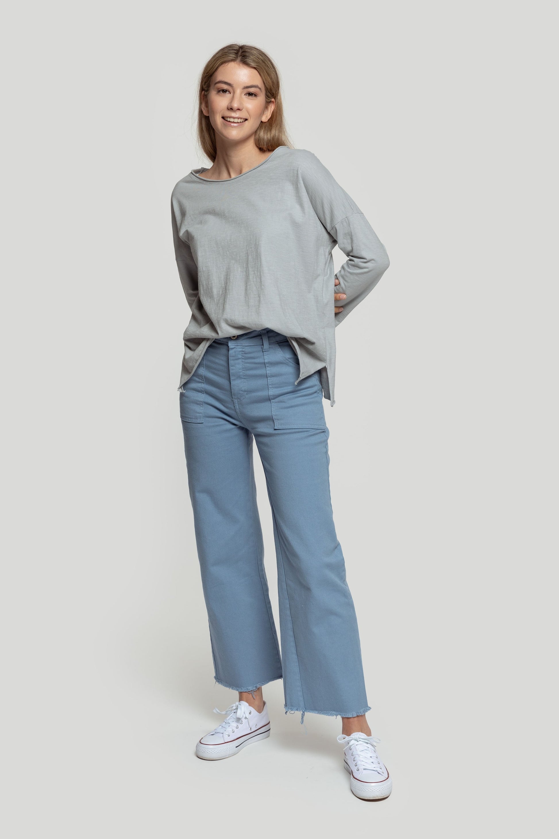 Camiseta básica. Tejido de algodón. Diseño largo. Cuello amplio. Manga larga. Cuello, manga y bajo sin rematar. Pequeñas aberturas laterales. Talla modelo: S. Altura modelo: 1,70 m.