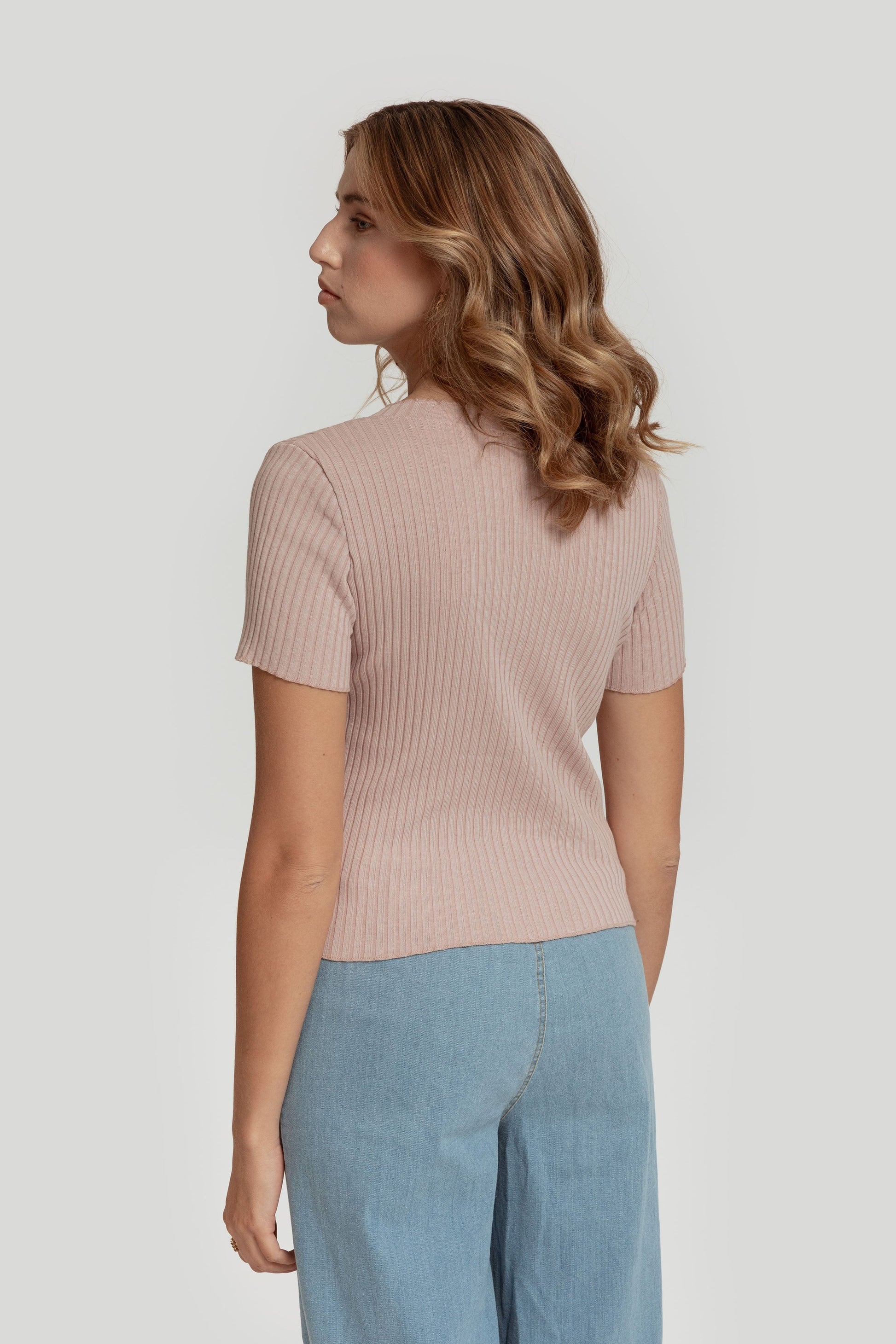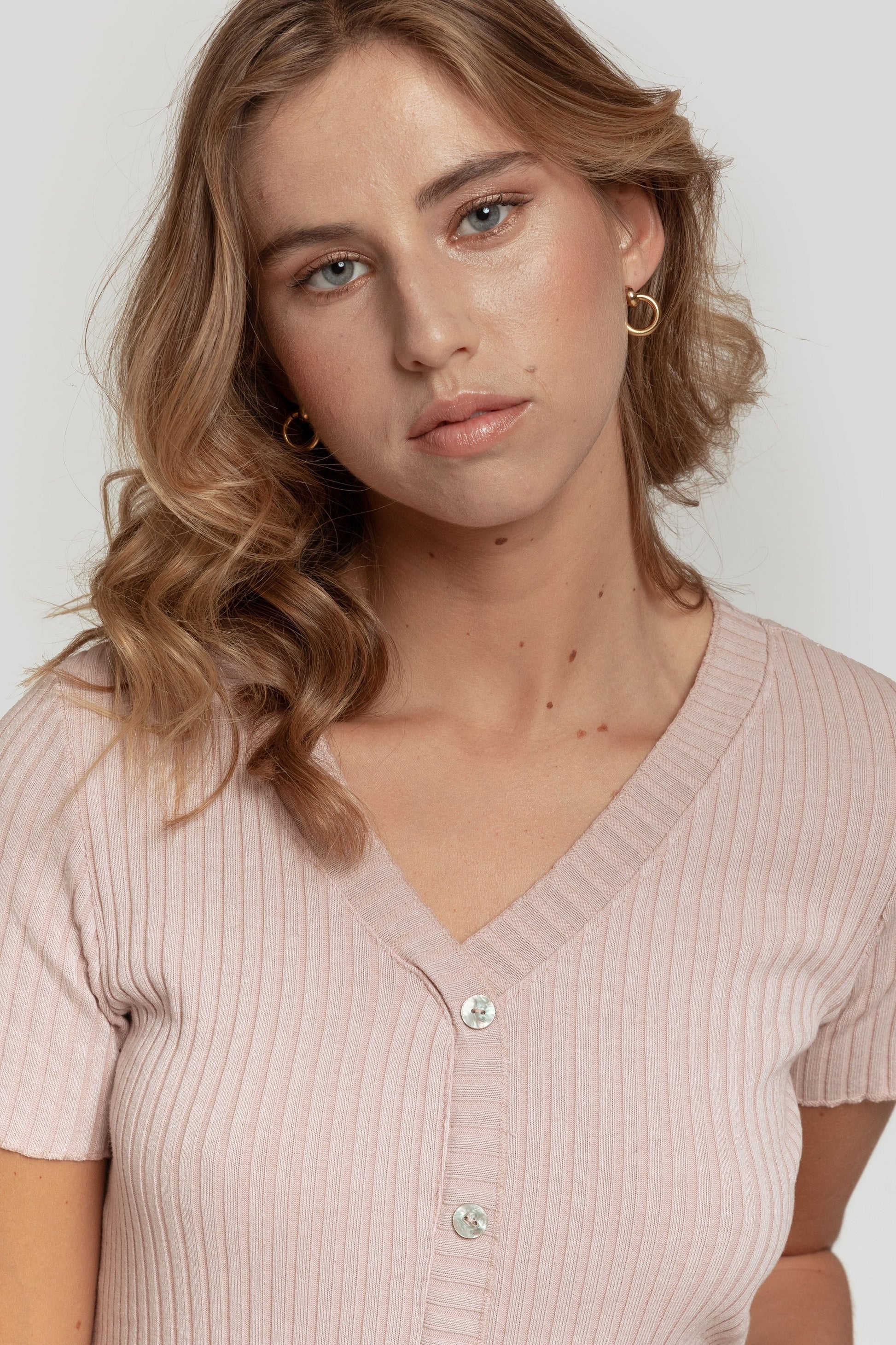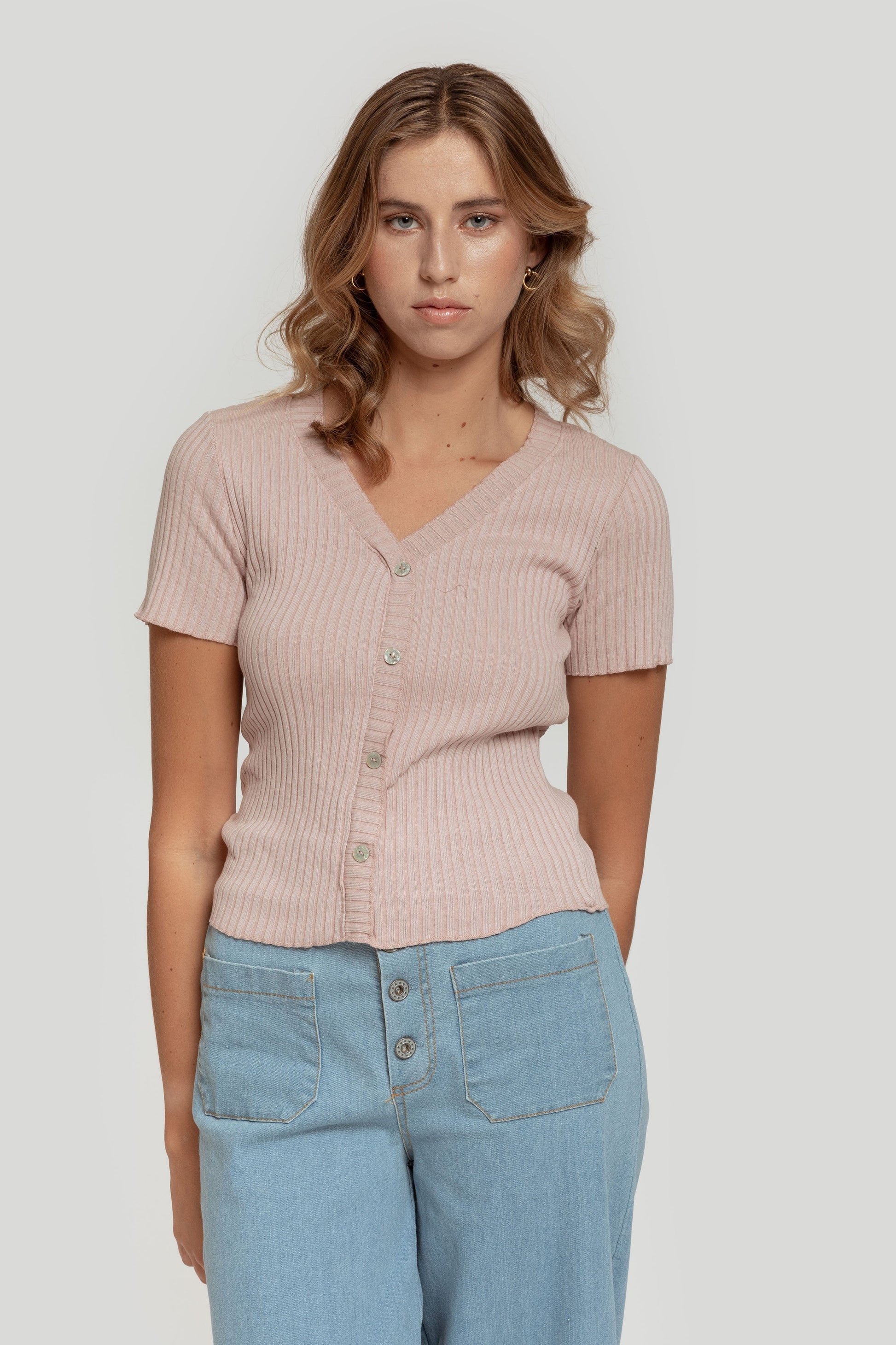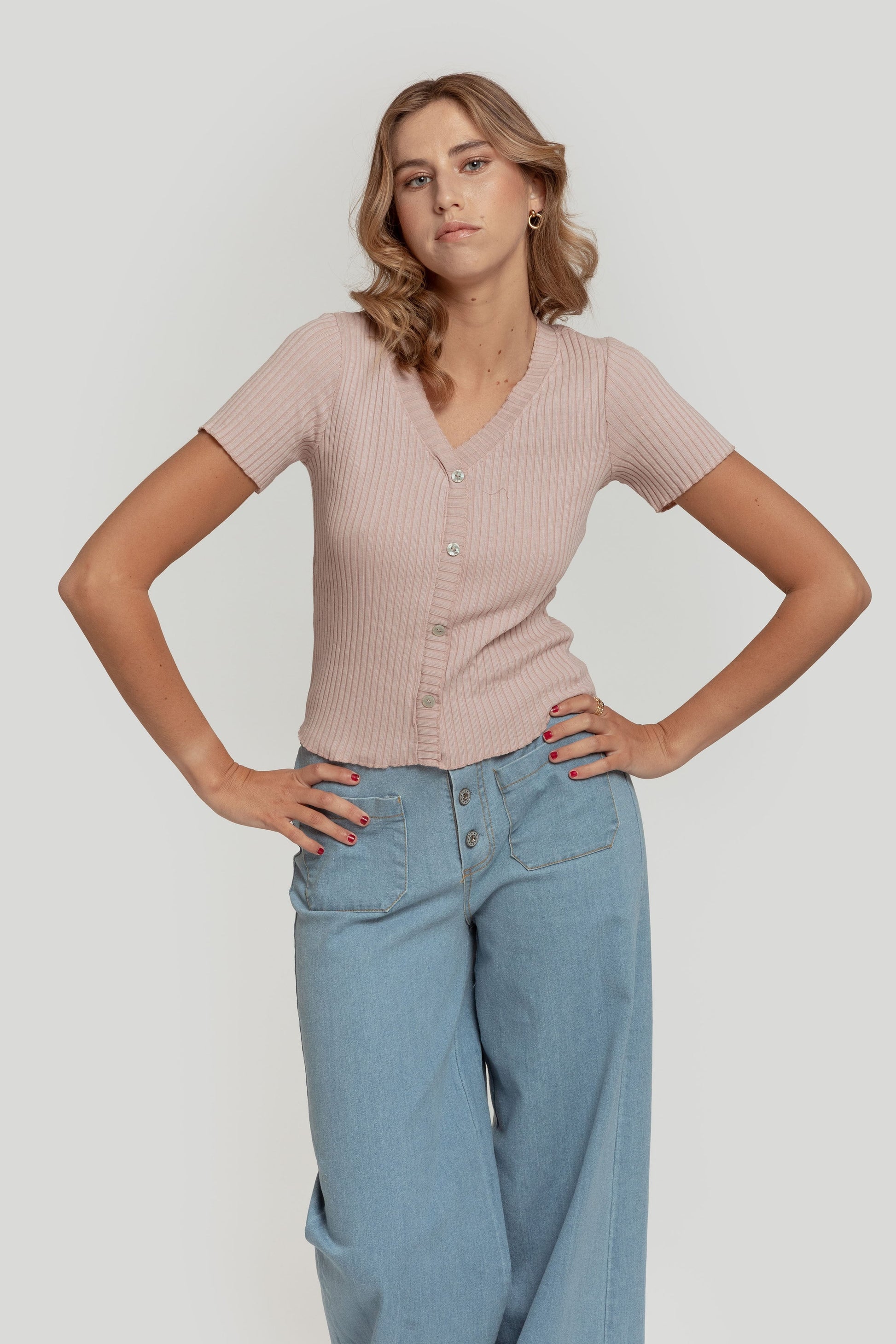Tejido canalé. Diseño ajustado. Diseño recto. Cuello pico. Manga corta. Cierre de botones. Talla modelo: S. Altura modelo: 1,70 m.