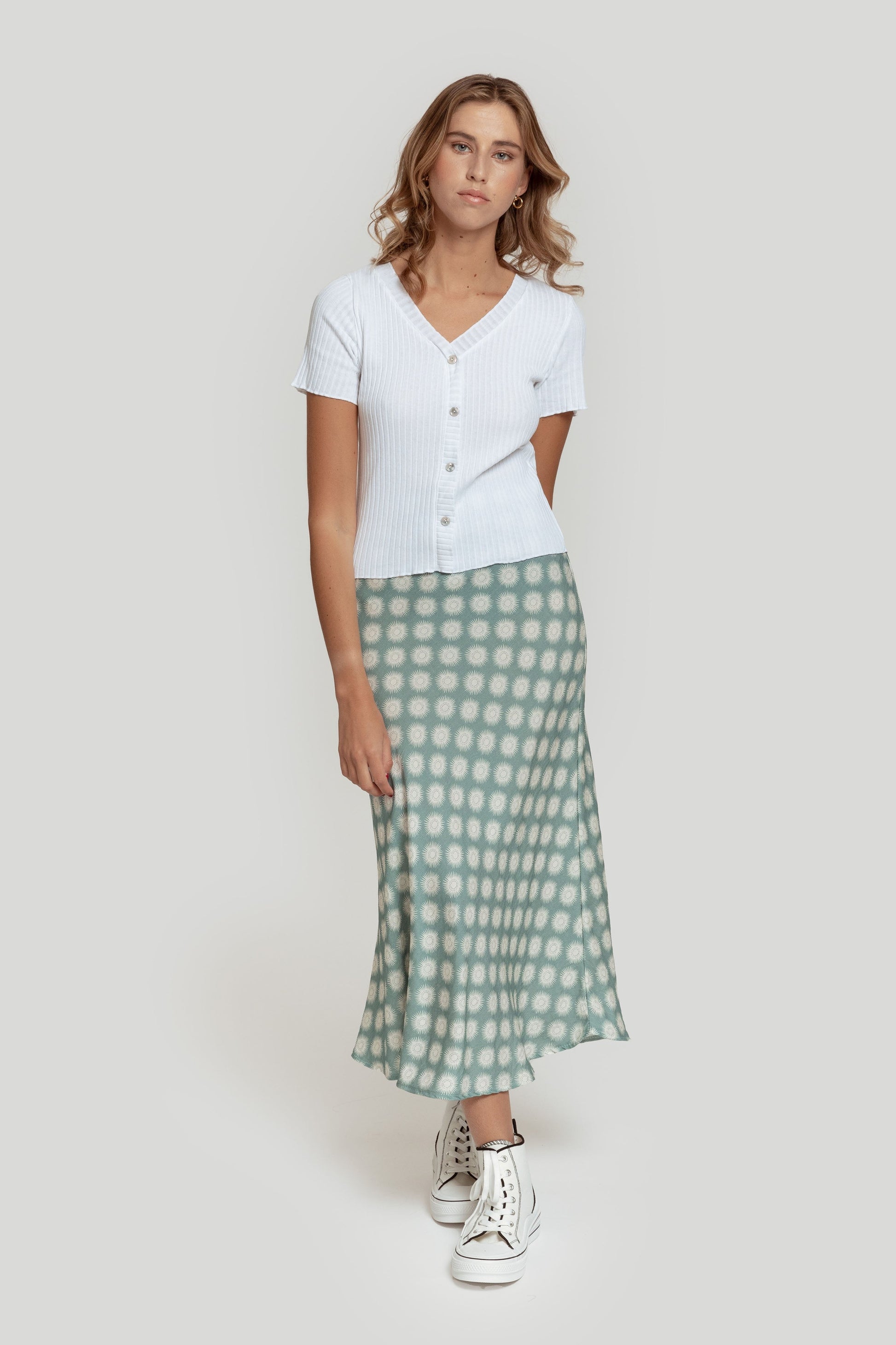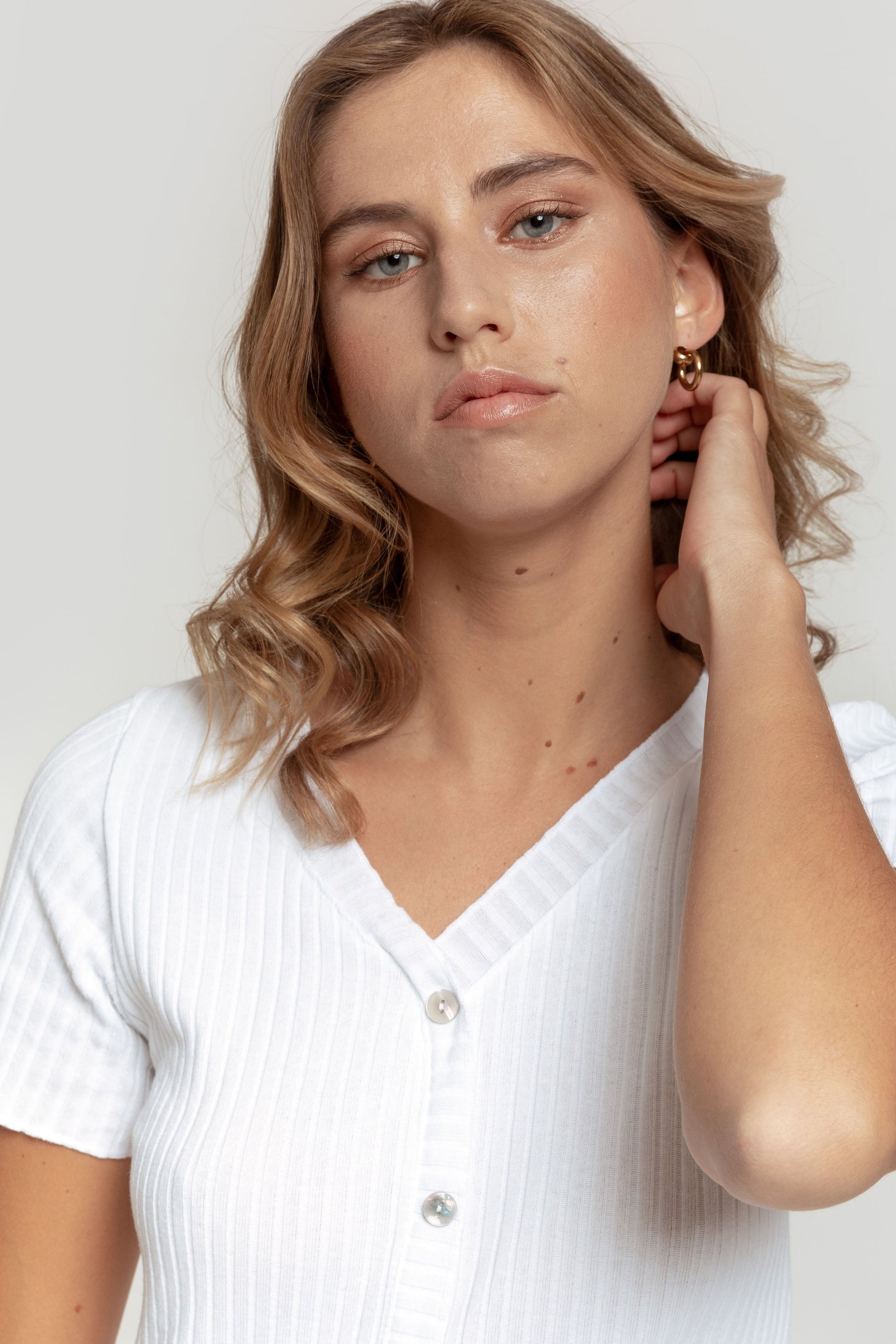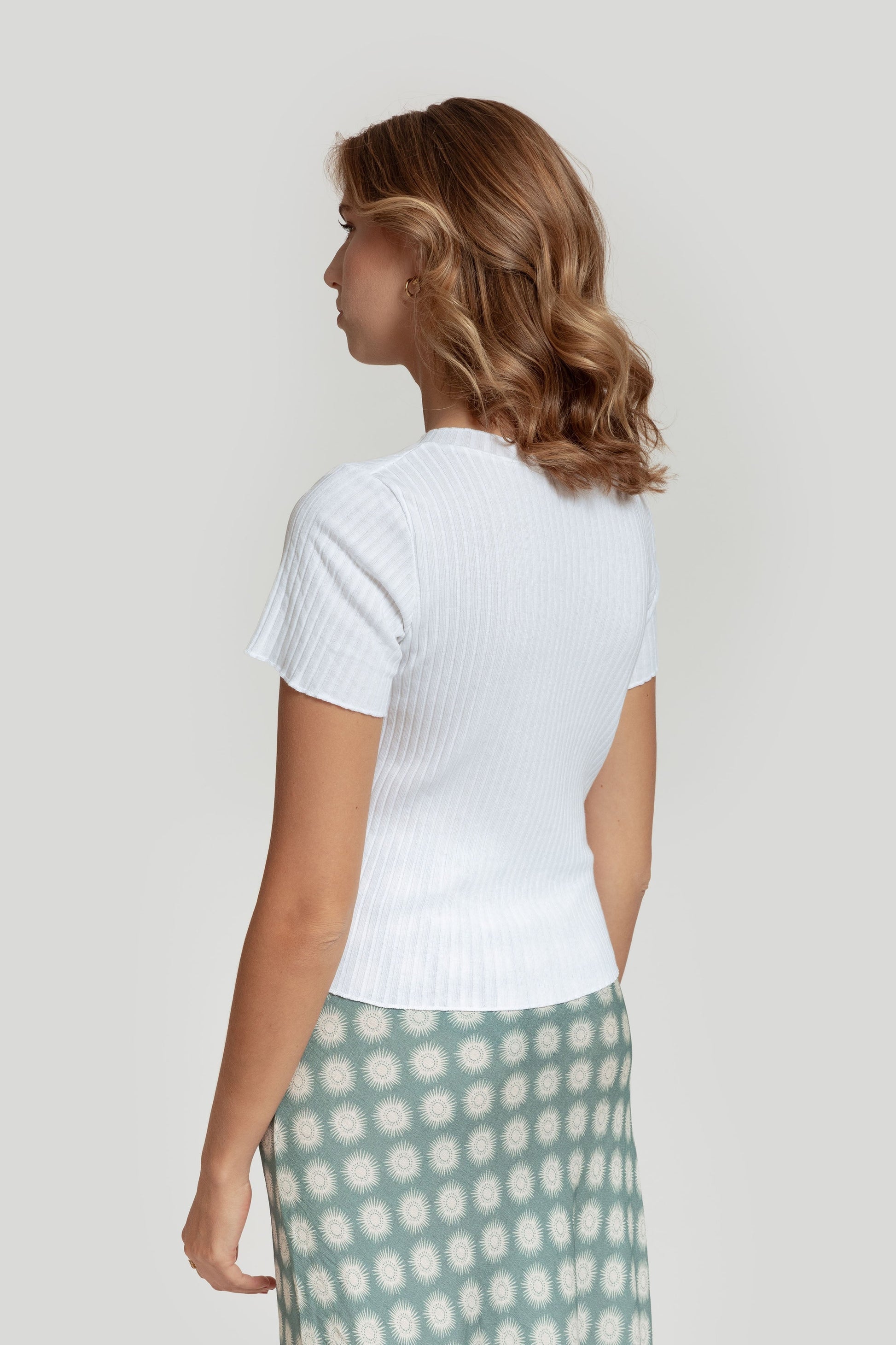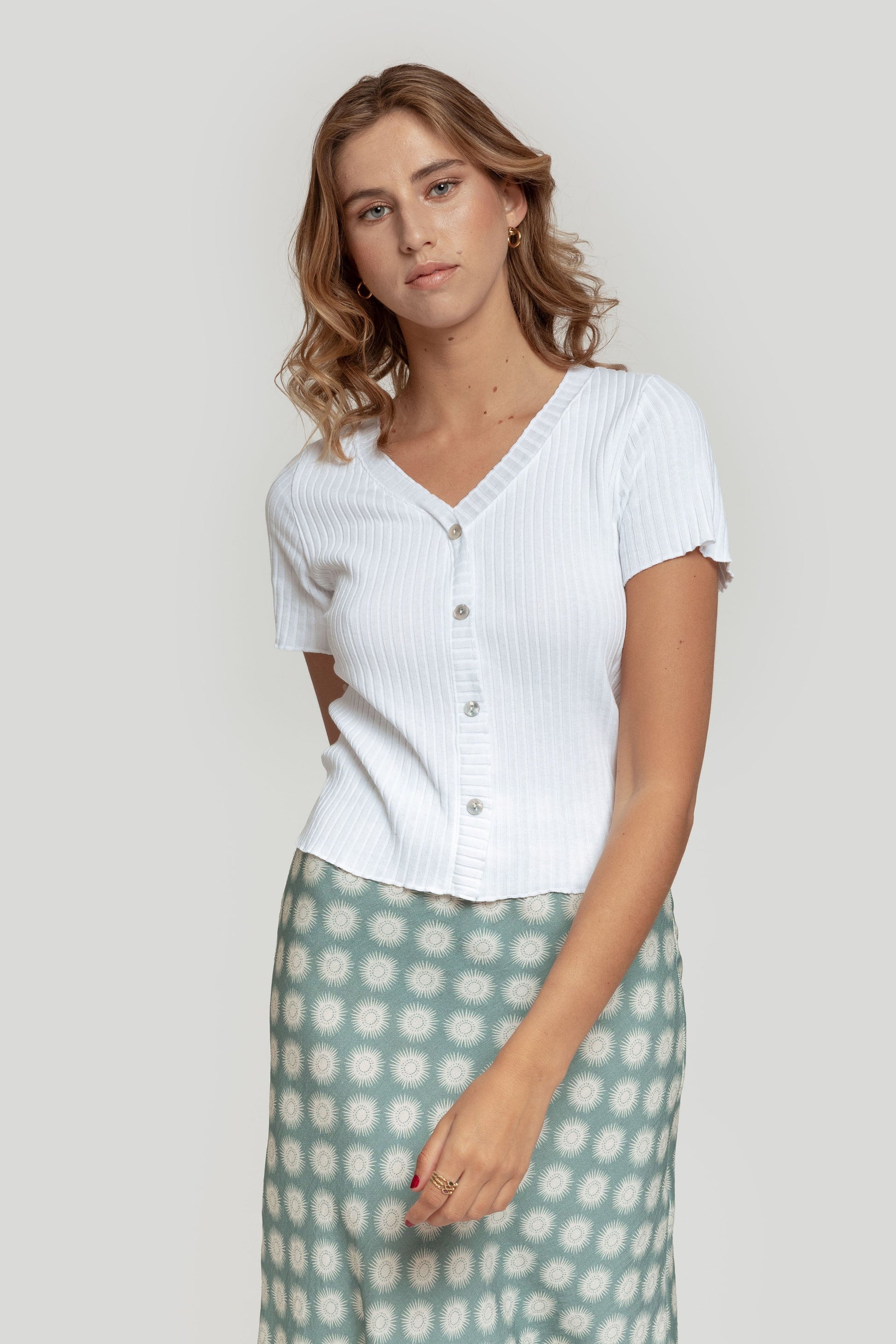 Tejido canalé. Diseño ajustado. Diseño recto. Cuello pico. Manga corta. Cierre de botones. Talla modelo: S. Altura modelo: 1,70 m.