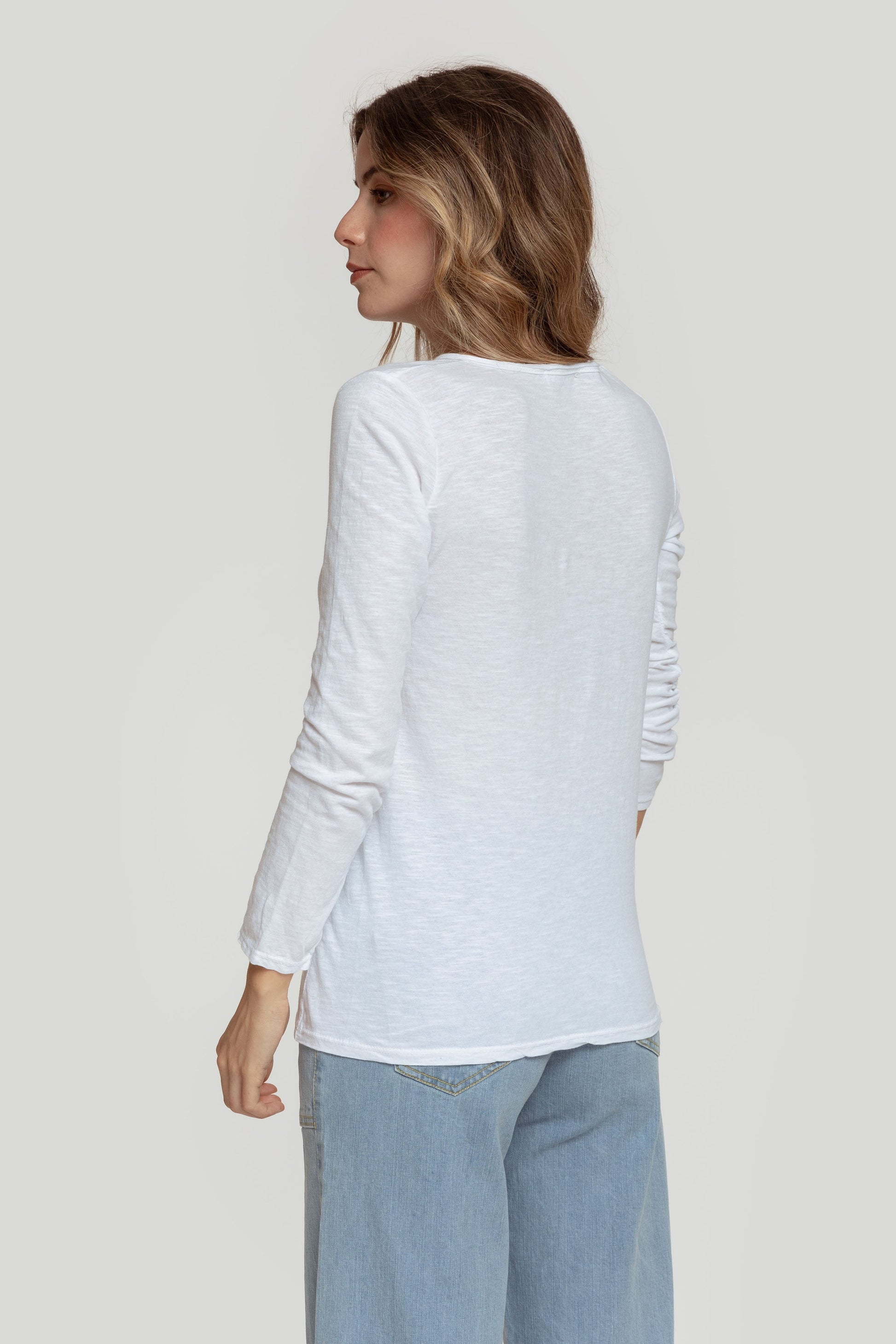 Tejido mezcla de algodón. Diseño recto. Diseño básico. Cuello pico. Manga larga. Serígrafia frontal. Detalles sin rematar. Talla modelo: S. Altura modelo 1, 70 m.
