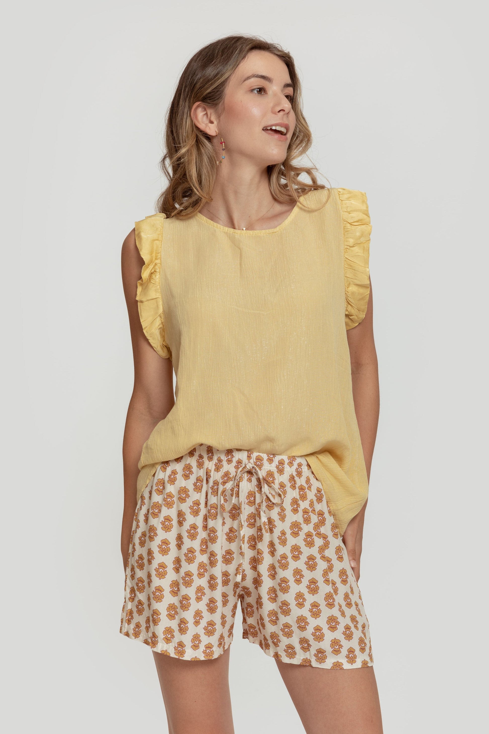 Tejido brillo. Diseño largo. Diseño amplio. Diseño recto. Cuello amplio. Manga sisa. Manga acabado volante. Cierre de botones trasero. Talla modelo: S. Altura modelo: 1,70 m.