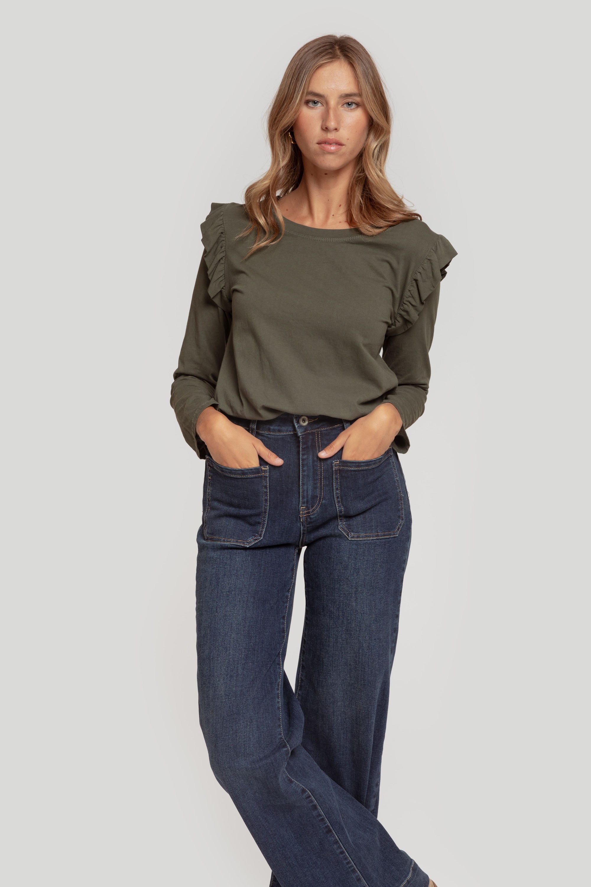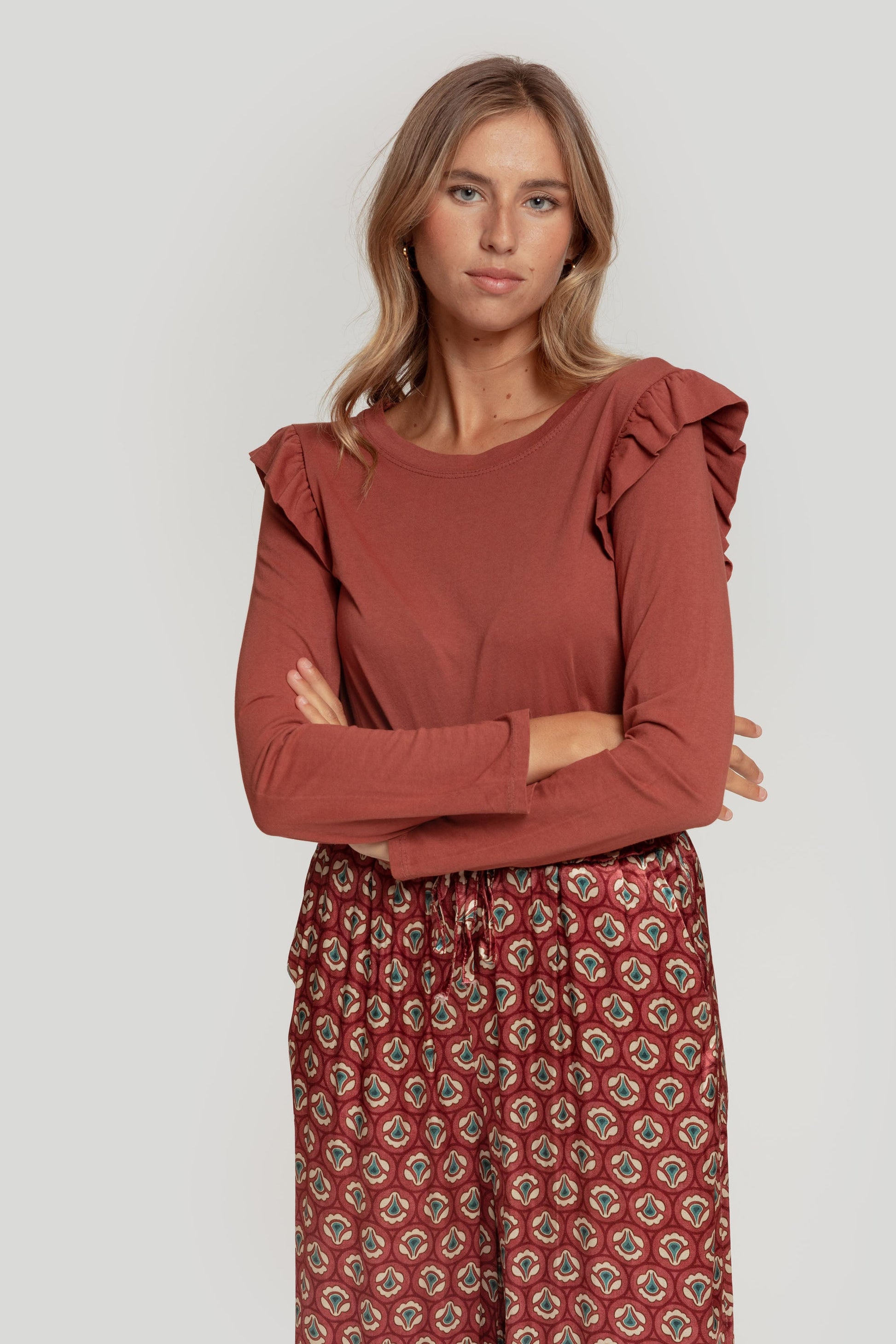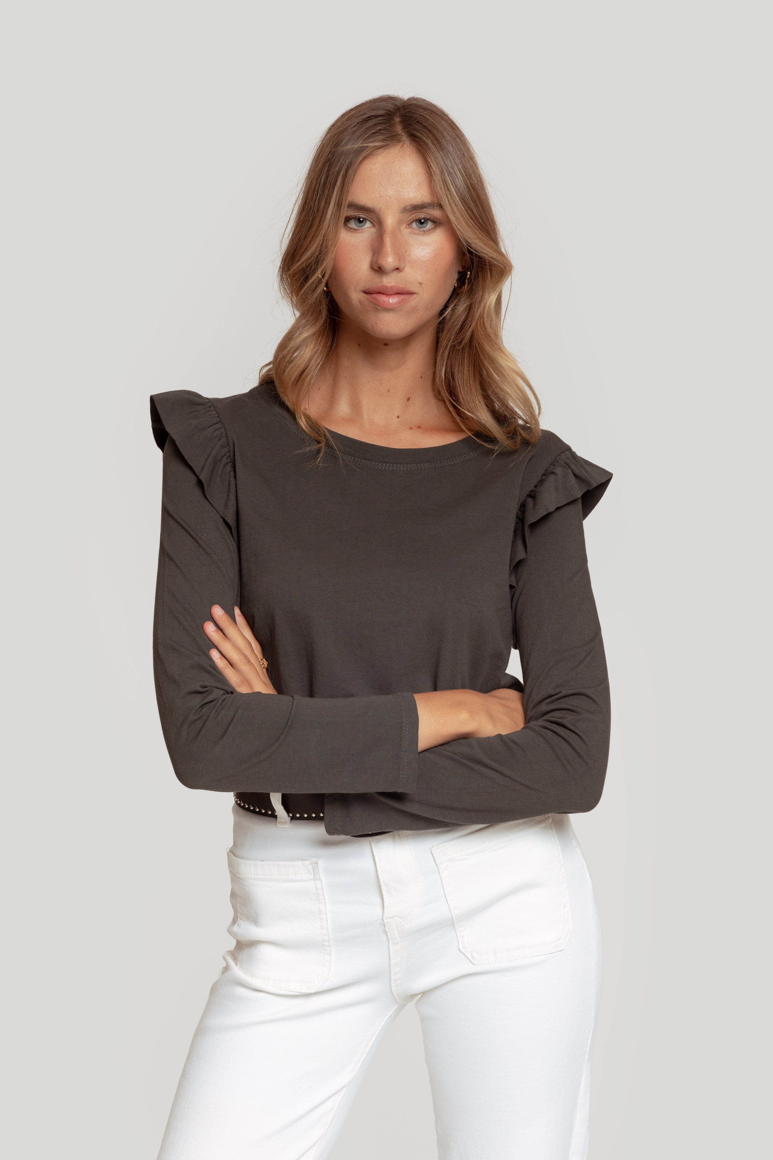 Tejido mezcla de algodón. Diseño recto. Cuello redondo. Manga larga. Detalle volante.