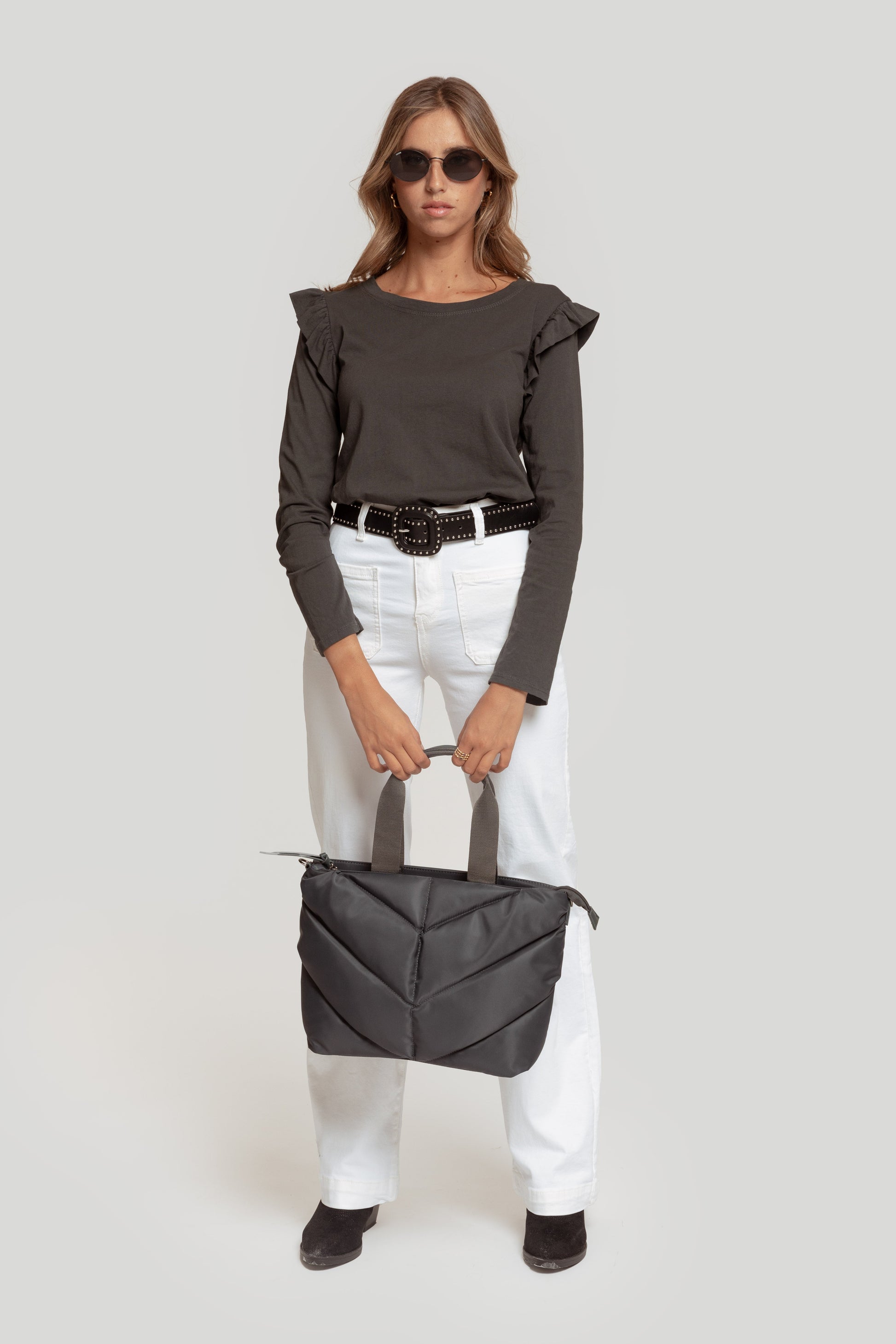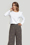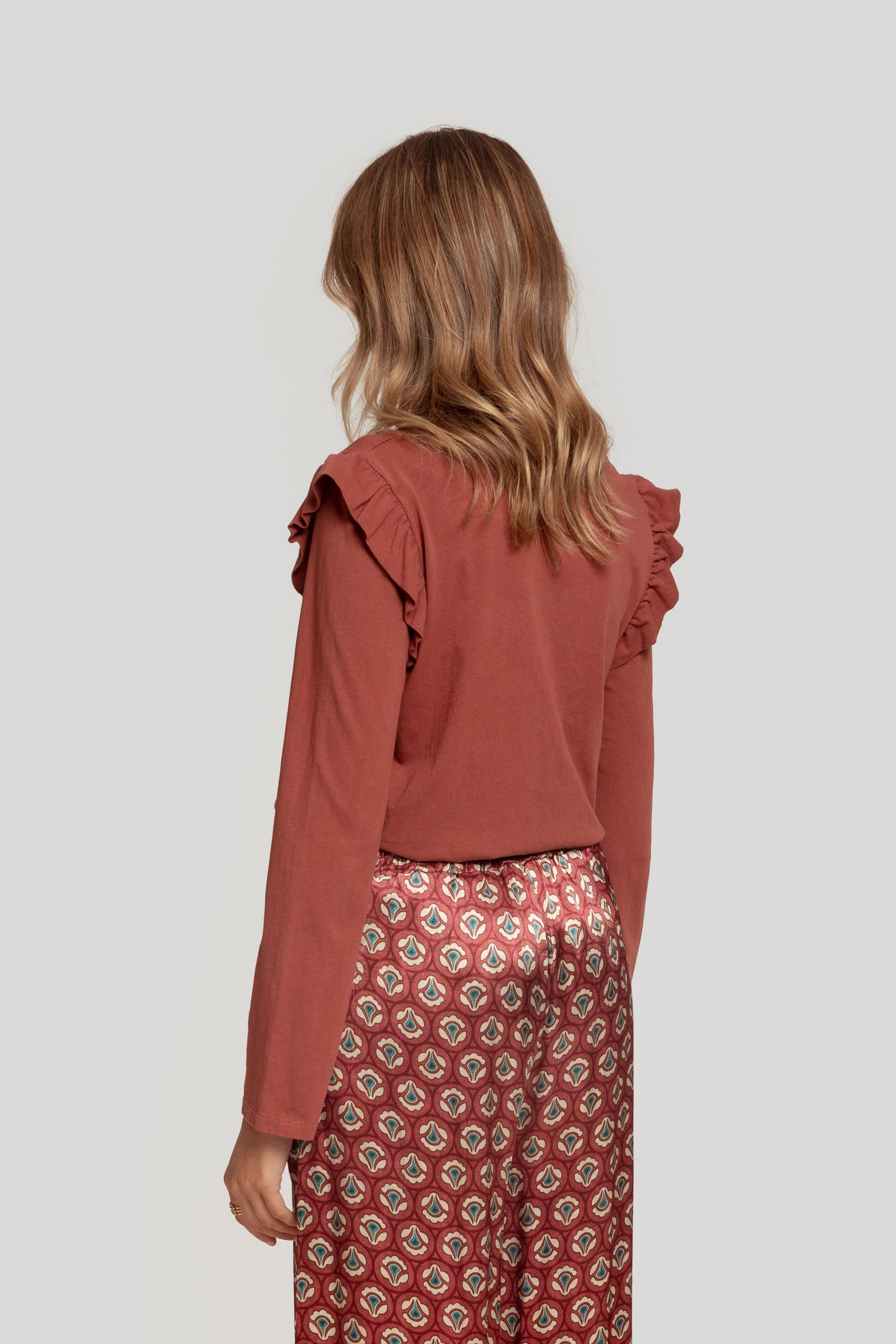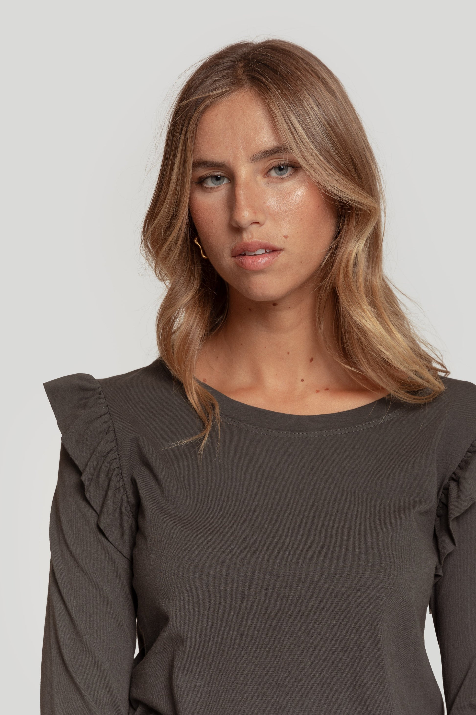 Tejido mezcla de algodón. Diseño recto. Cuello redondo. Manga larga. Detalle volante.