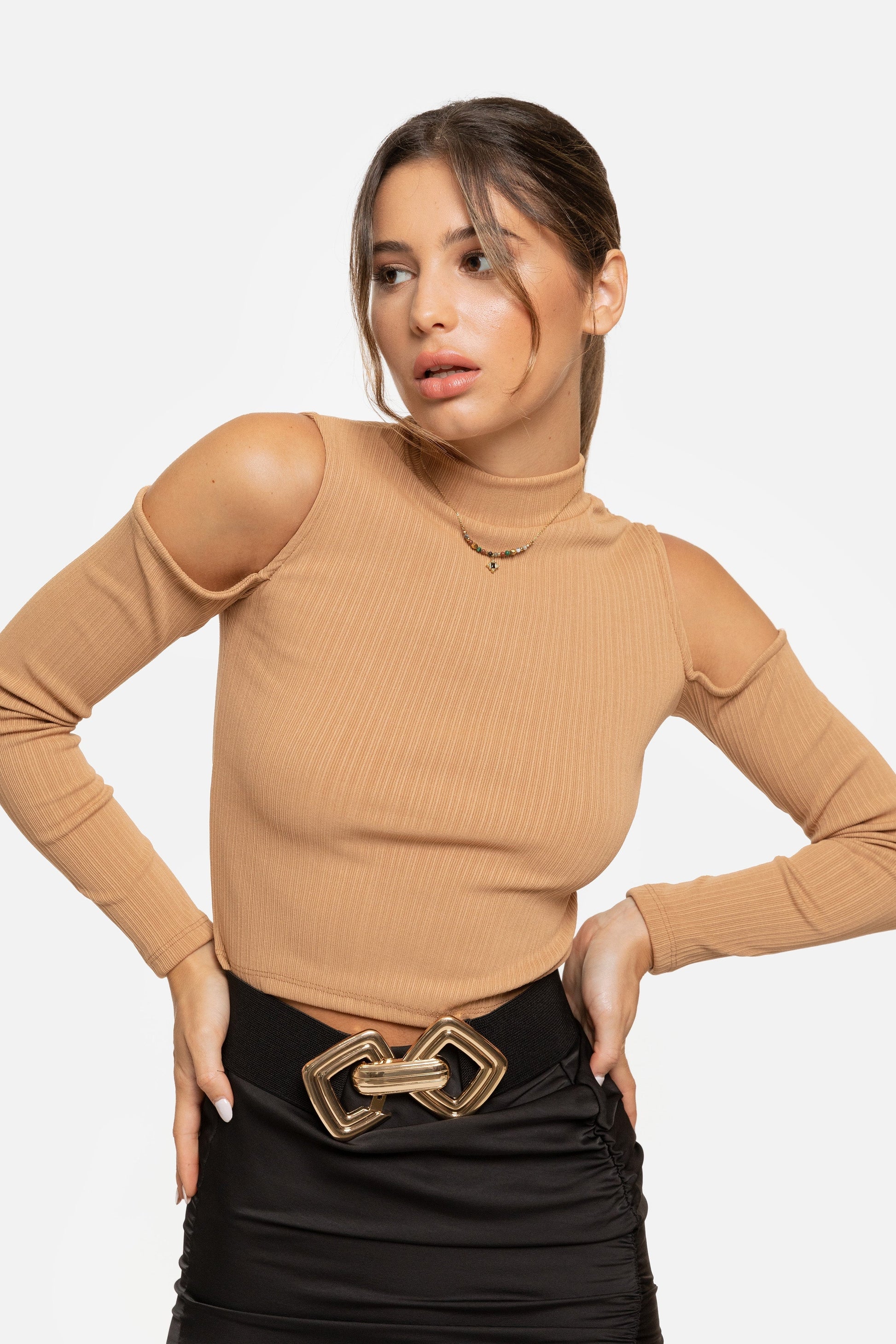 Top de canalé. Diseño ajustado. Cuello perkins. Manga larga con detalles cut out. Corte recto. Talla modelo: S. Altura modelo: 1,76 m.