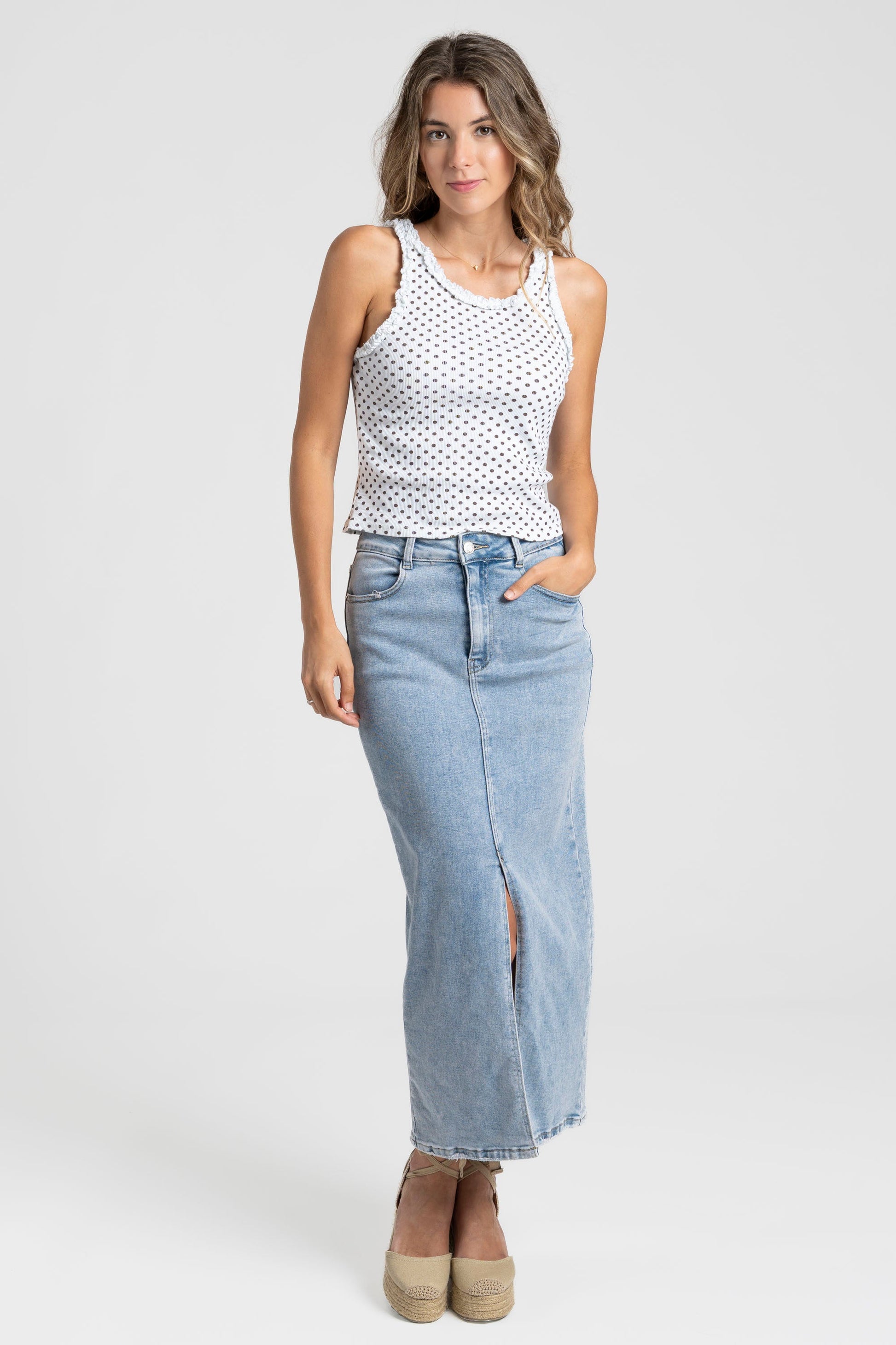 Tejido de algodón. Tirantes anchos. Cuello redondo. Diseño estampado lunares.