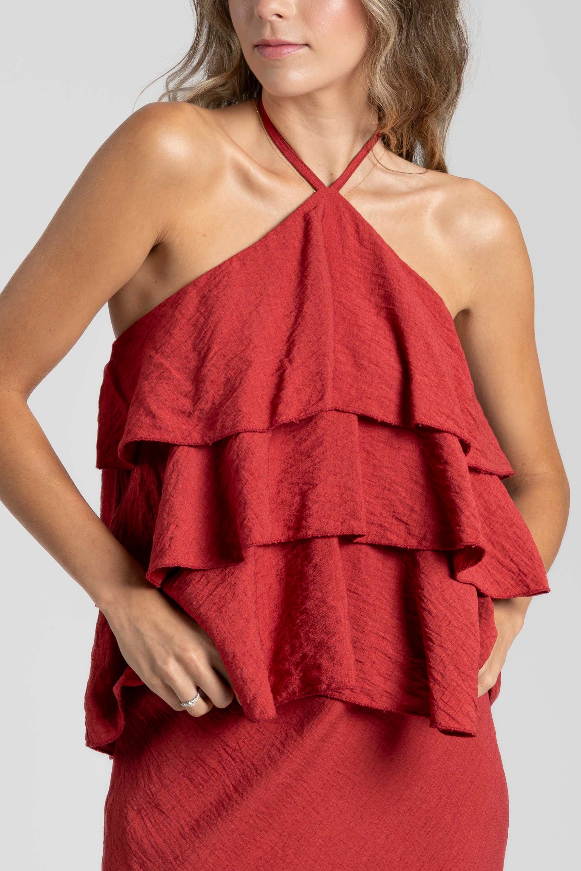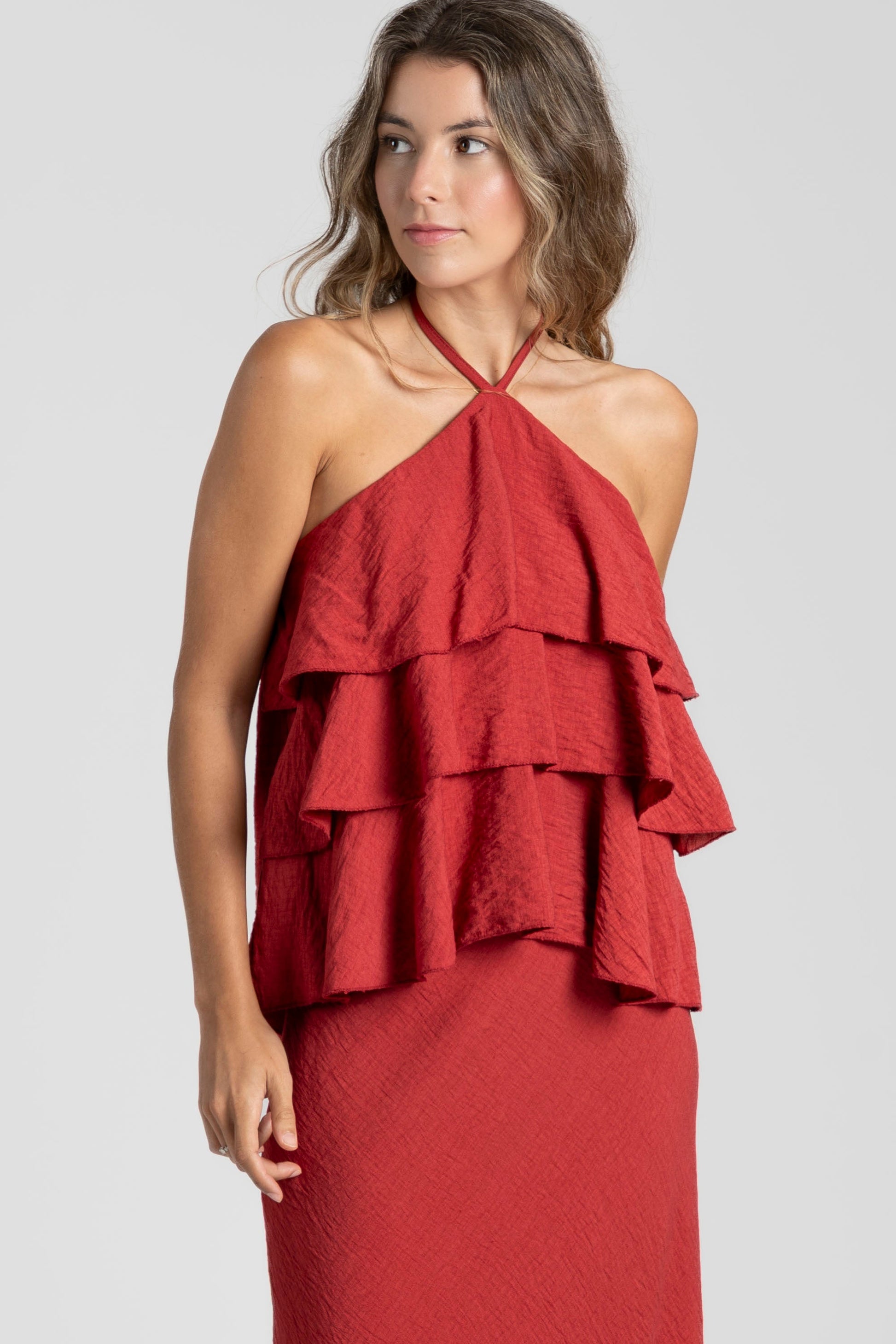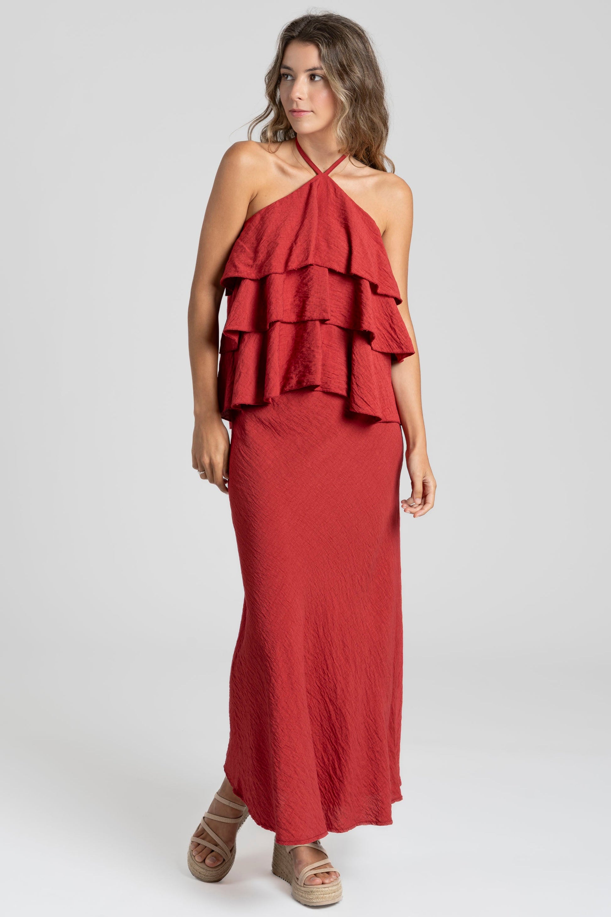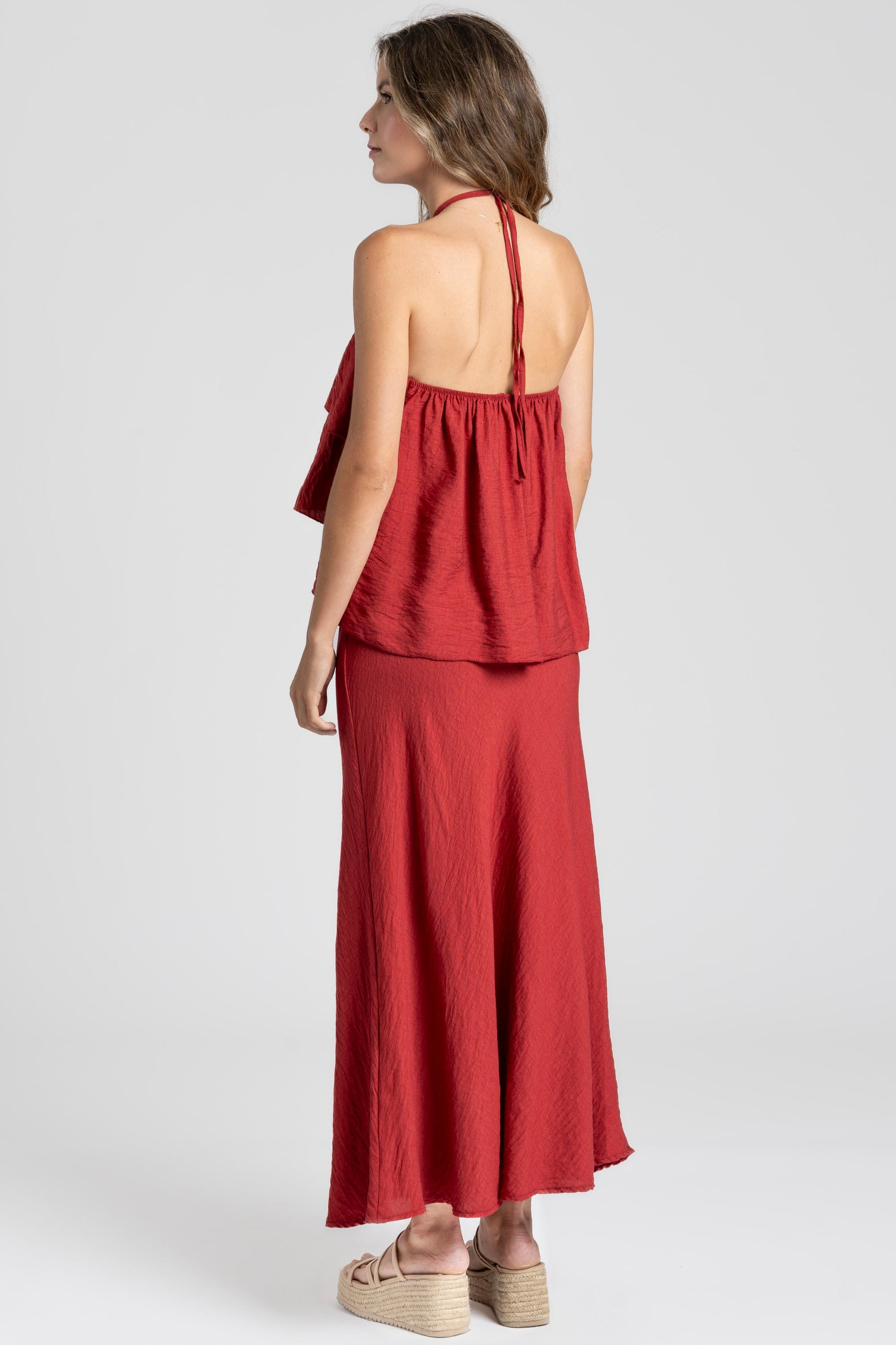 Tejido fluido. Top volantes. Cuello halter. Tirantes finos. Falda diseño midi. Diseño vuelo. Diseño largo. Cintura elástica.