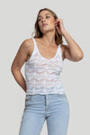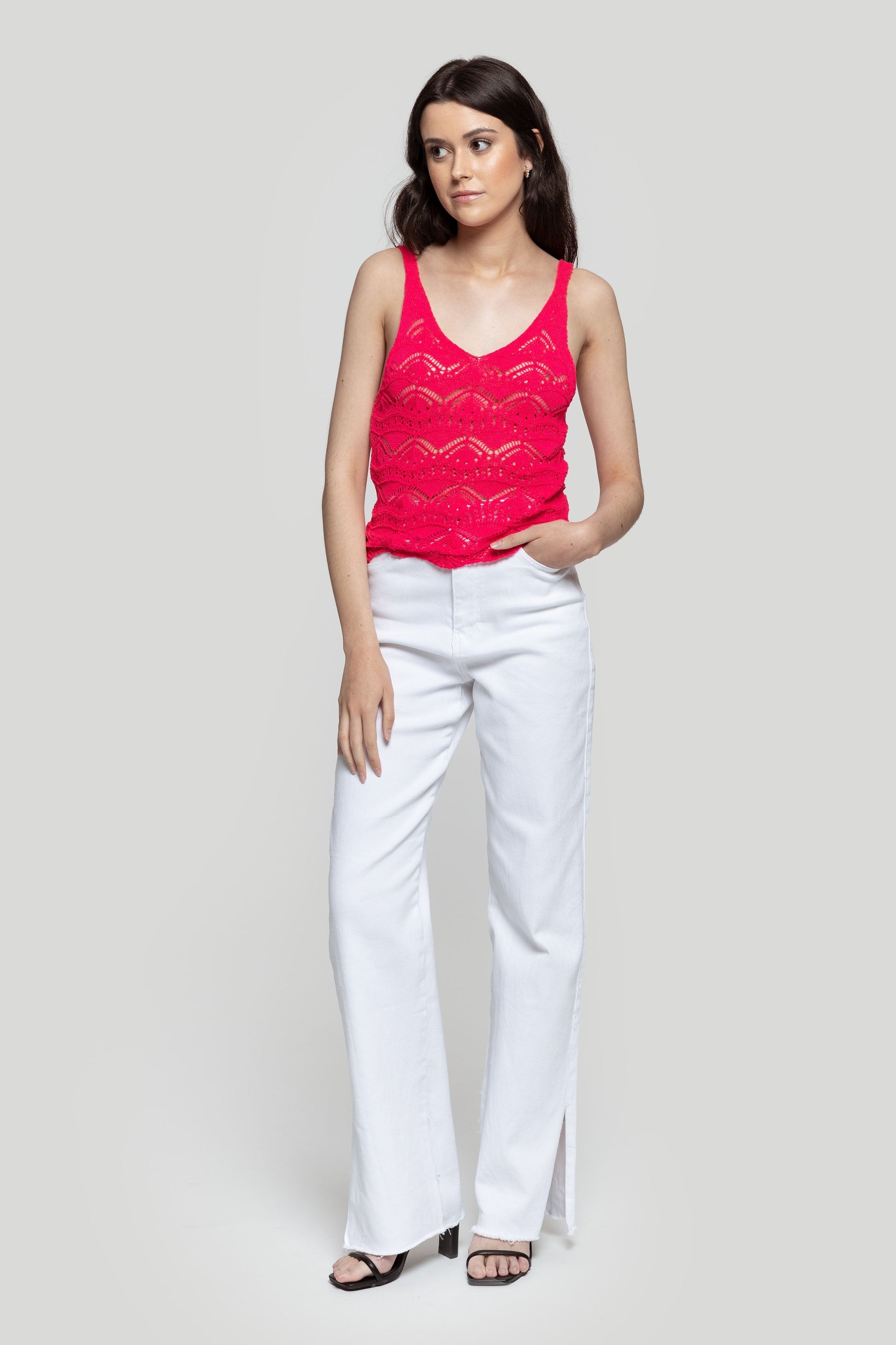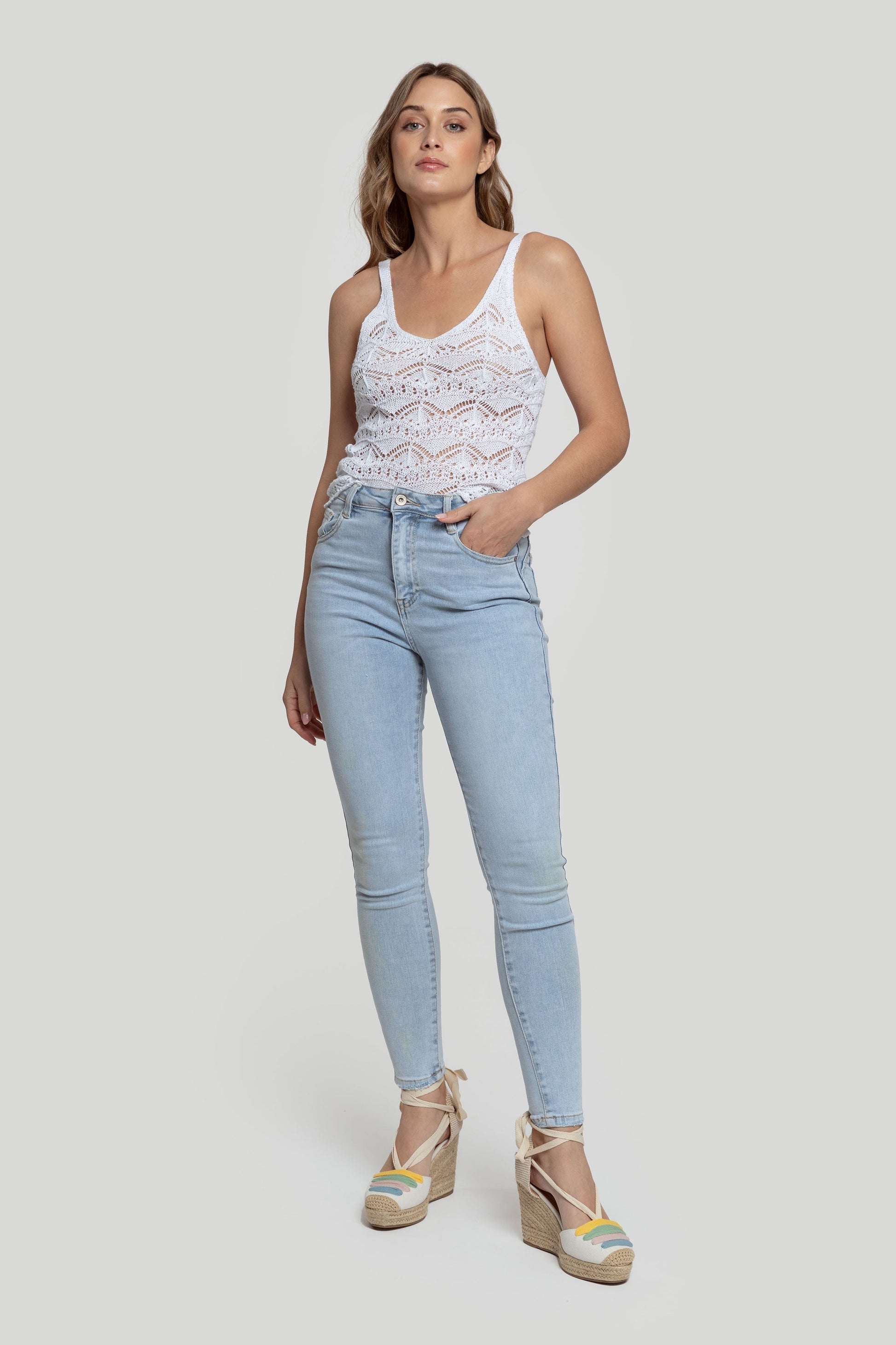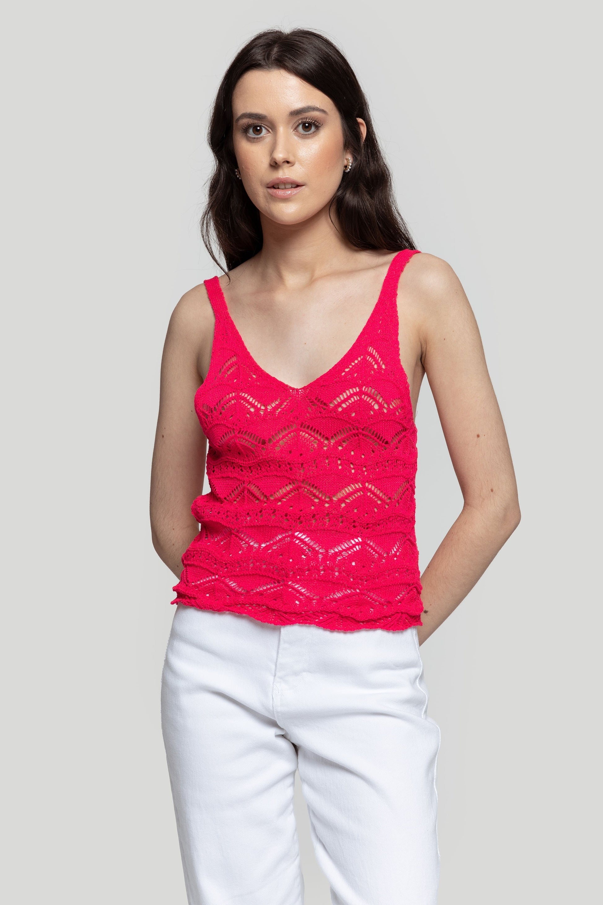 Tejido de algodón. Tejido de punto fino. Diseño entallado. Detalles calados. Cuello redondo. Tirantes anchos. Sin cierre. Talla modelo: S. Altura modelo: 1,66 m.