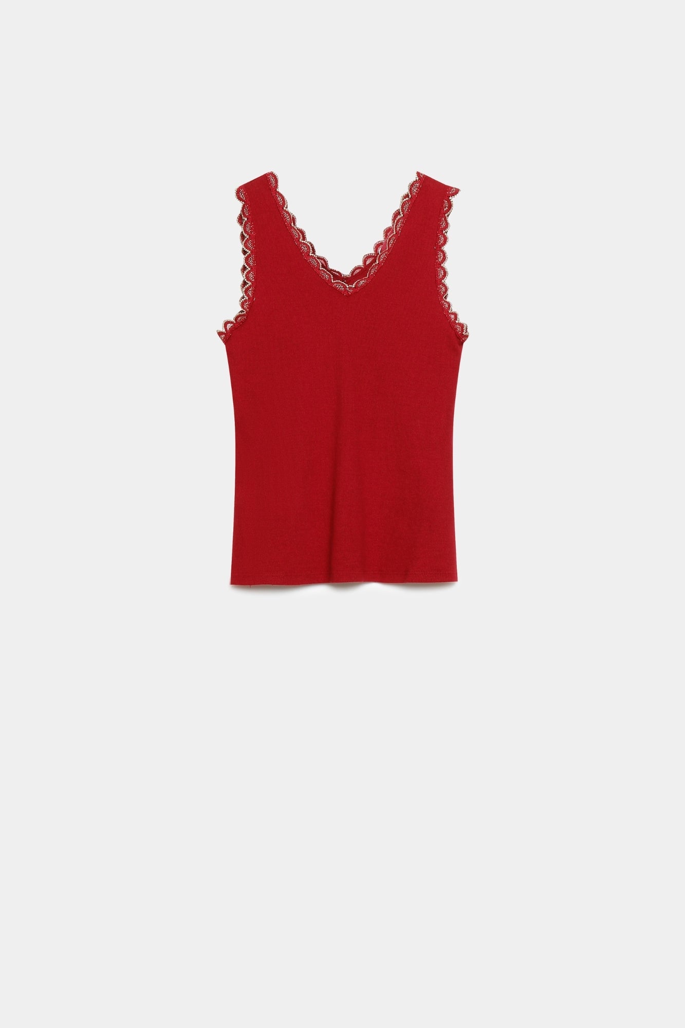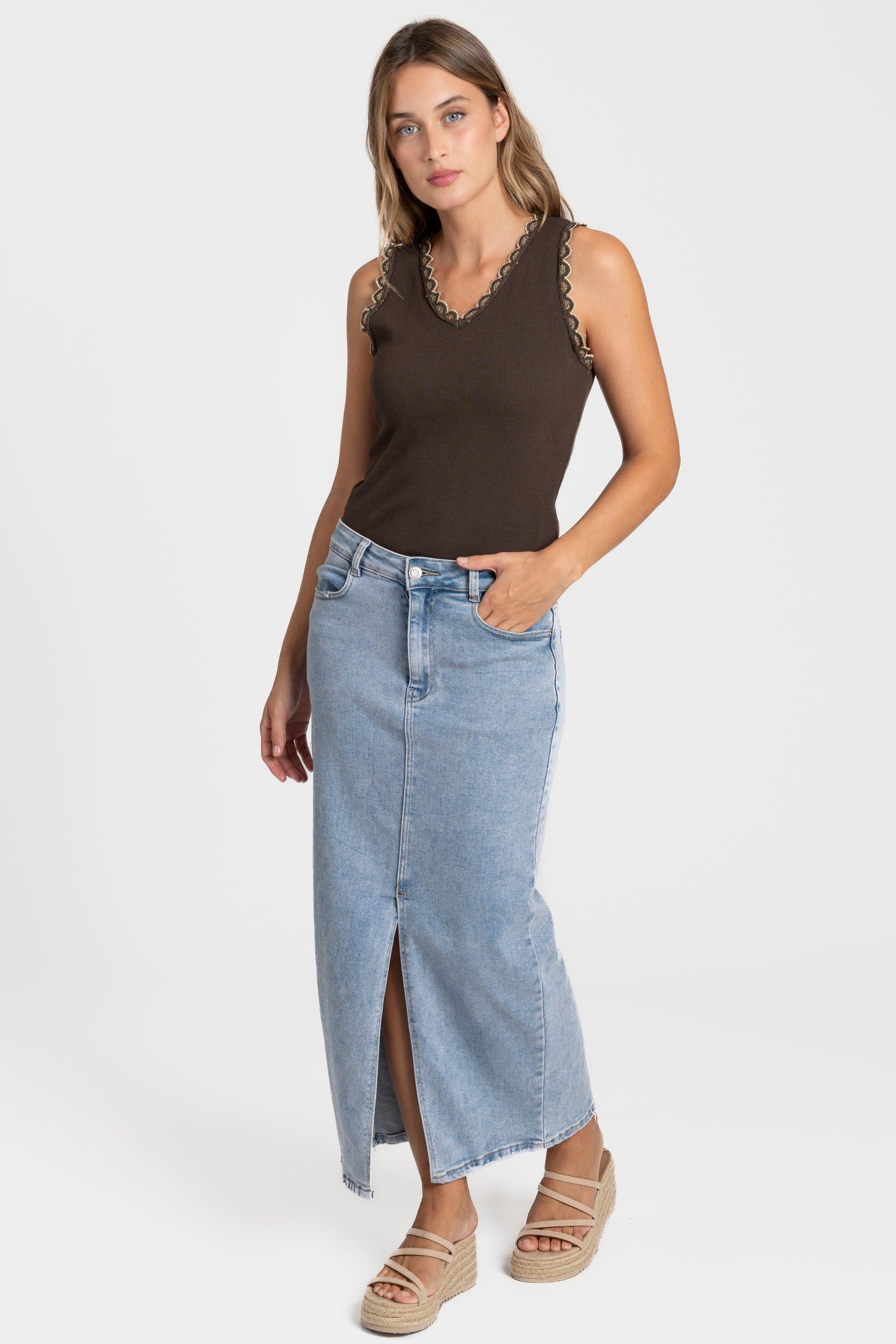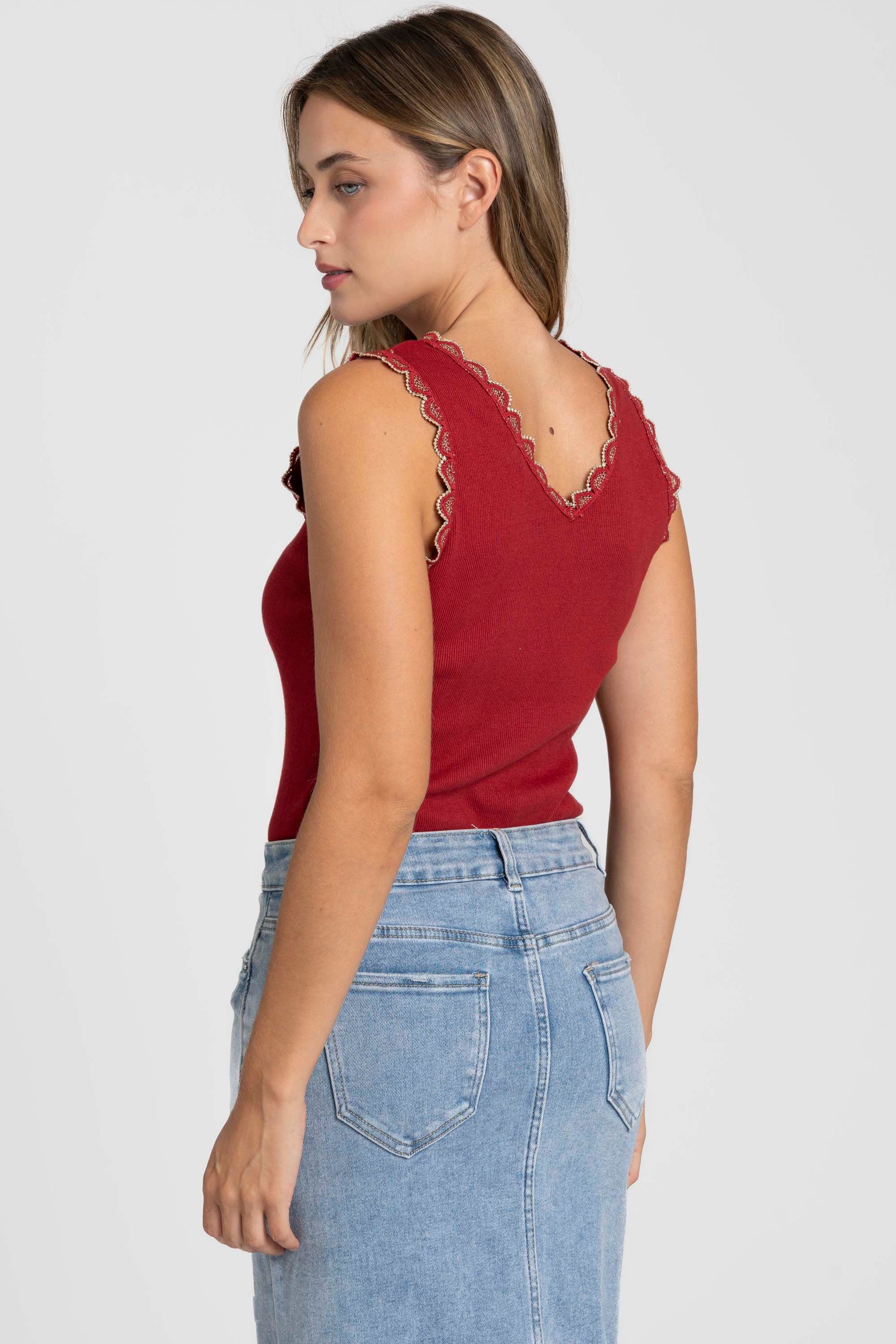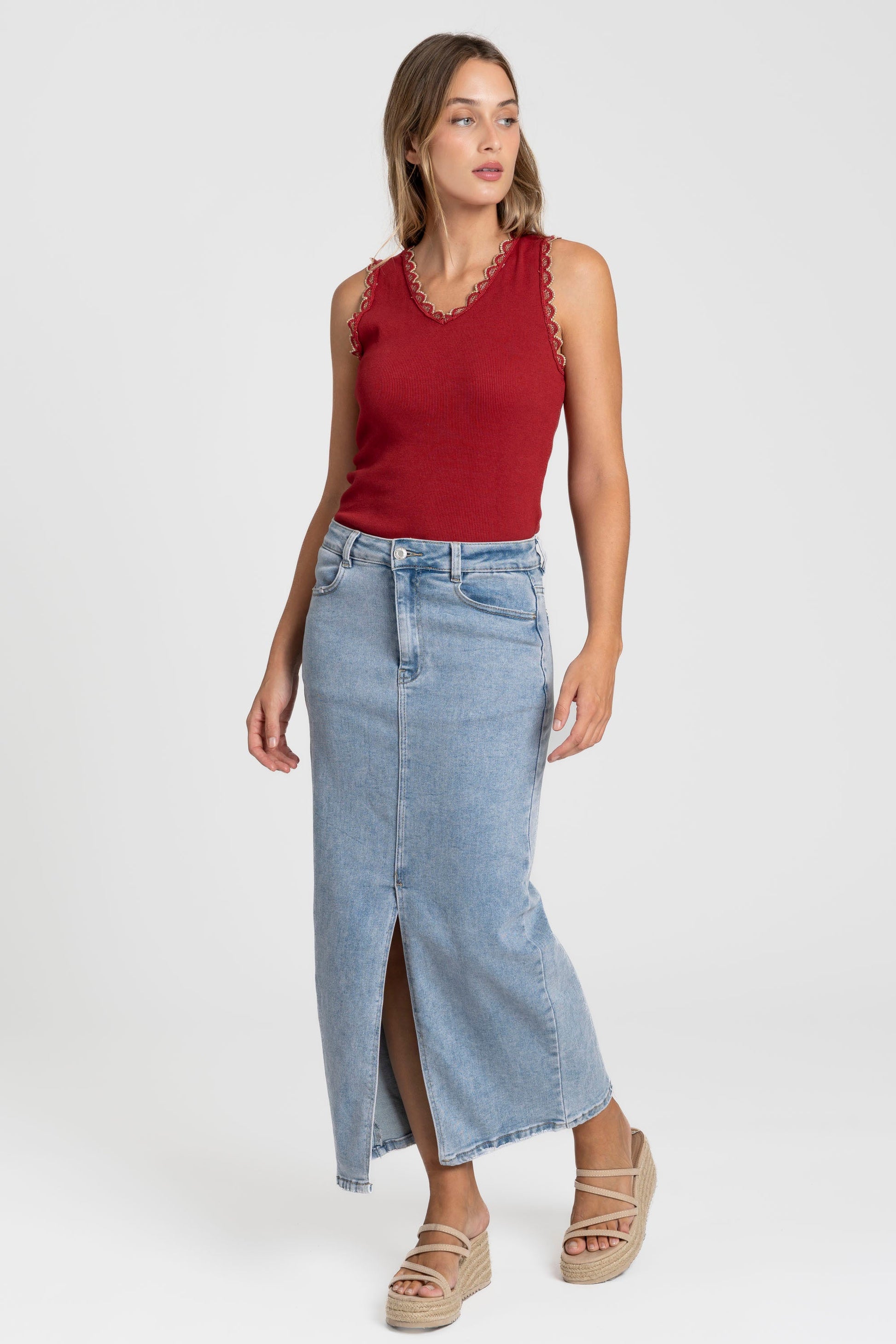 Tejido mezcla algodón. Escote pico. Manga sisa. Detalle bordados.