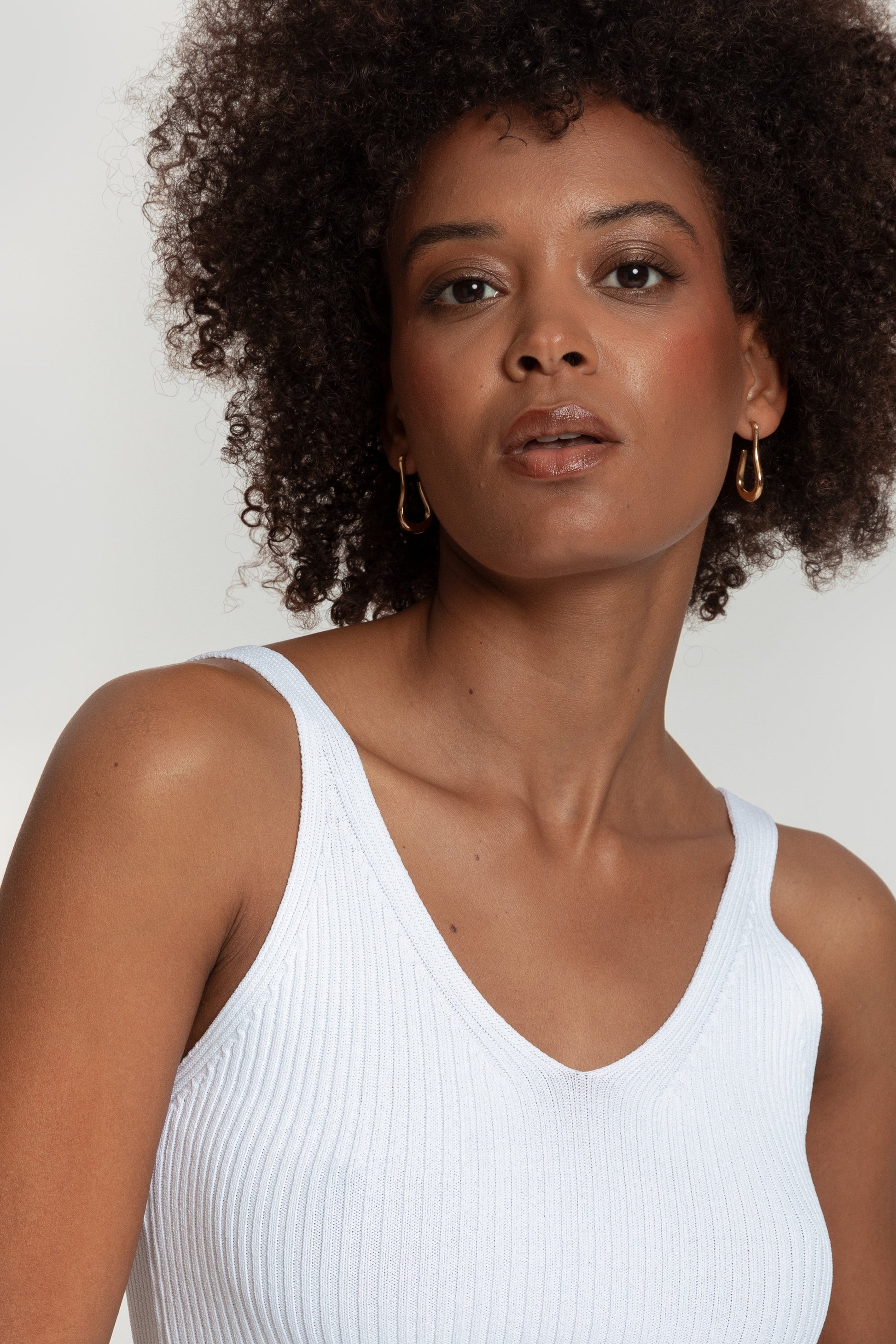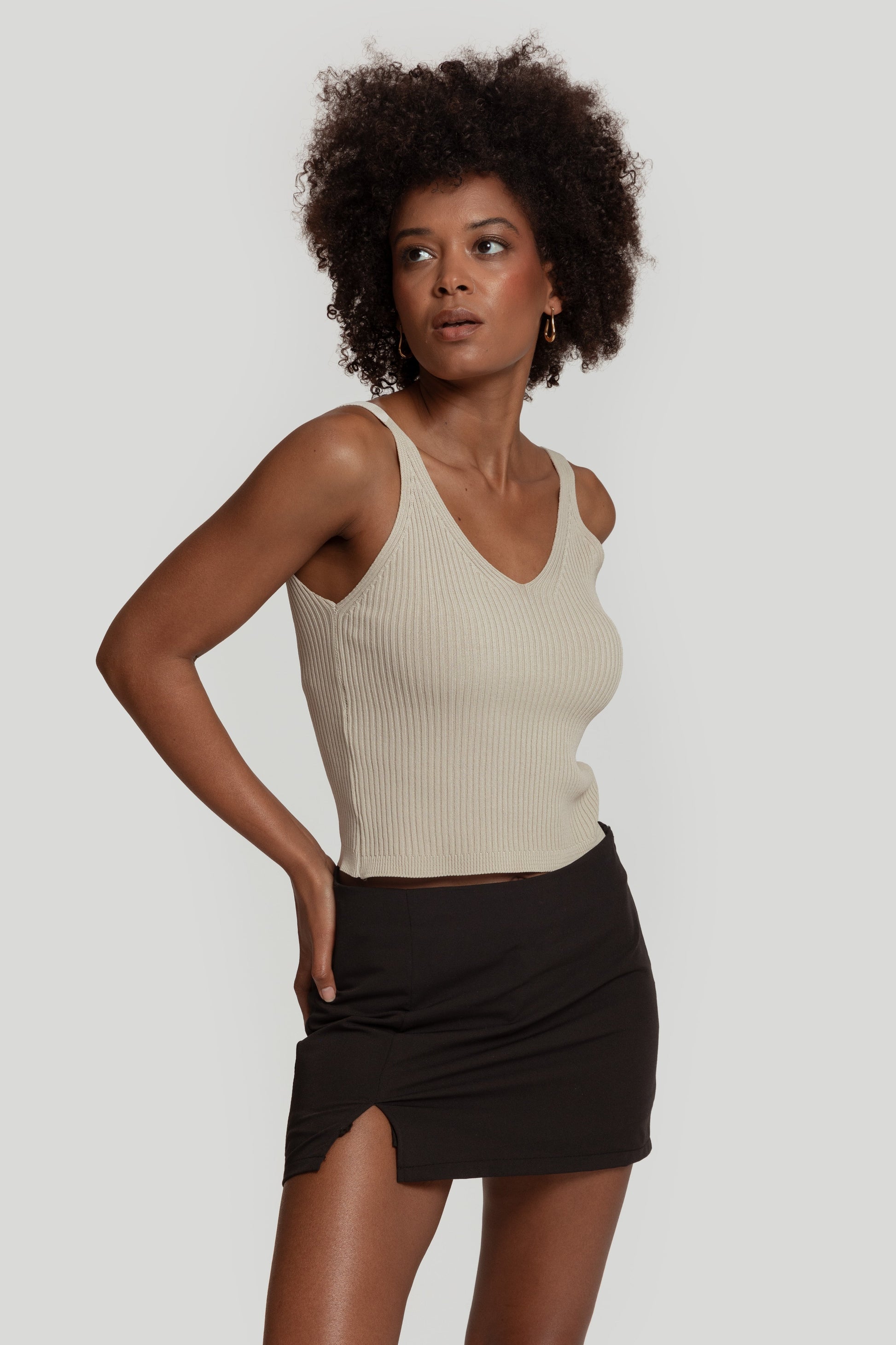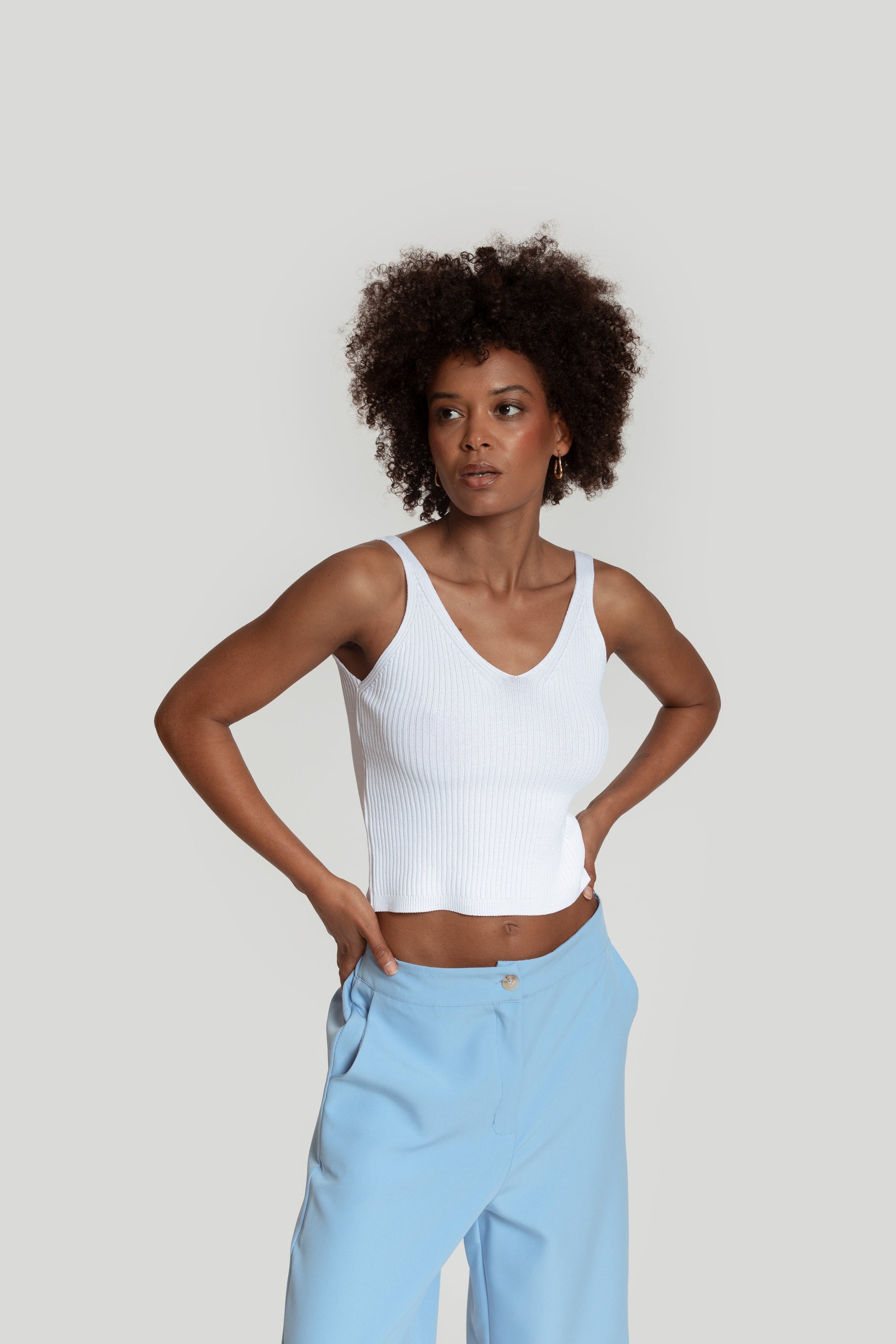 Tejido canalé. Diseño crop. Diseño recto. Diseño ajustado. Escote pico. Manga tirantes. Tirantes anchos. Talla modelo: S. Altura modelo: 1,66 m.