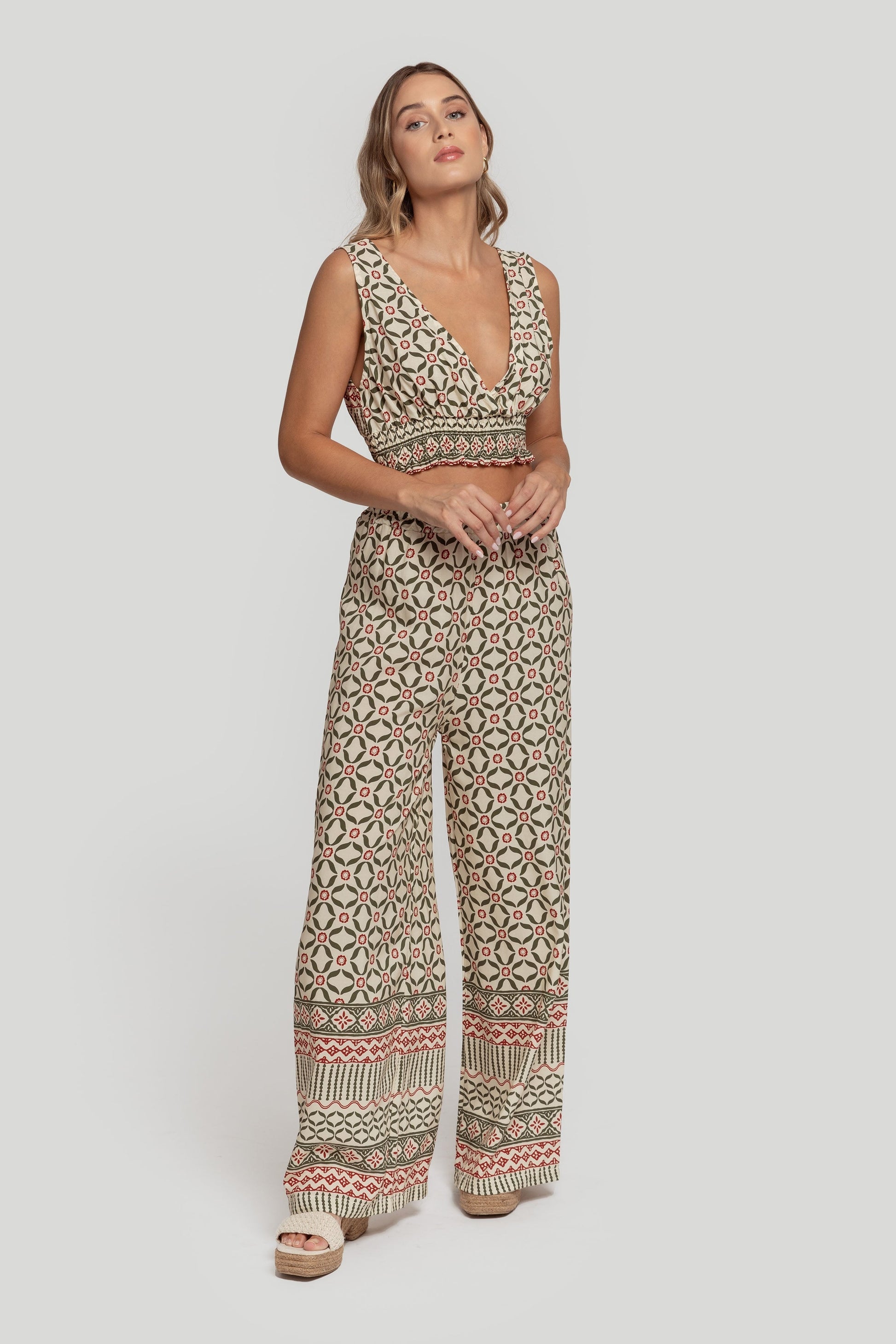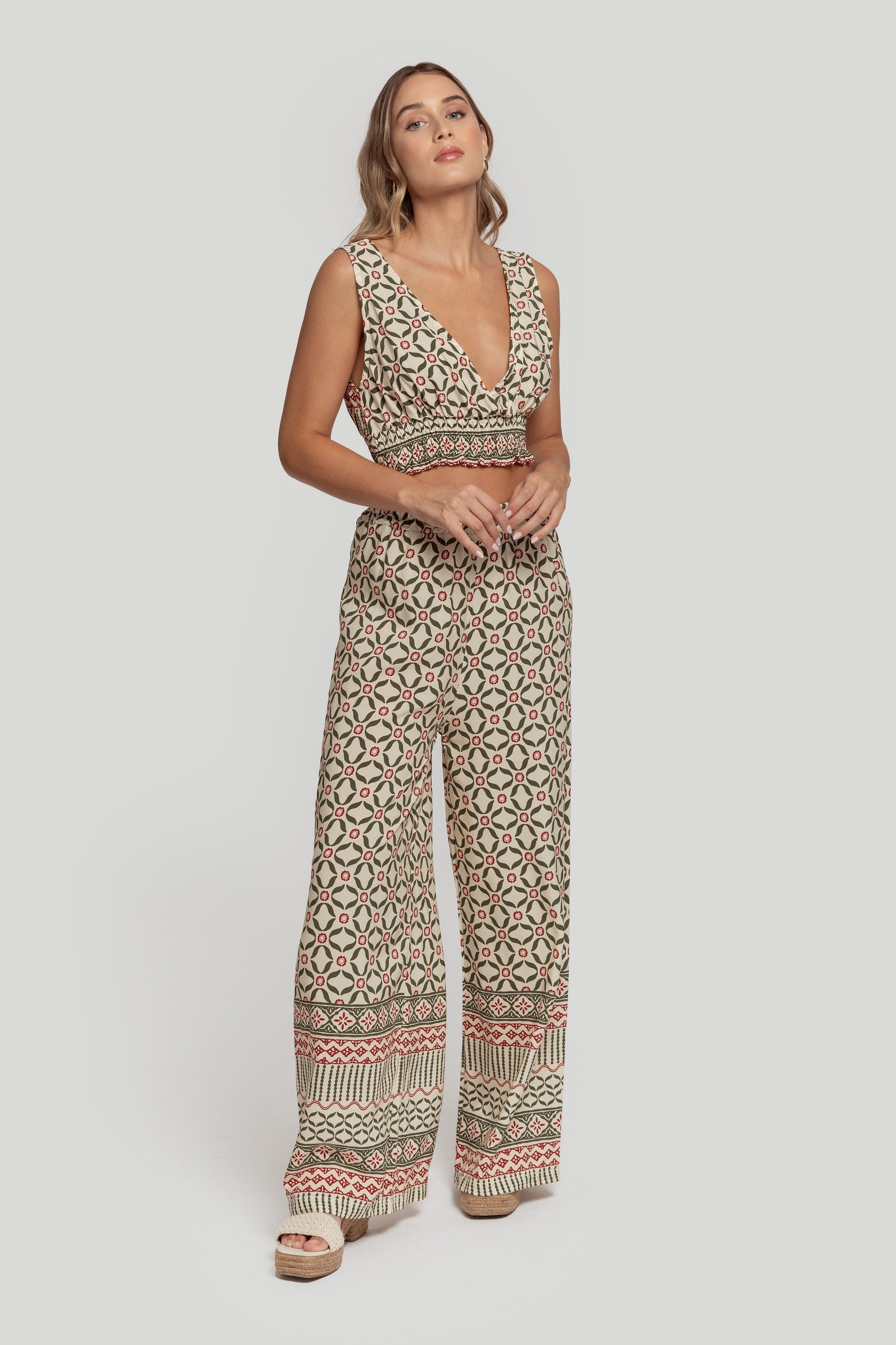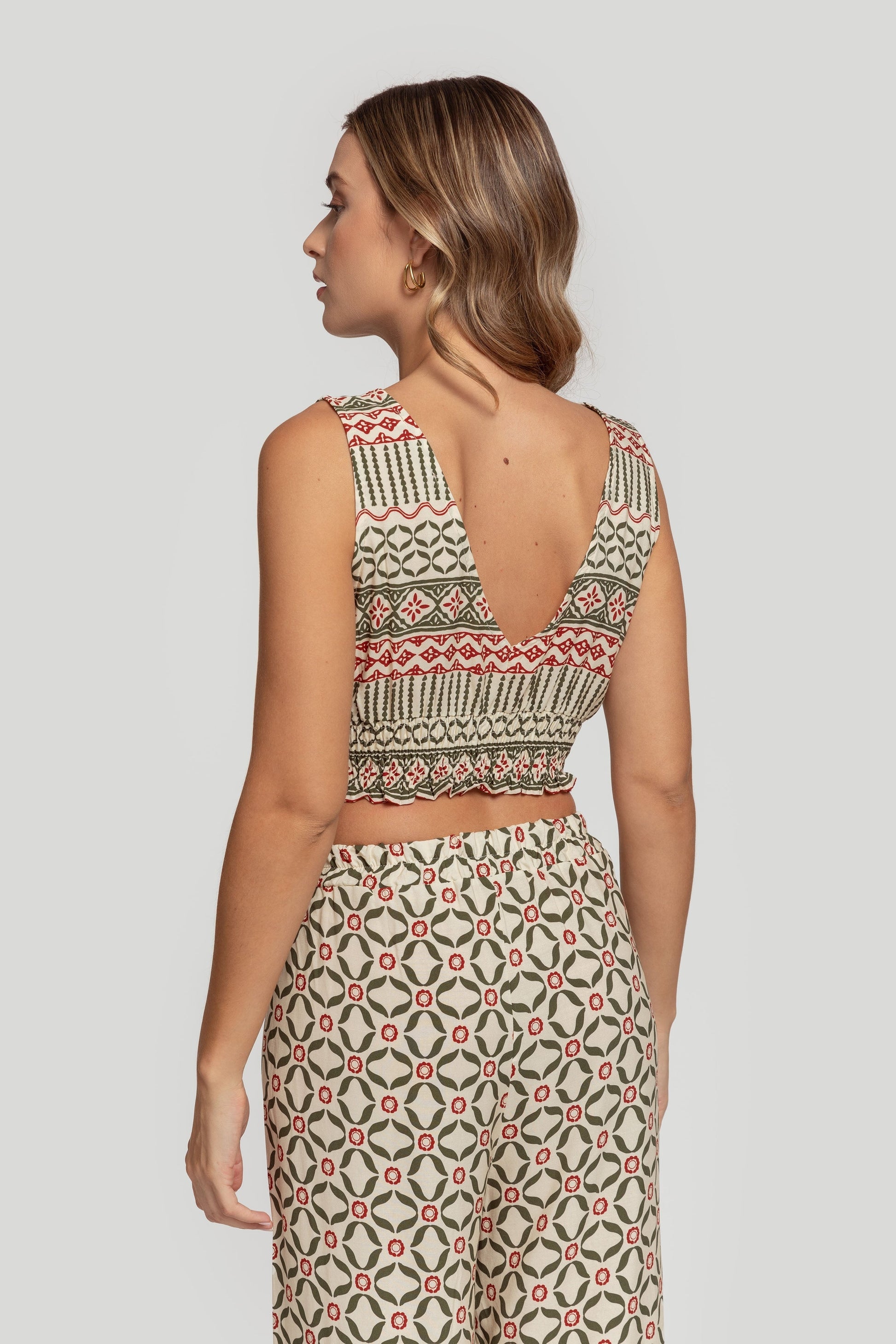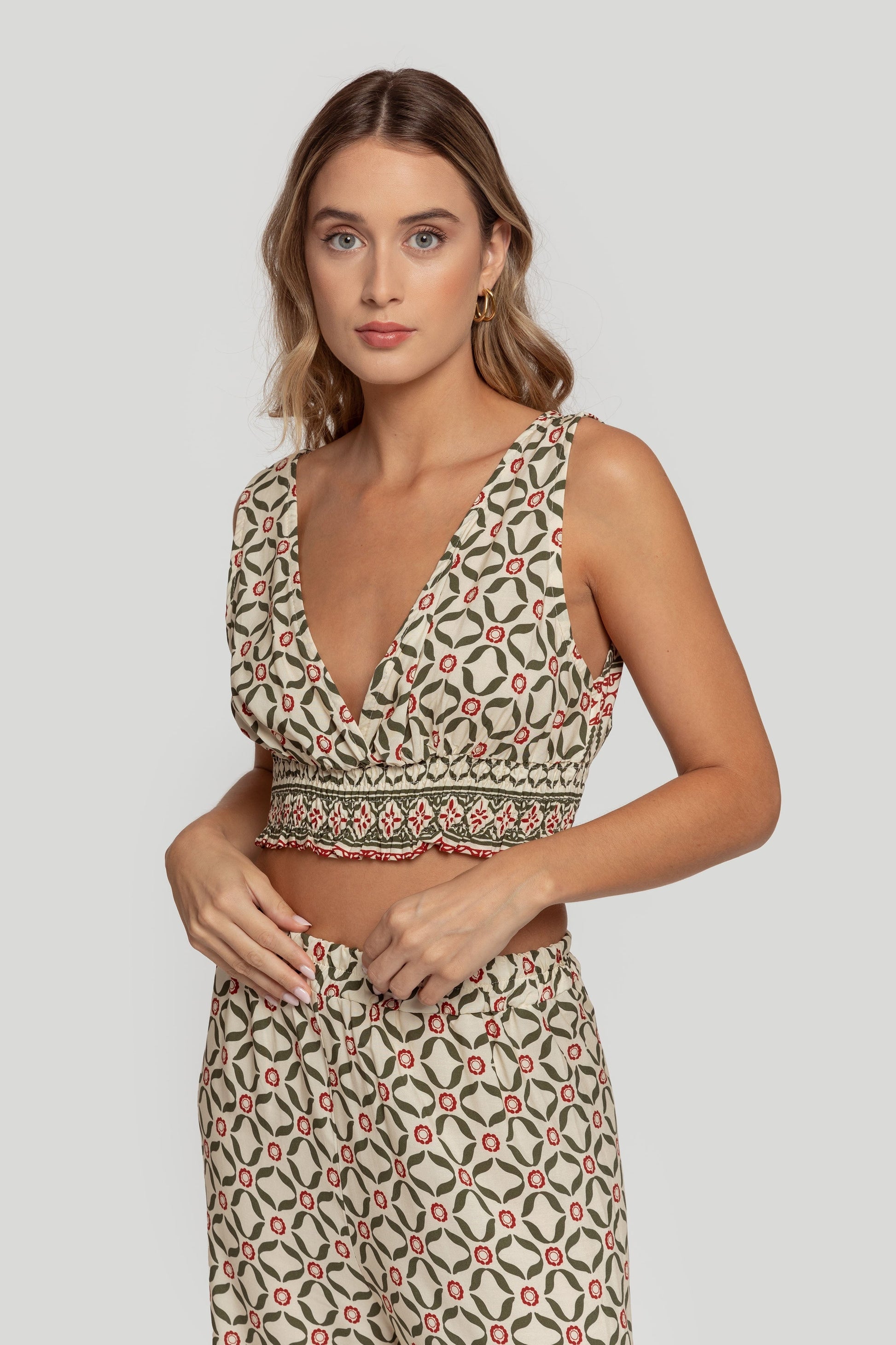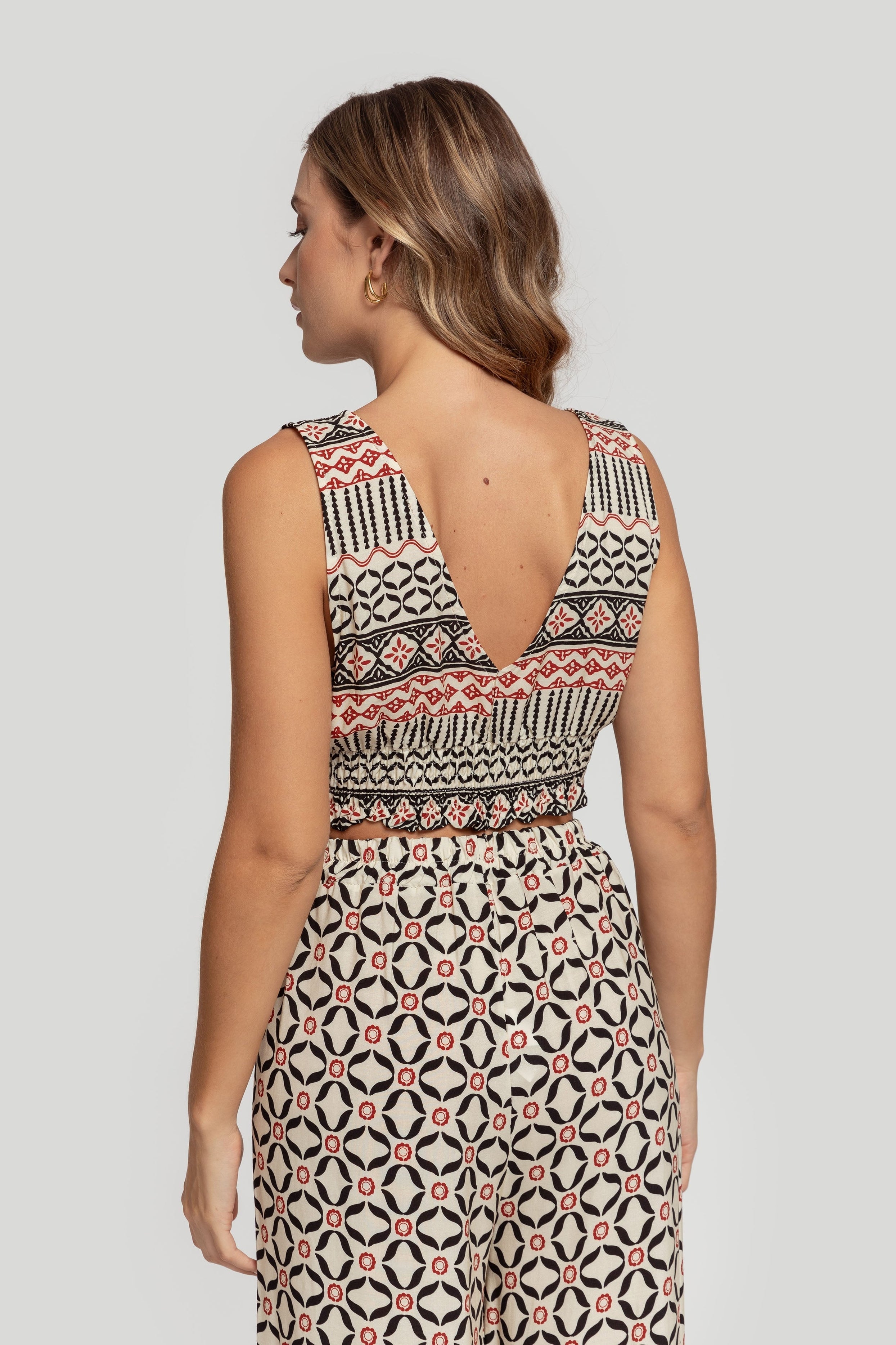 Crop top. Tejido ligero. Diseño estampado. Escote pico frontal y espalda. Bajo elástico. Talla modelo: S. Altura modelo 1,66 m.