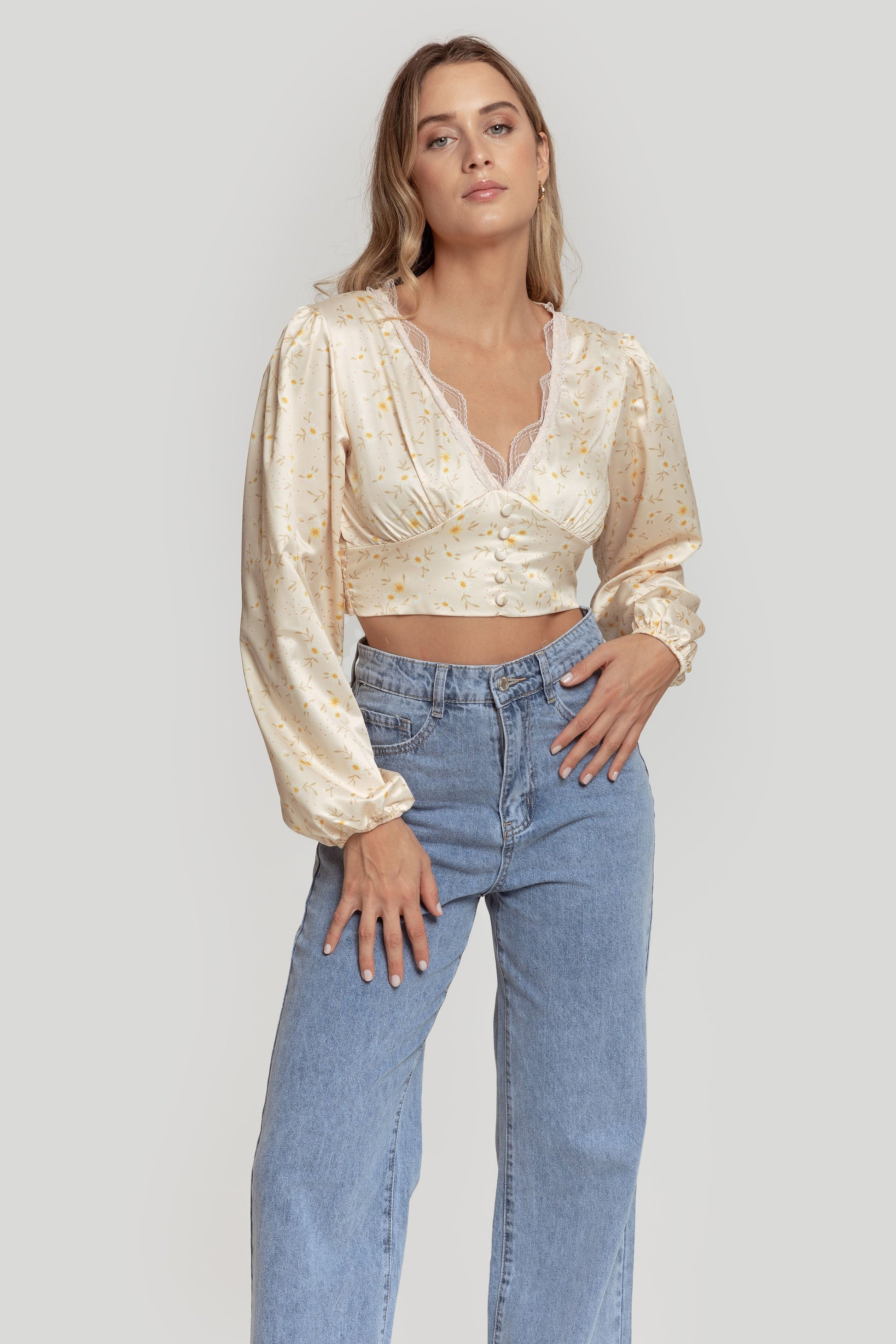 Tejido satinado. Diseño estampado. Diseño crop. Escote pico. Manga larga. Acabada en puño. Cuerpo frunce. Botones decorativos. Largo: 44 cm. Talla modelo: S. Altura modelo 1.65 m.
