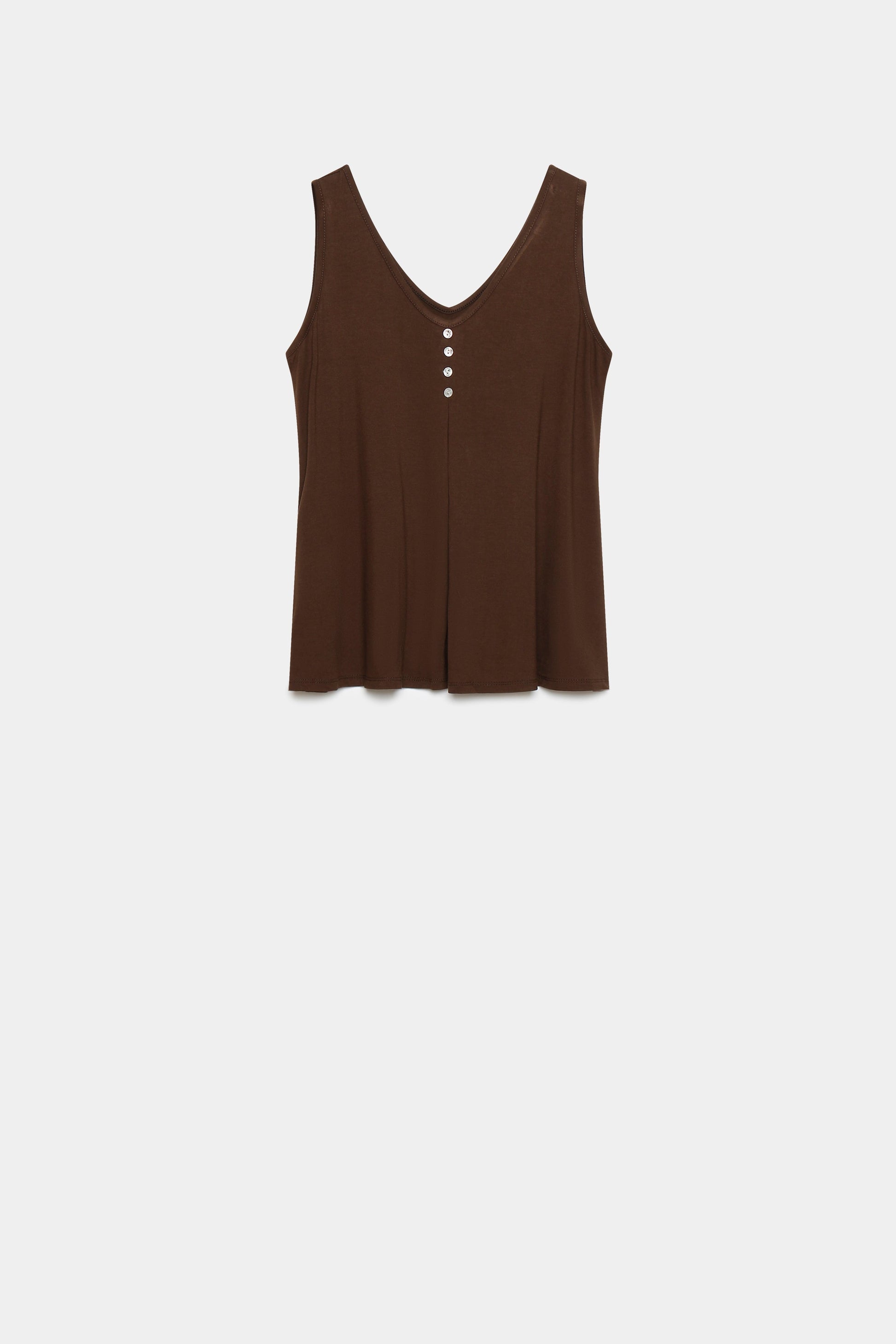 Tejido fluido. Escote pico. Tirantes anchos. Botones decorativos.