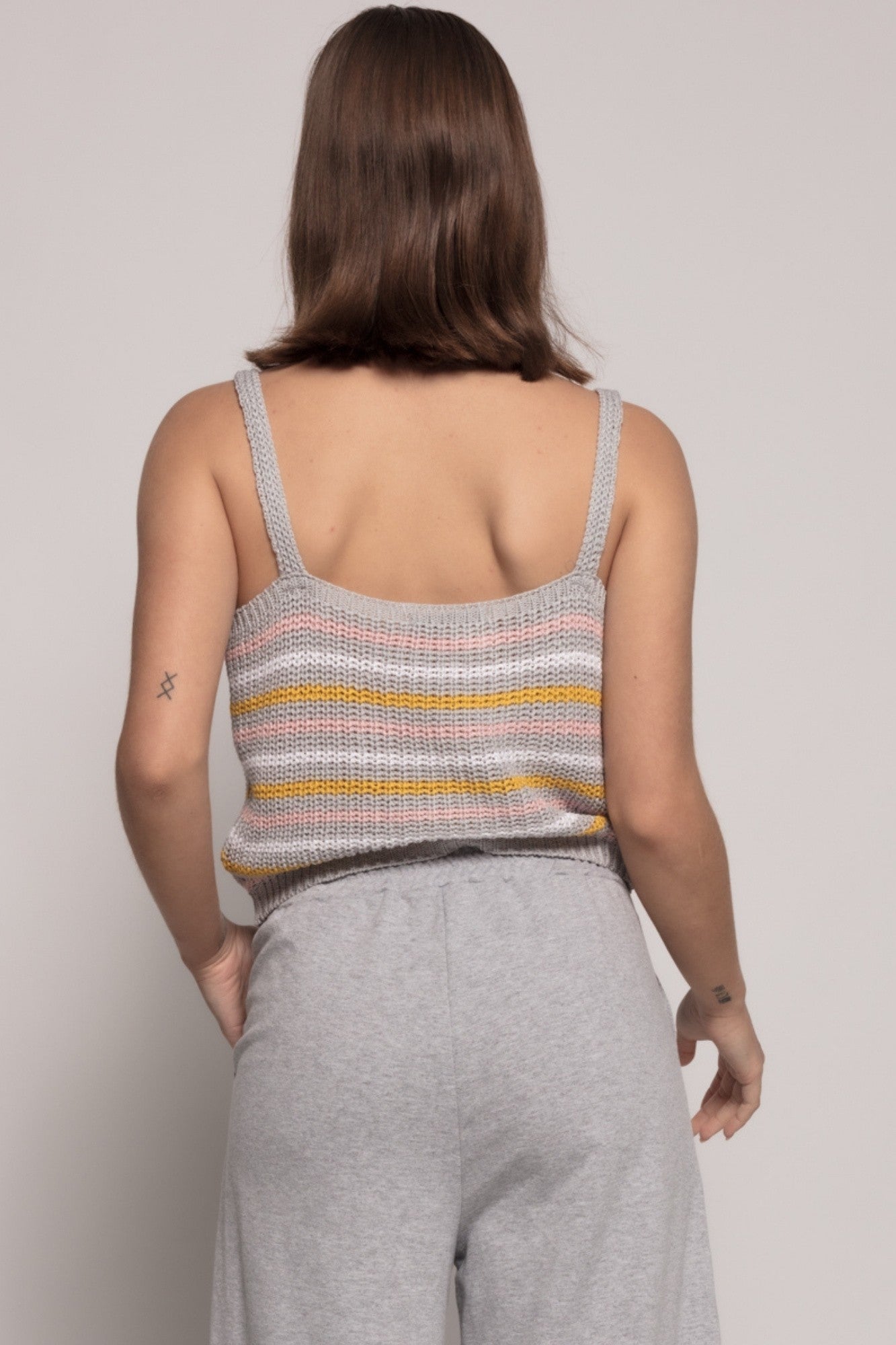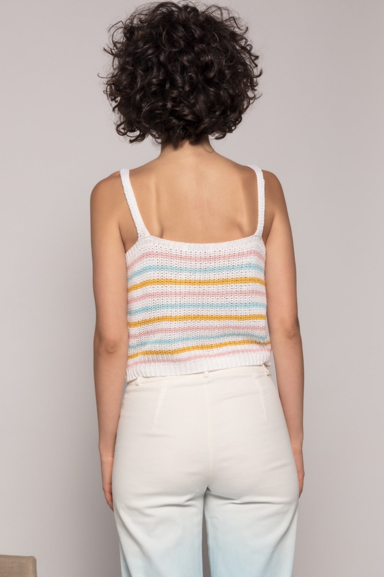 Top estampado rayas, diseño hilo, escote pico y tirantes finos. Talla modelo: S. Altura modelo: 1,65 m. Composición:
