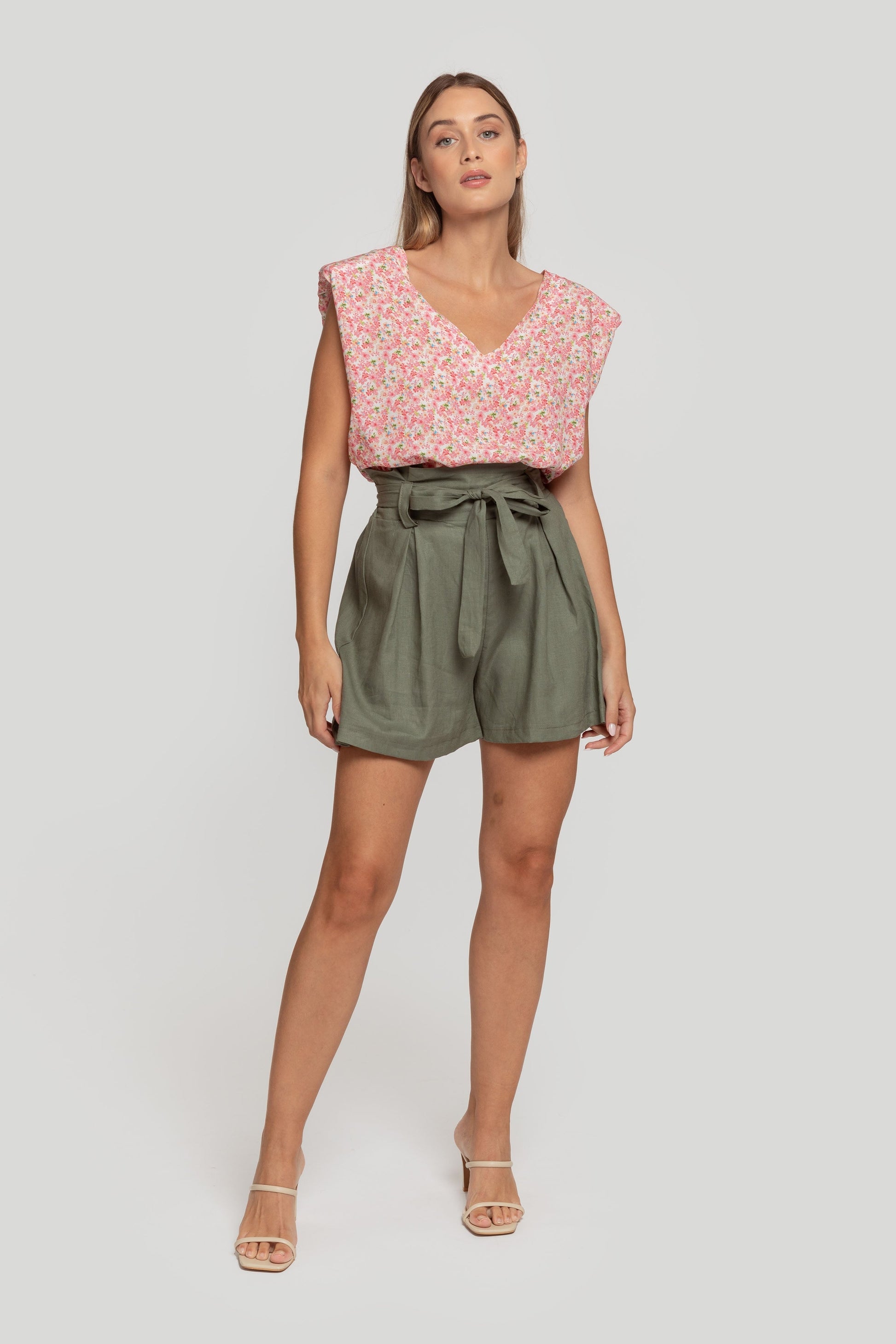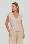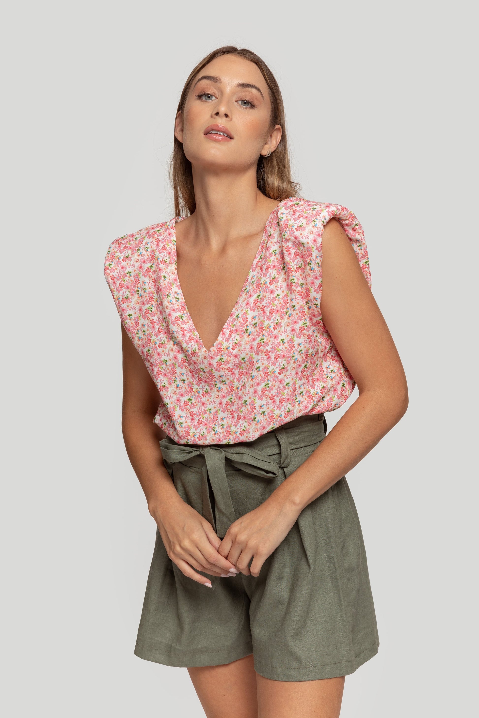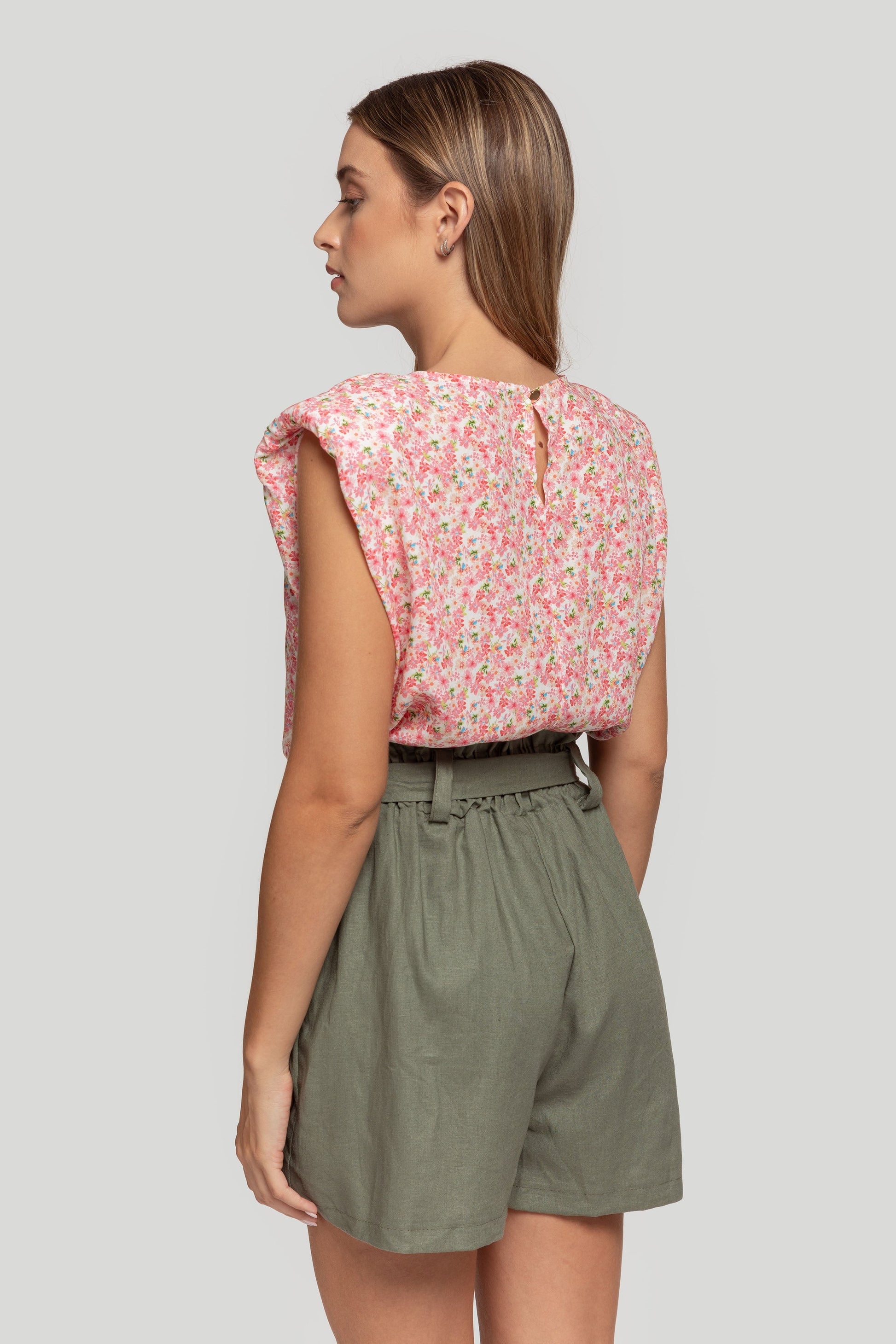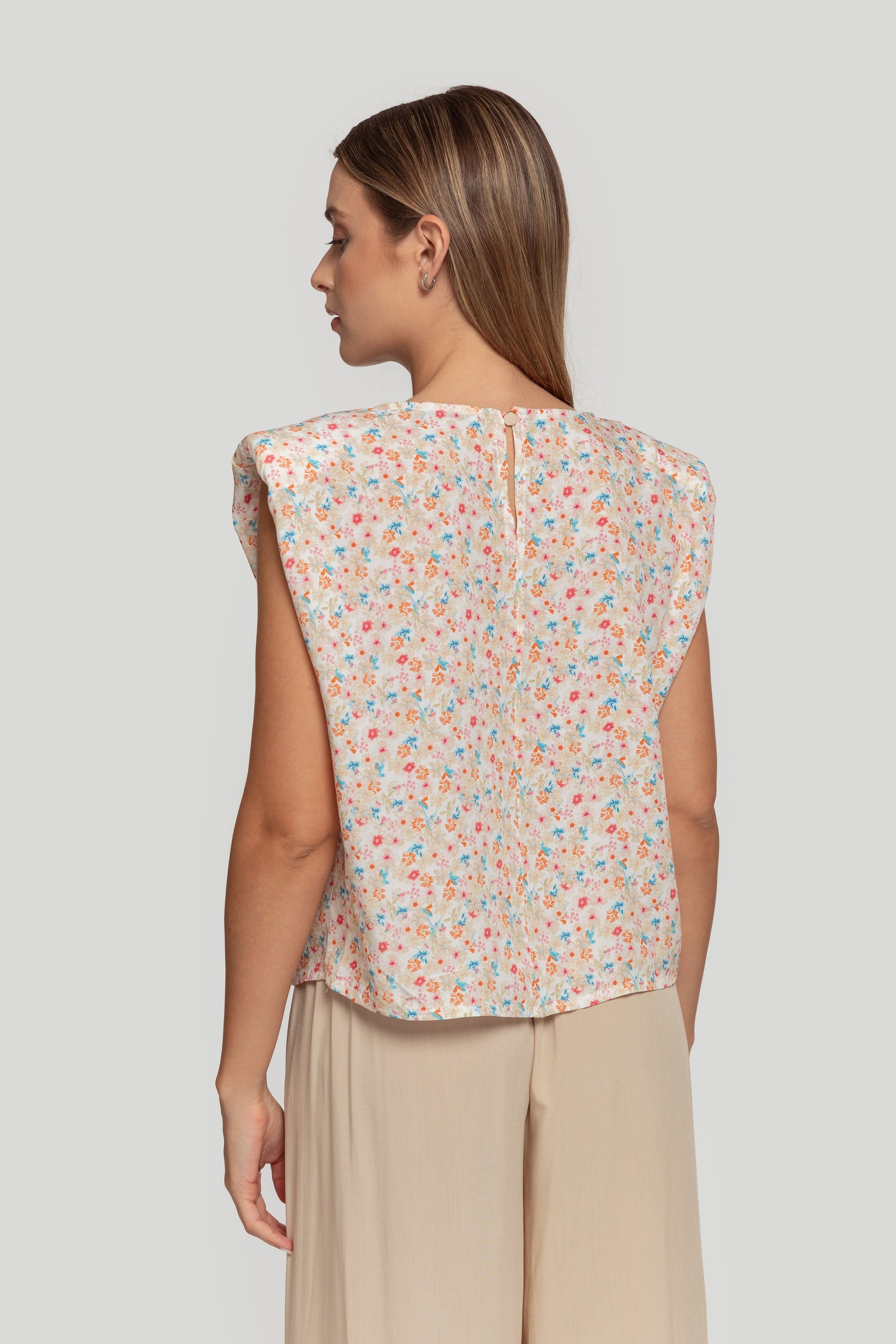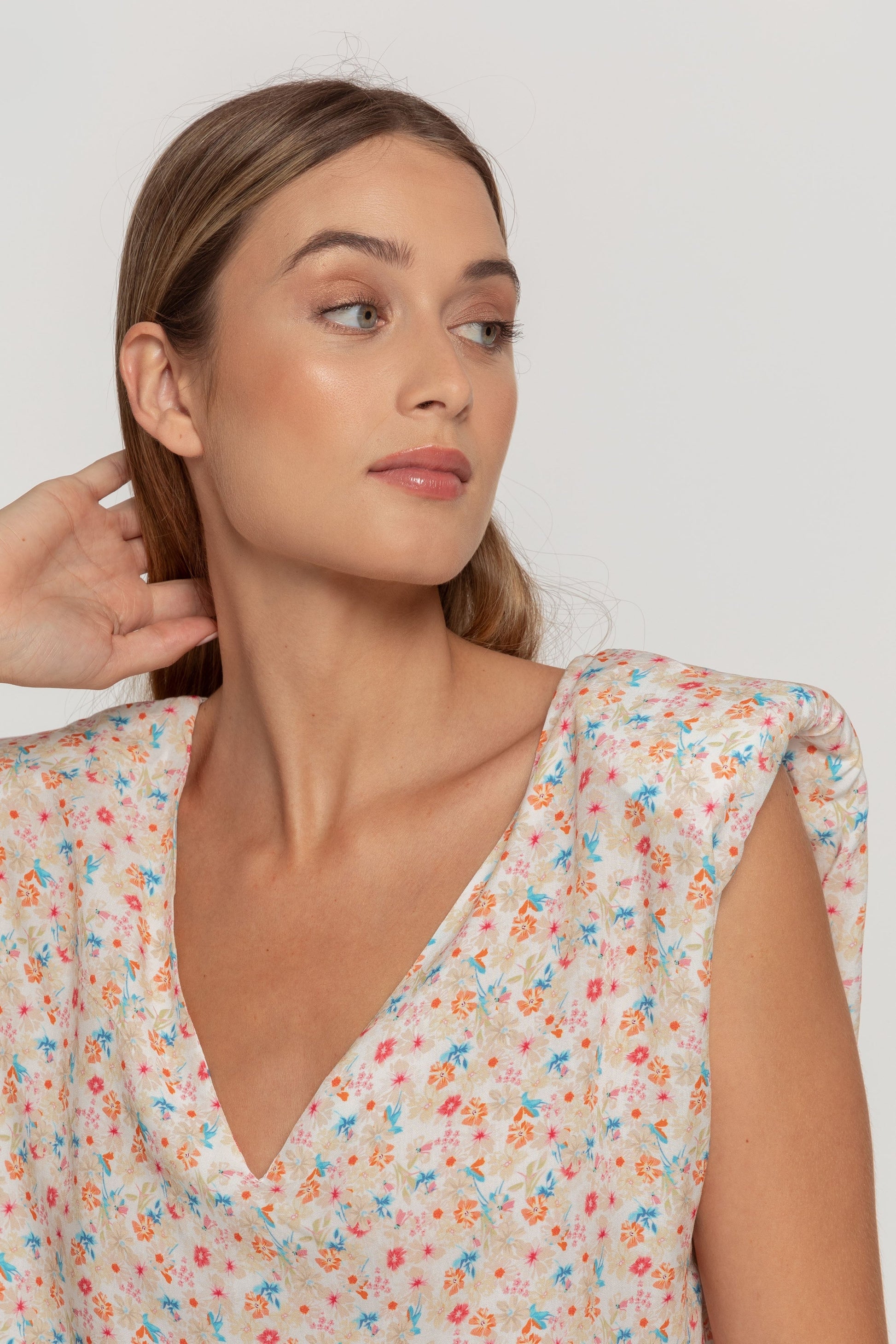 Tejido ligero. Diseño corto. Diseño estampado. Diseño recto. Diseño amplio. Escote pico. Manga sisa. Hombreras. Abotonado en la nuca. Detalle abertura espalada. Talla modelo: S Altura modelo 1,66 m.