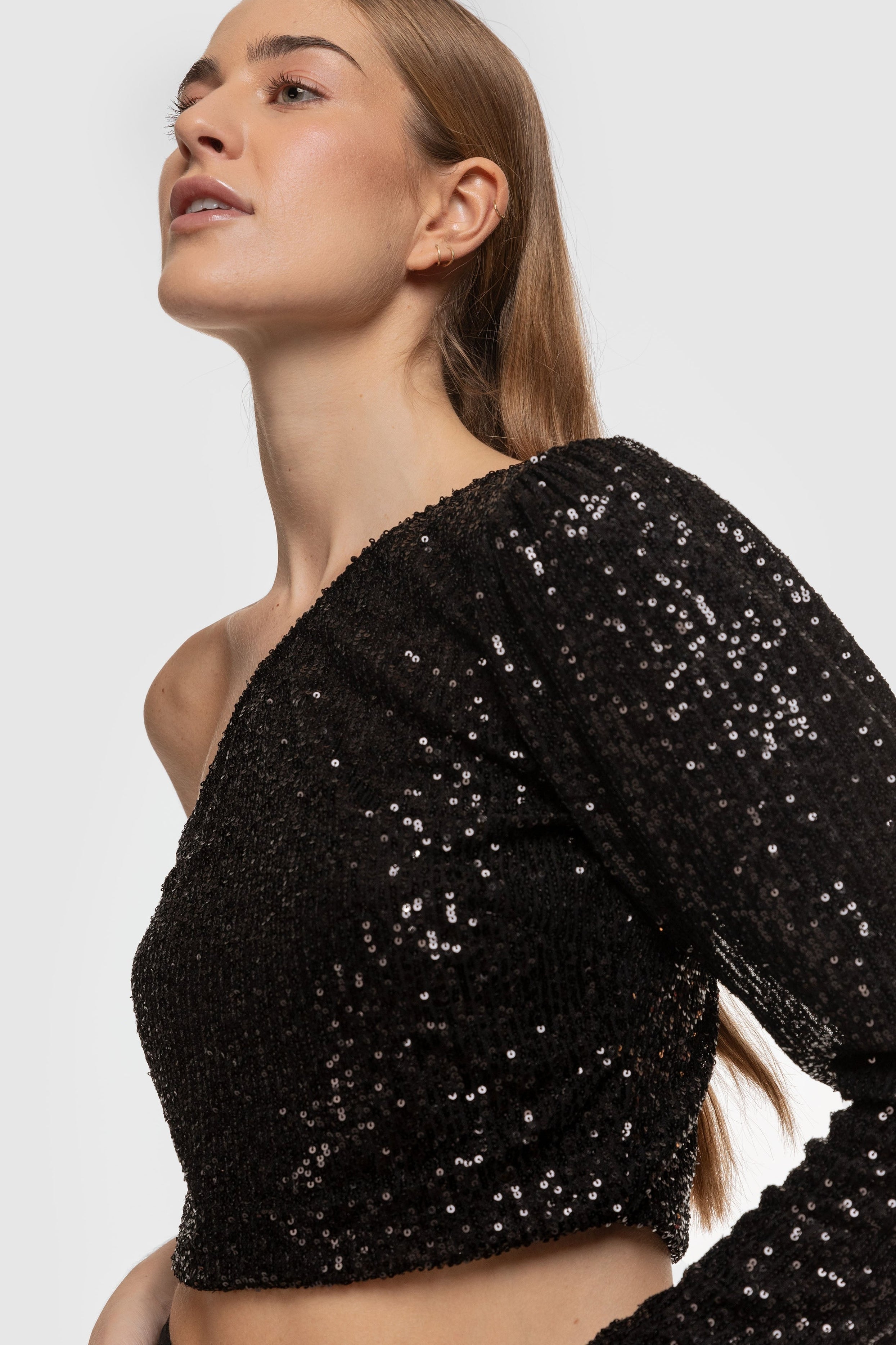 Top de lentejuelas. De un solo hombro. Forrado. Talla modelo: S. Altura modelo: 1,66 m.