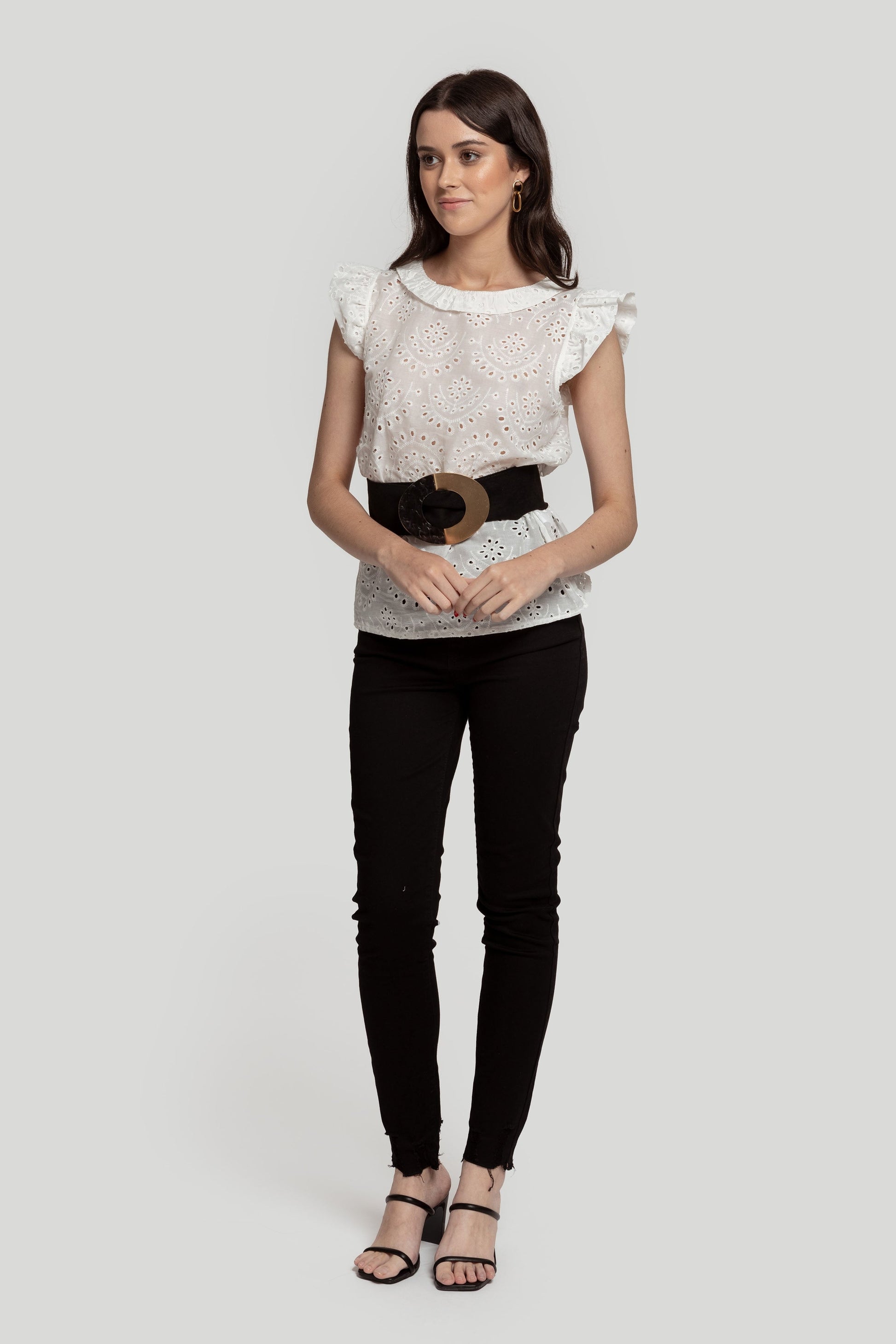 Tejido ligero. Tejido perforado. Tejido de algodón. Diseño recto. Cuello redondo. Manga sisa. Manga acabado volante. Abertura en la espalda. Abotonada en la nuca. Talla modelo: S. Altura modelo 1,67 m.
