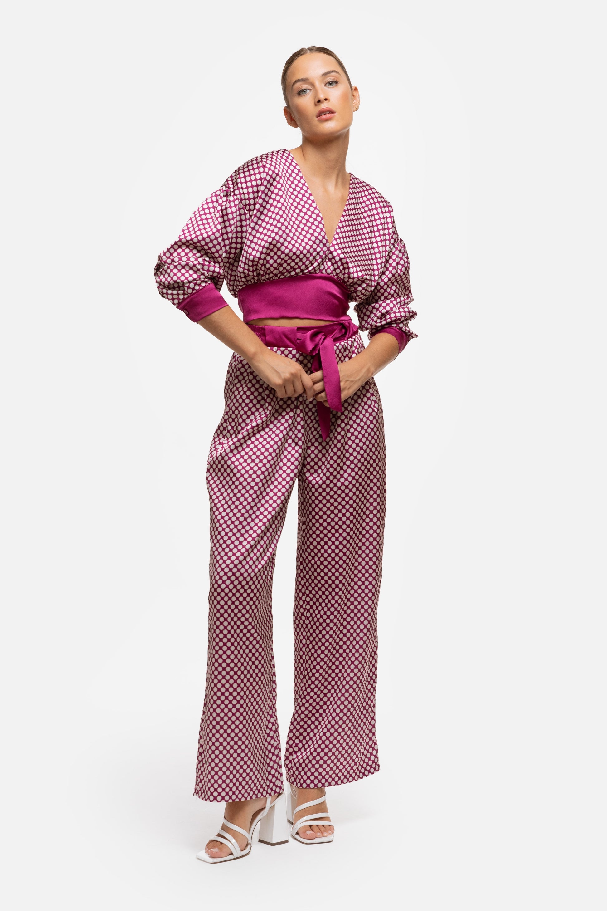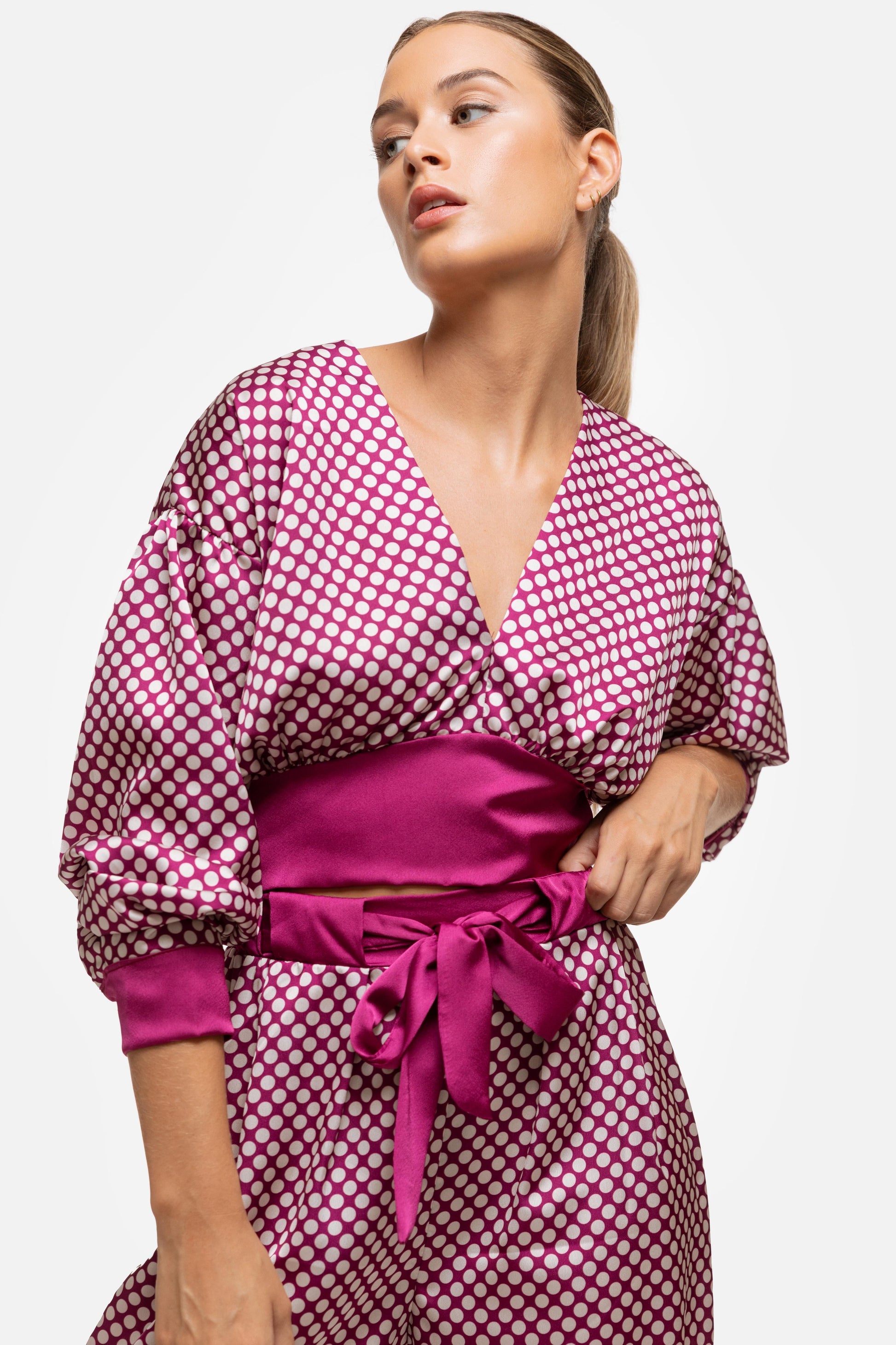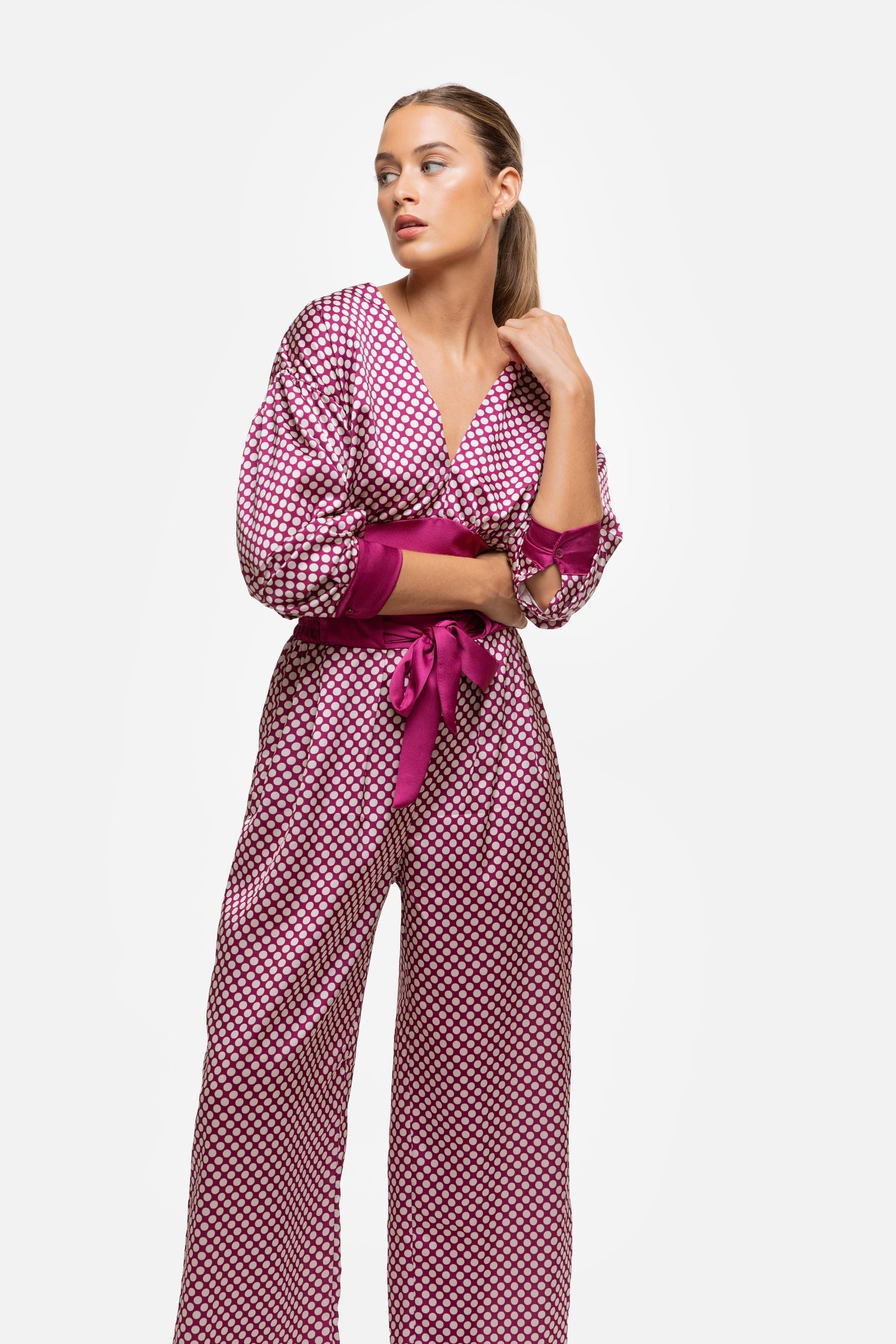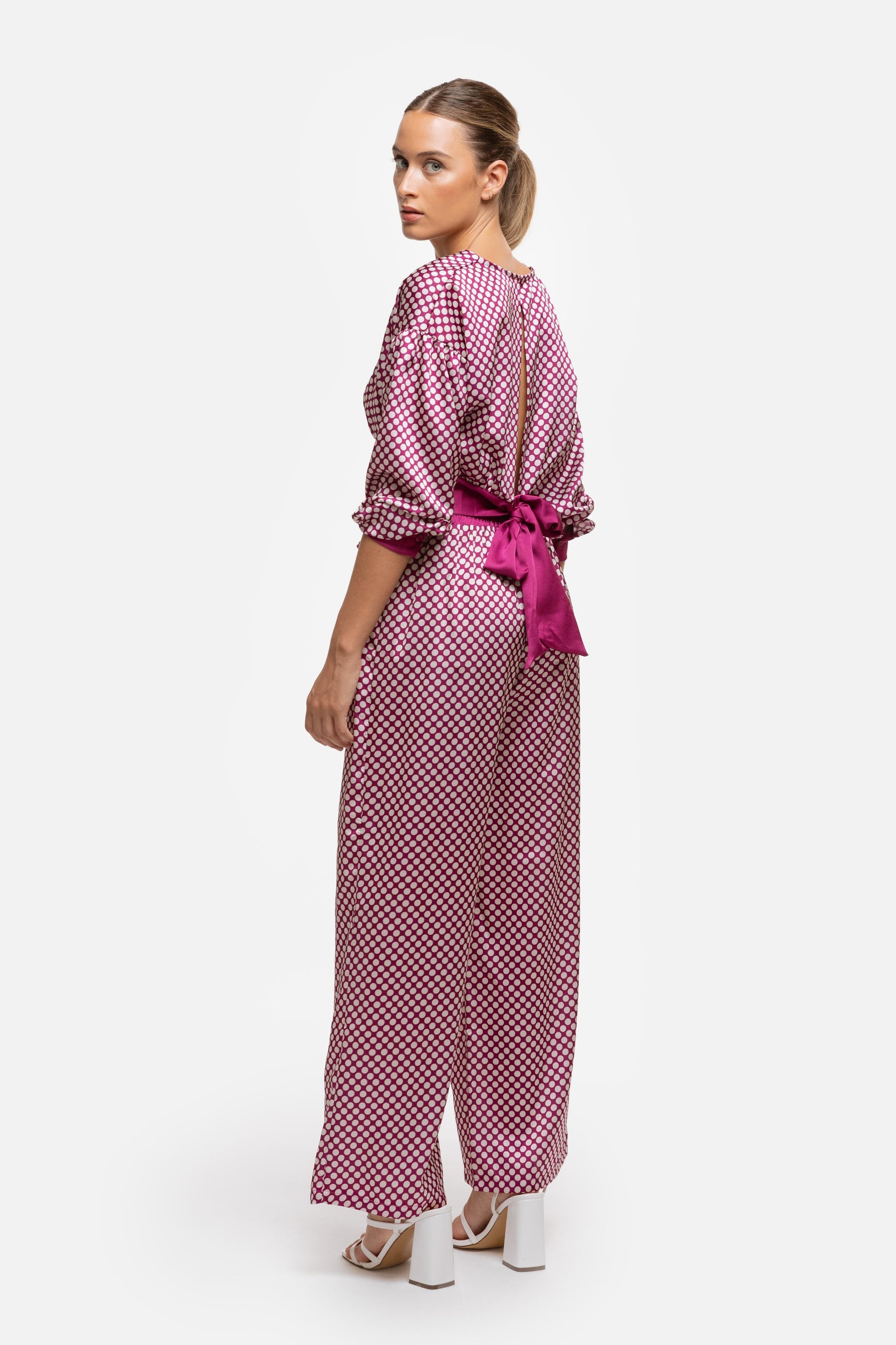 Top en tejido satinado. Estampado lunatres. Cuello pico. Manga larga abotonada. Botón en la nuca. Lazada en la parte de atrás. Talla modelo: S. Altura modelo: 1,66 m.