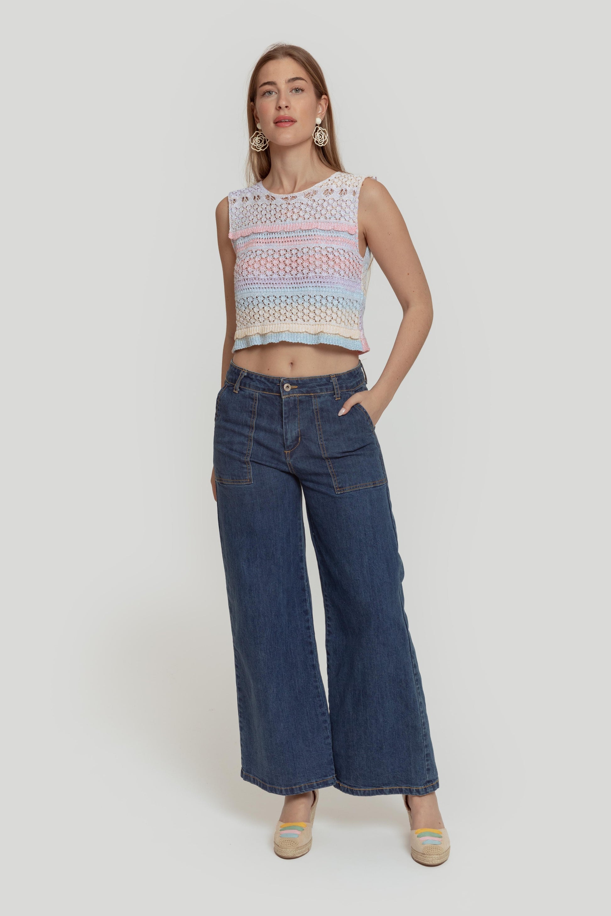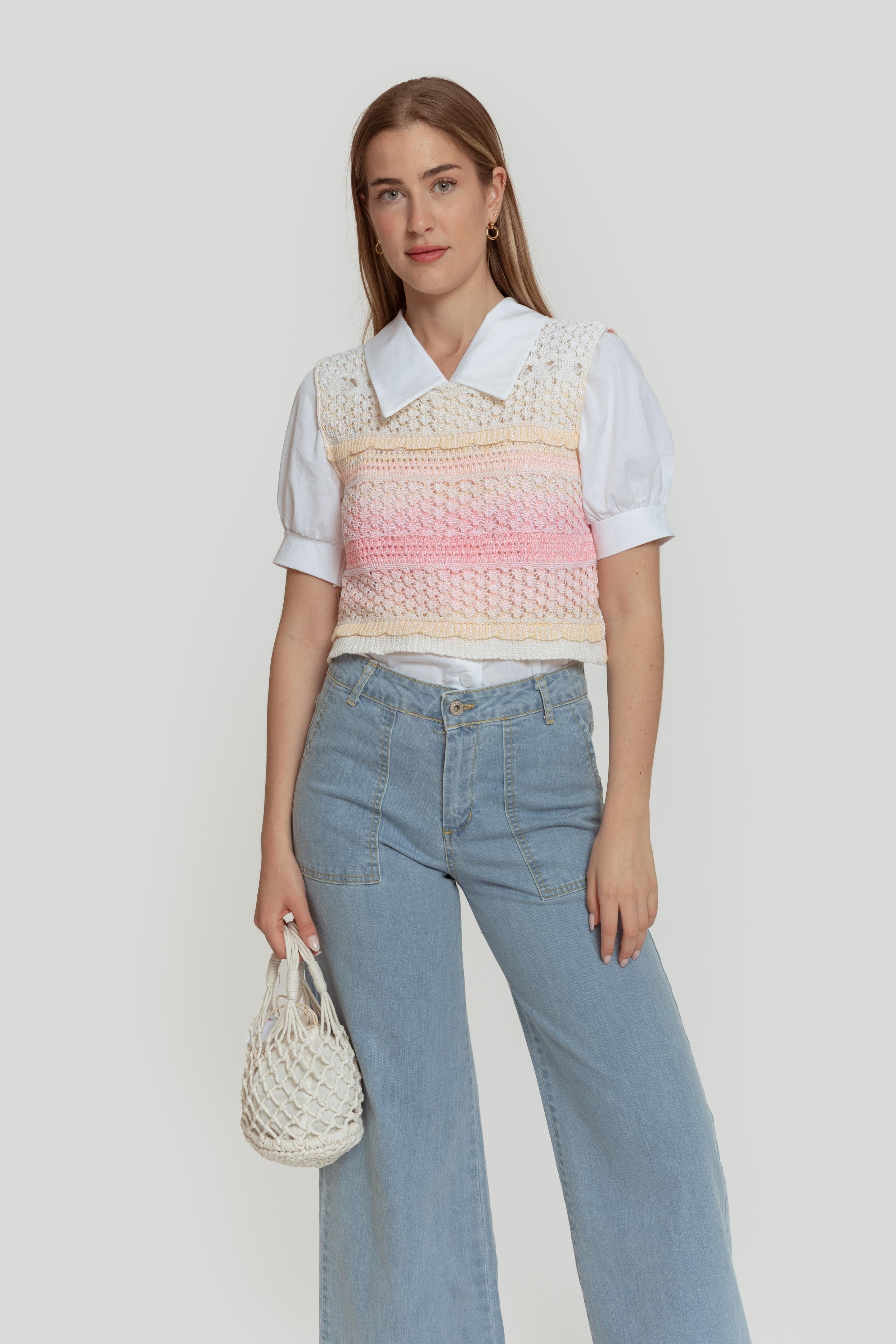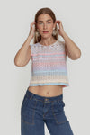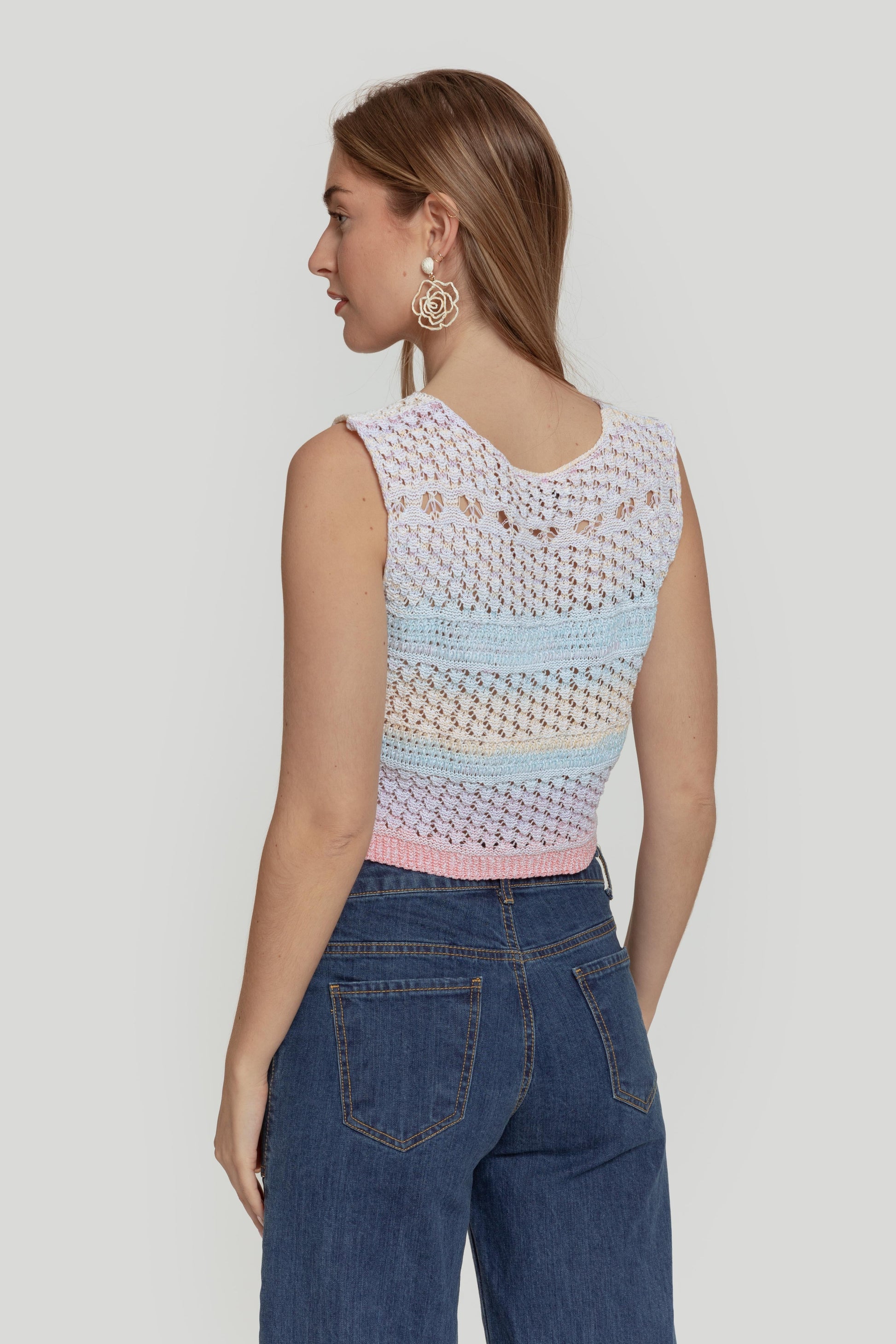 Tejido de punto. Tejido mezcla de algodón. Tejido calado. Diseño trenzado. Diseño estampado multicolor. Diseño recto. Cuello U. Manga sisa. Terminaciones en rib. Talla modelo: S. Altura modelo 1,65 m.