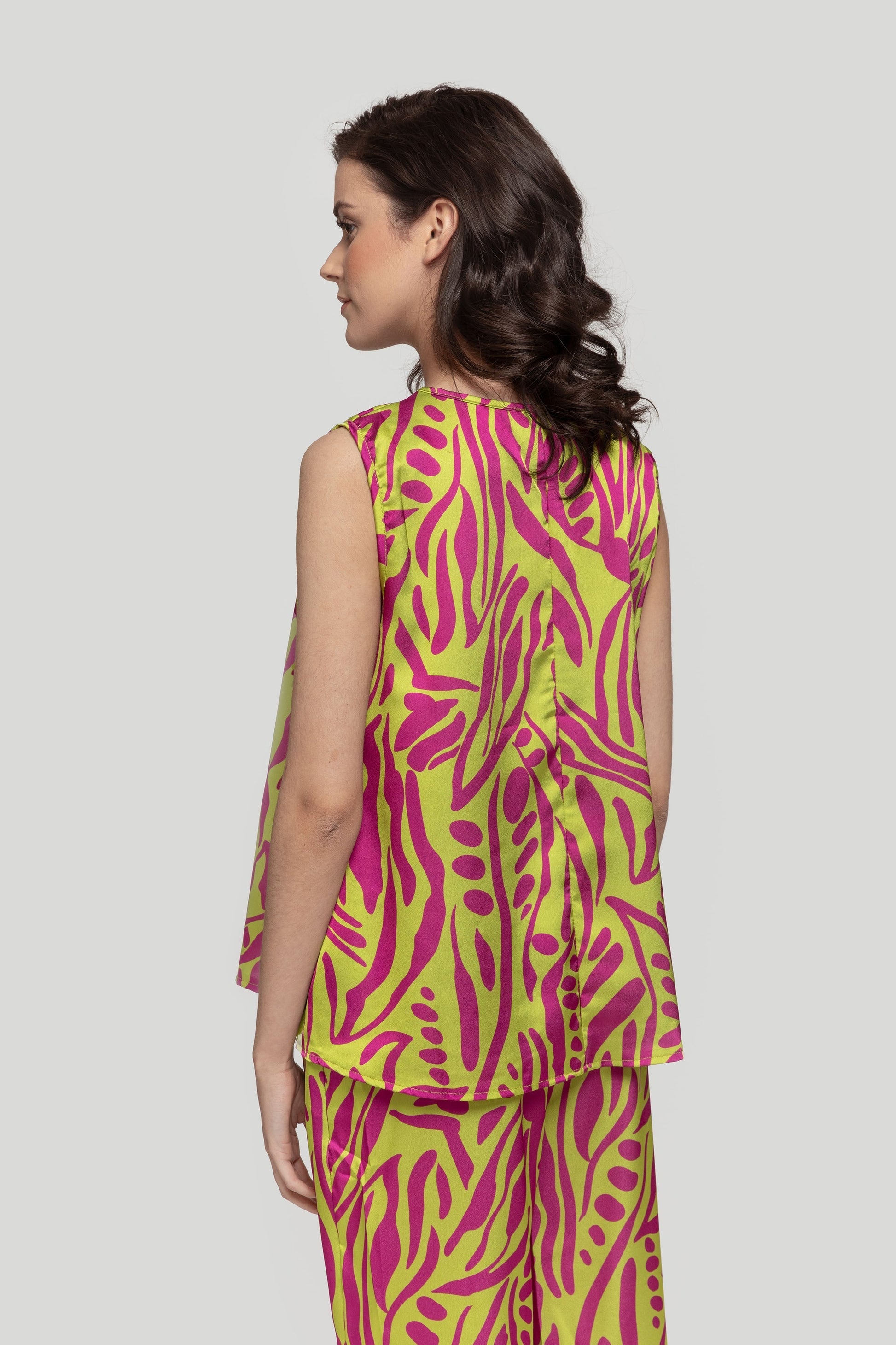 Top amplio. Tejido satinado. Diseño estampado. Cuello pico. Manga sisa. Talla modelo: S. Altura modelo 1,67 m.