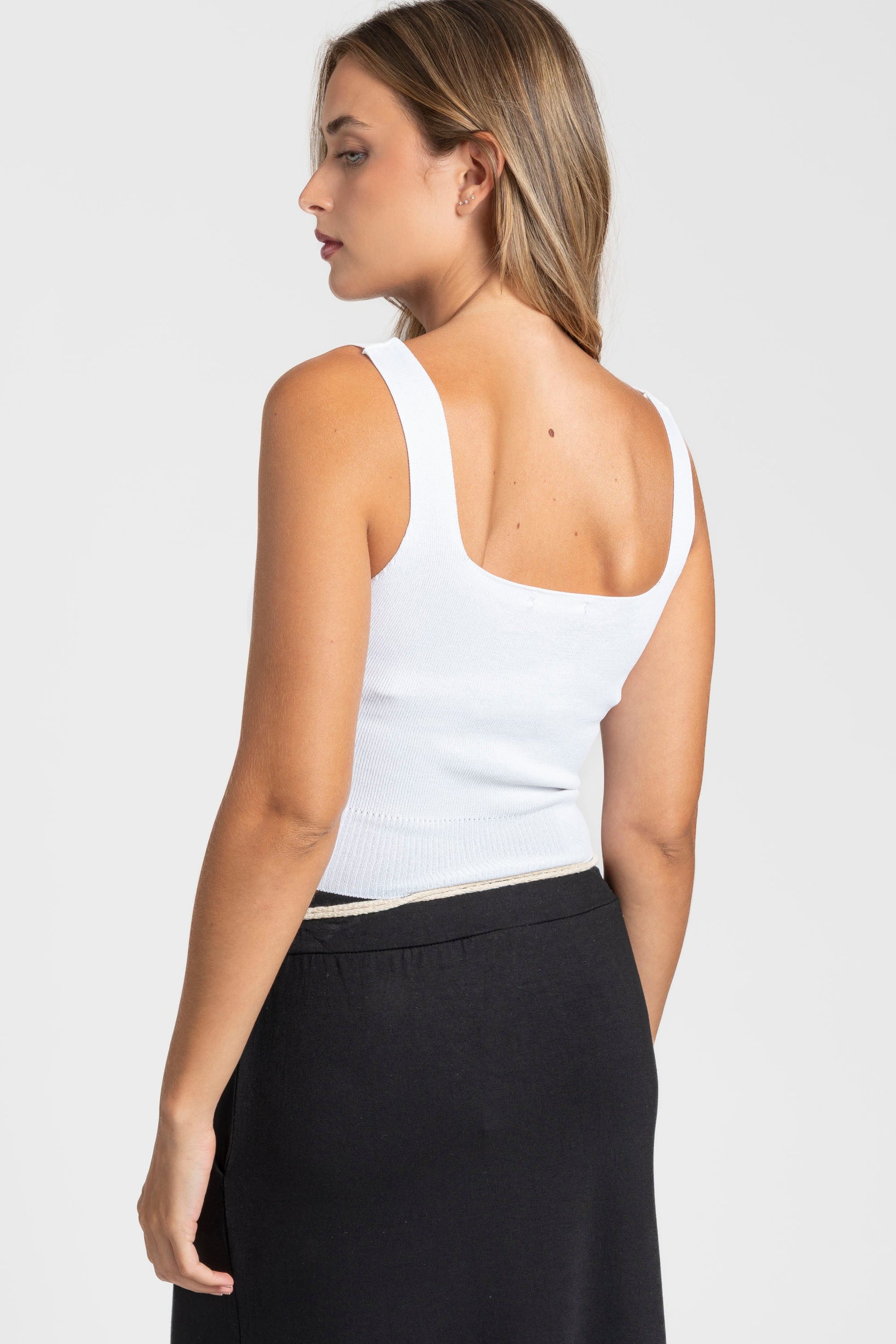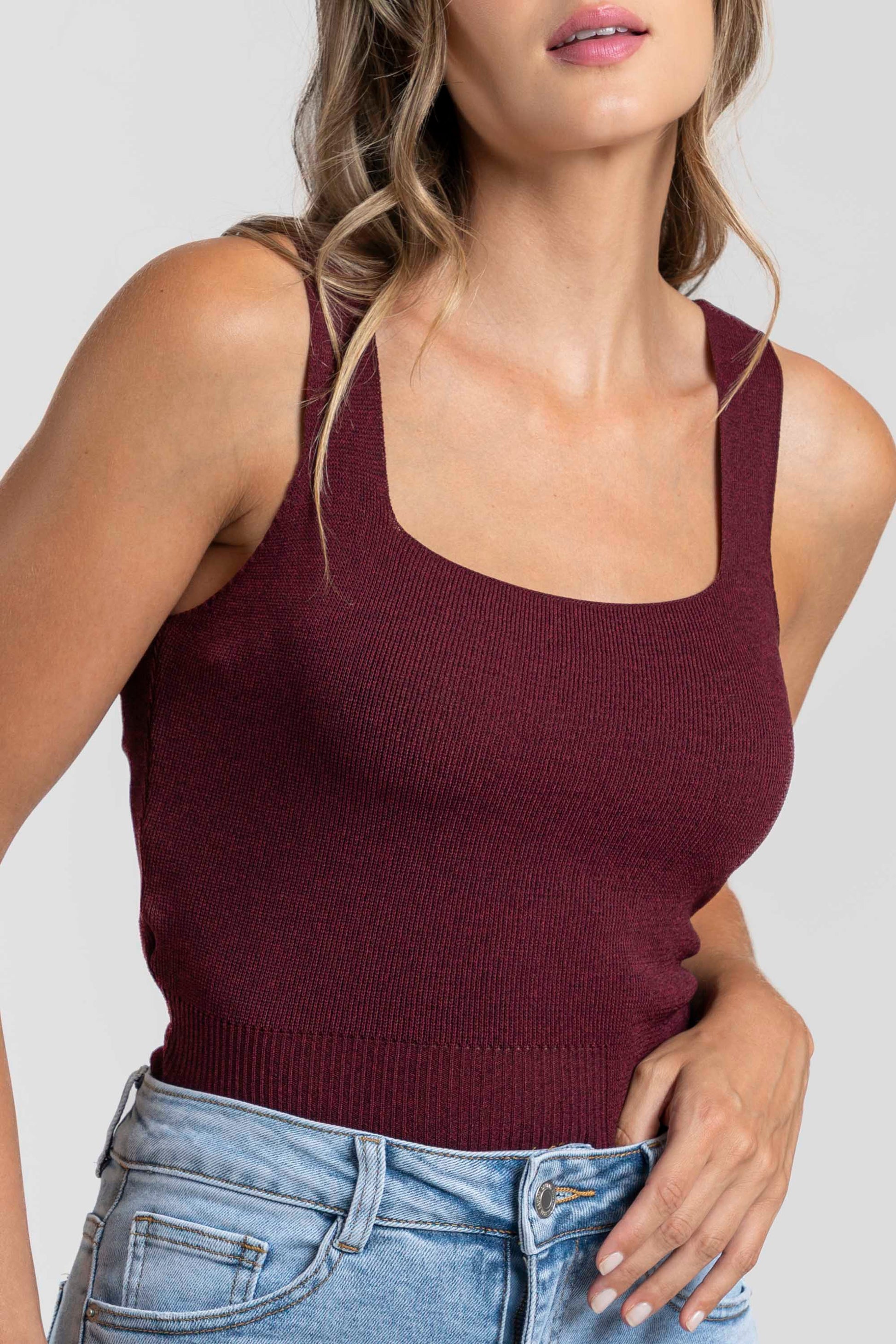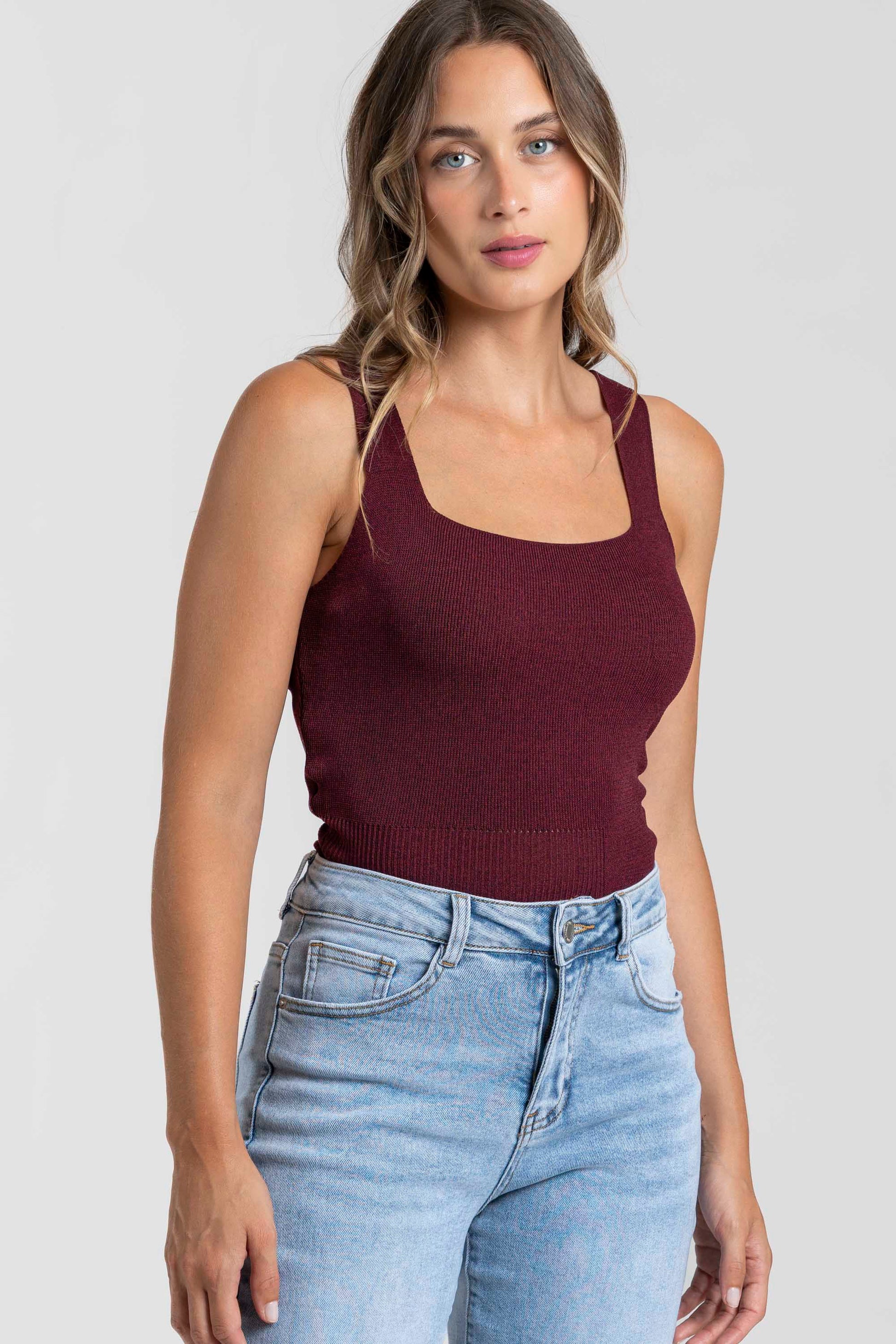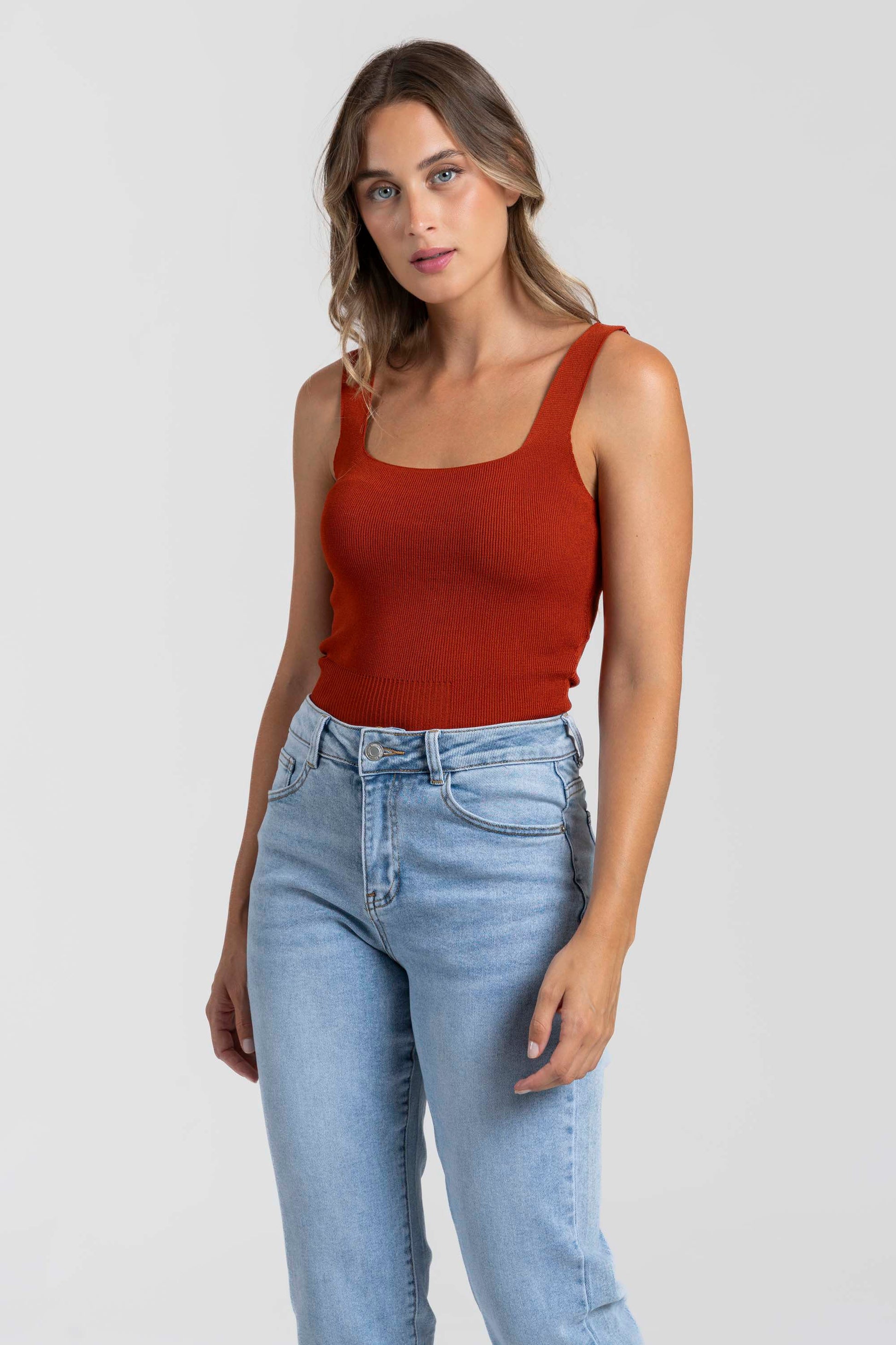 Tejido punto. Tirantes anchos. Escote cuadrado. Talla modelo: S. Altura modelo 1,66 m.
