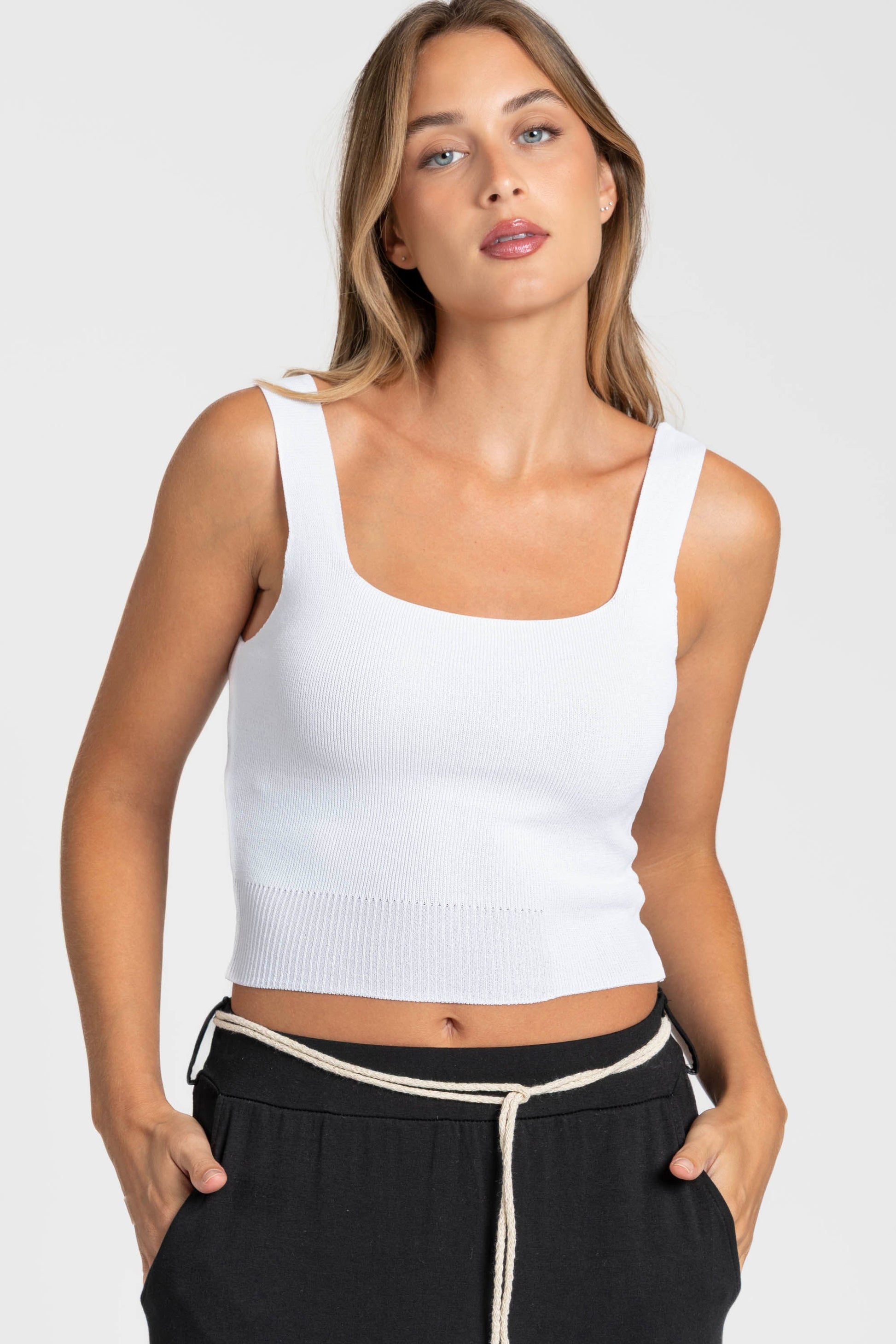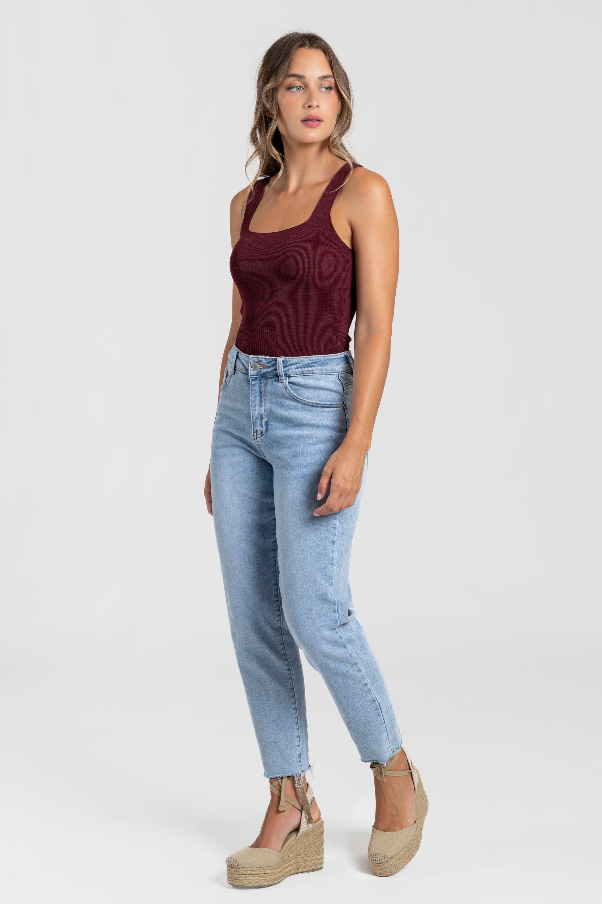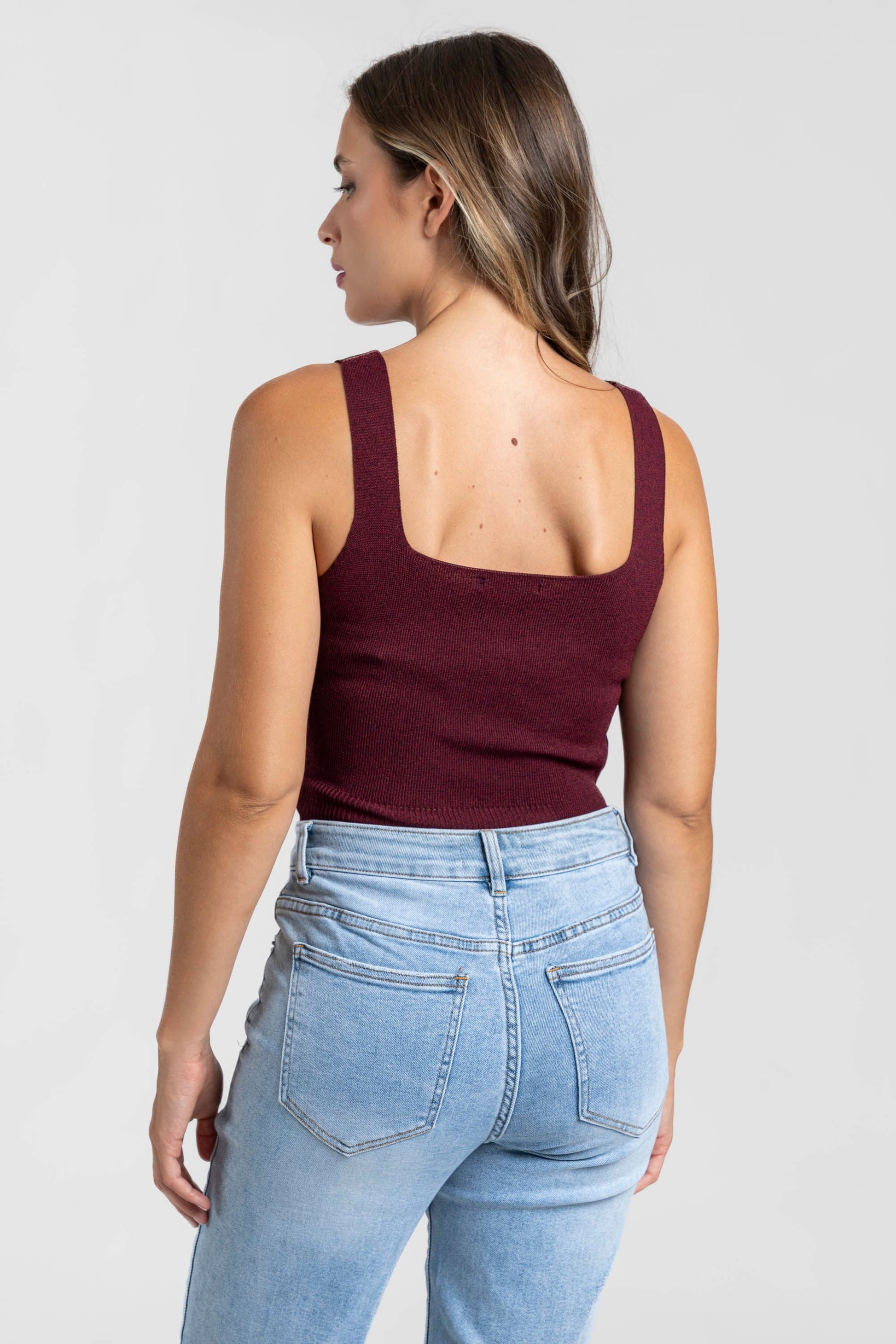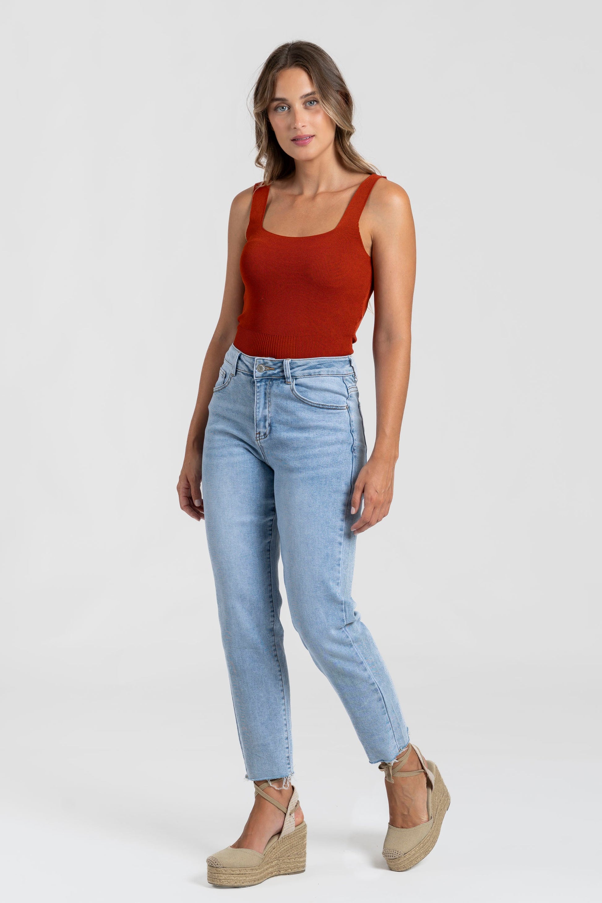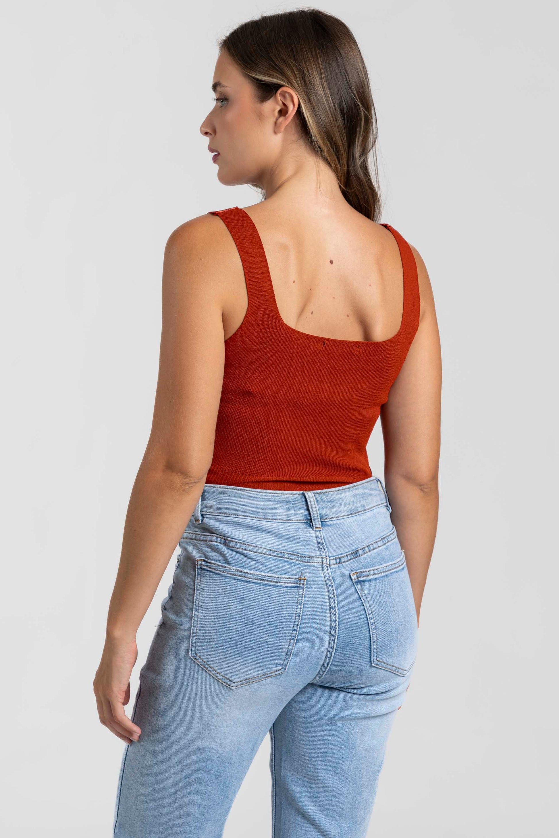 Tejido punto. Tirantes anchos. Escote cuadrado. Talla modelo: S. Altura modelo 1,66 m.
