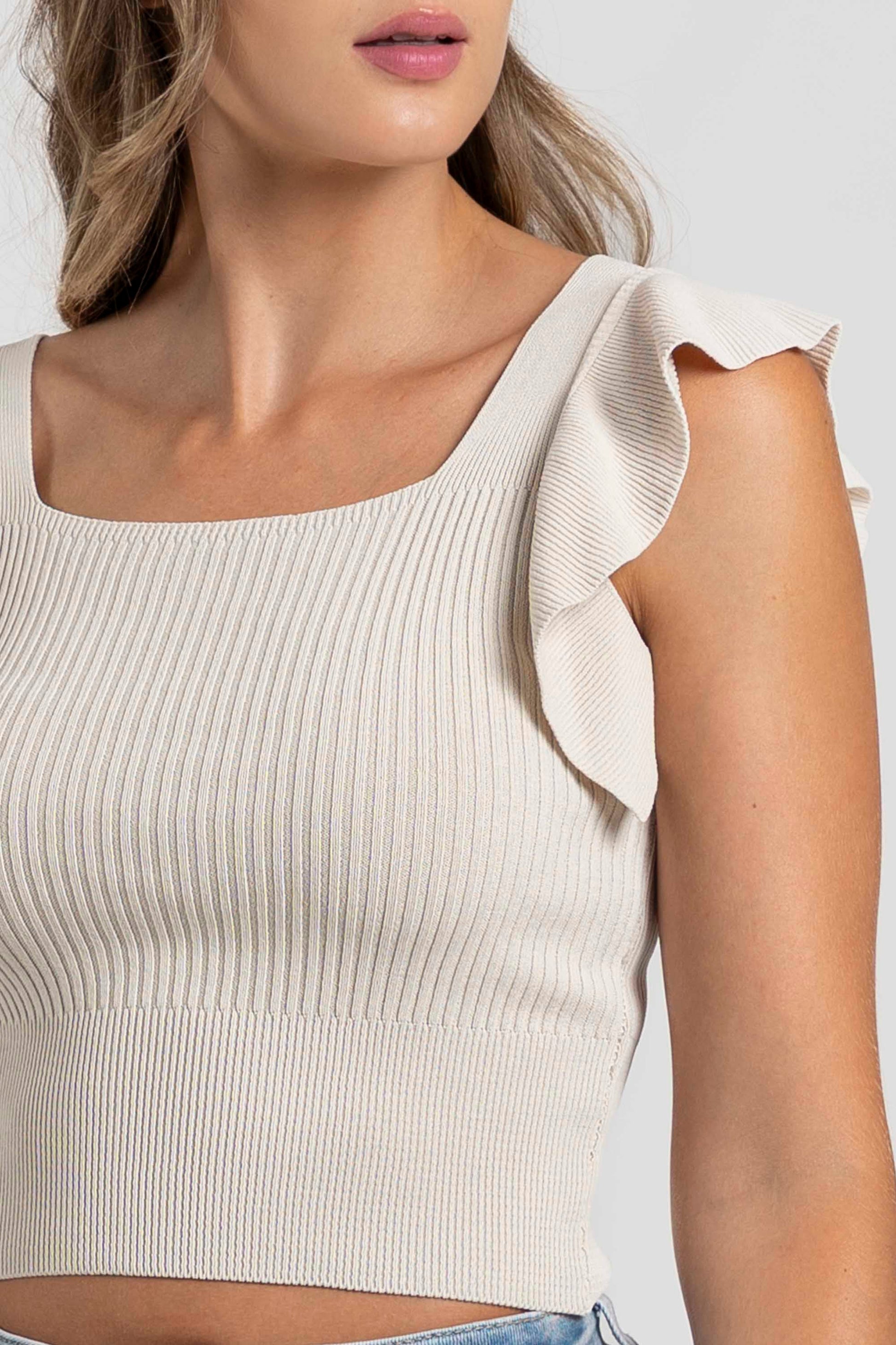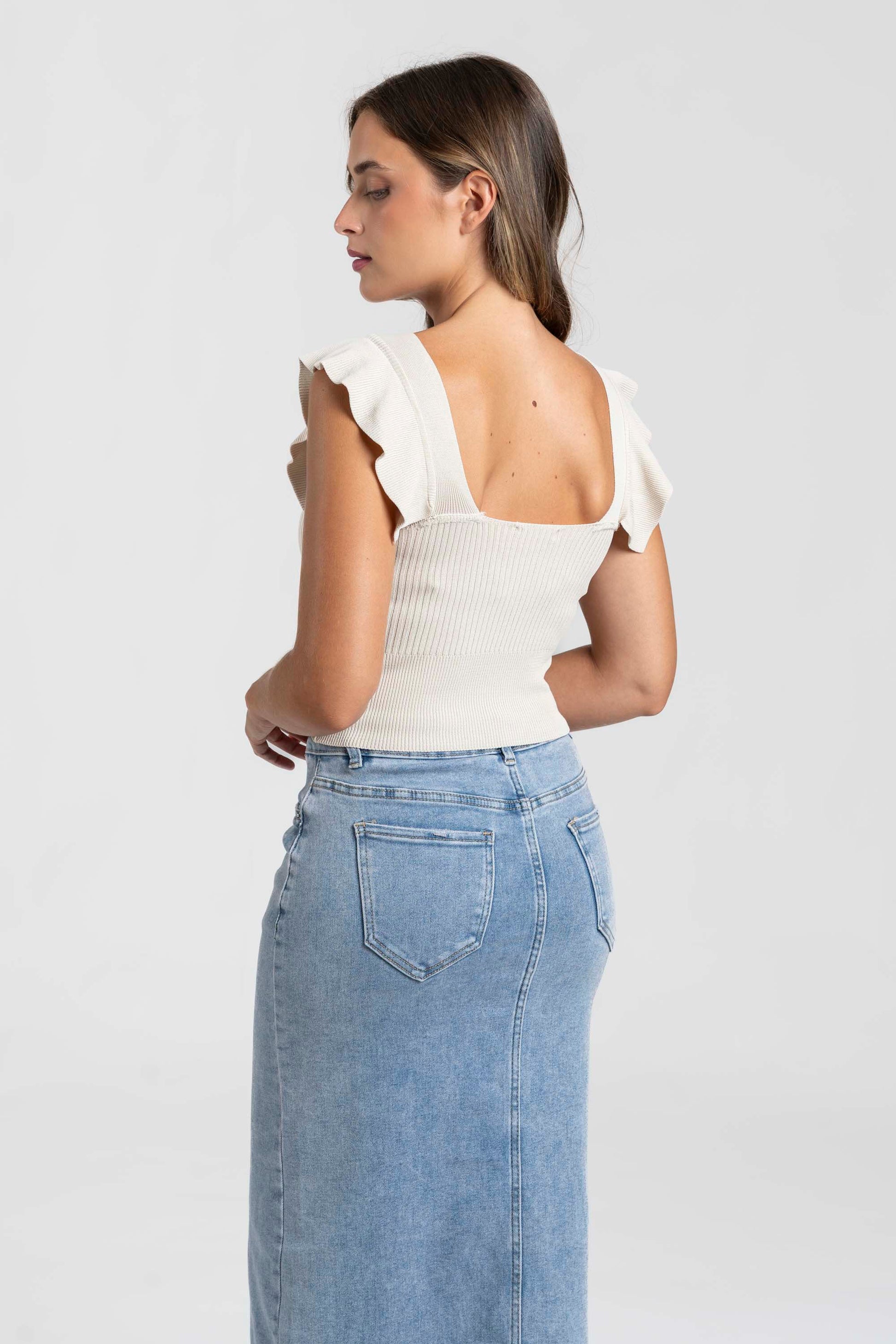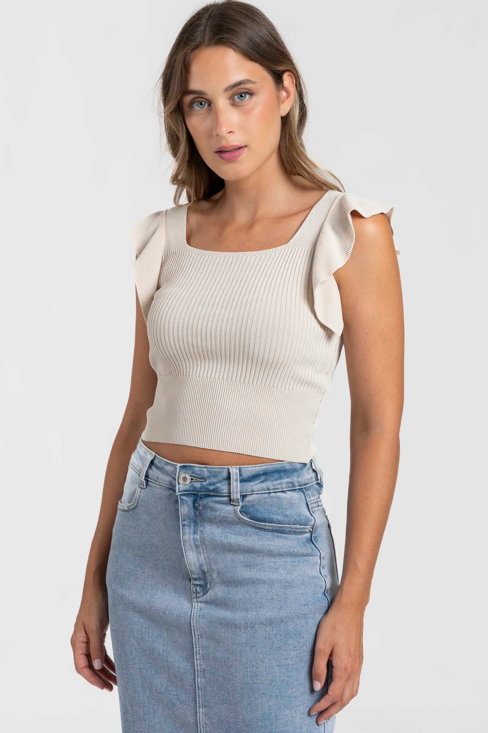 Tejido punto. Tirantes anchos con volantes. Escote cuadrado. Talla modelo: XS. Altura modelo 1,66 m.